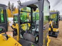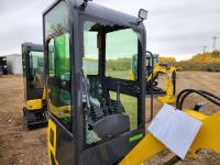 Enclosed cab, gas engine, 12 inch bucket, manual thumb, 2 Ft 6 inch stick, backfill blade, 7 inch rubber tracks