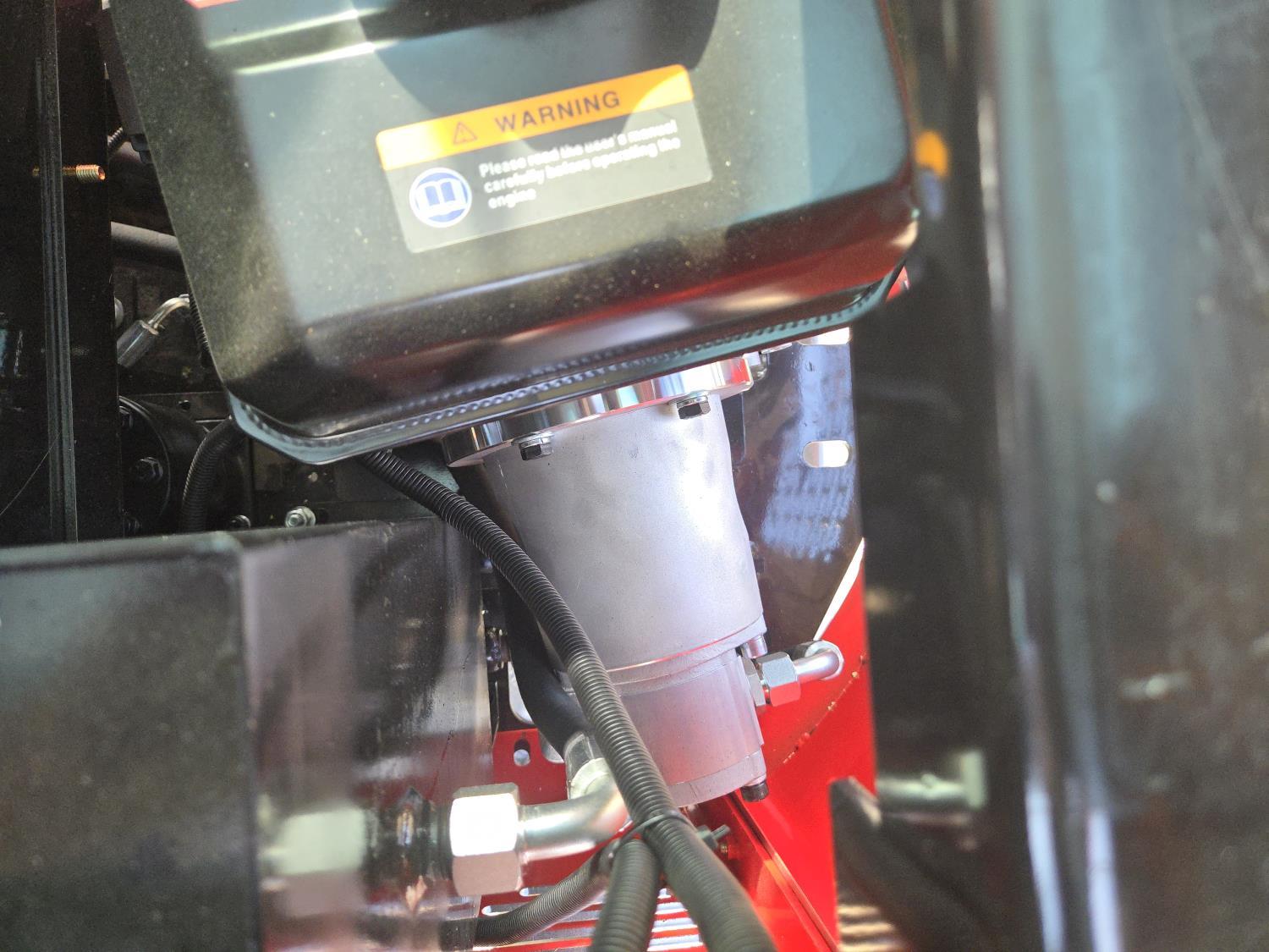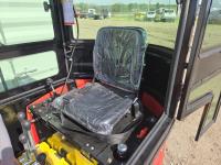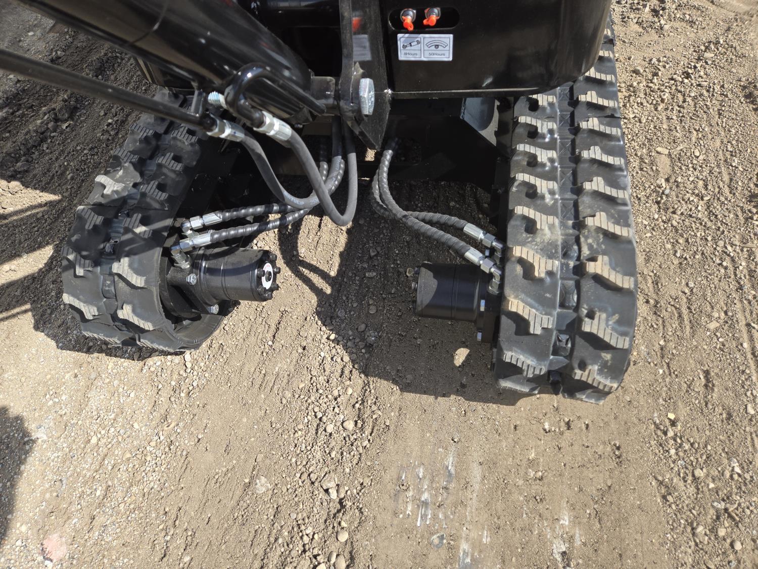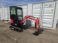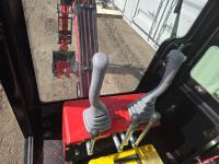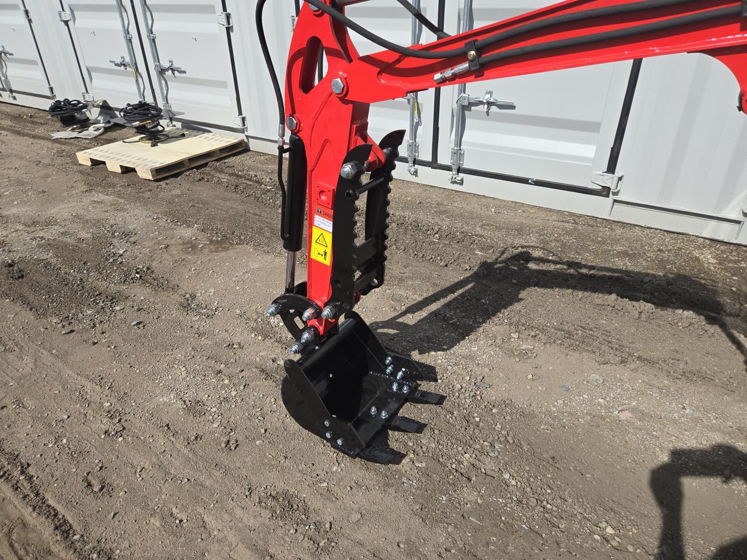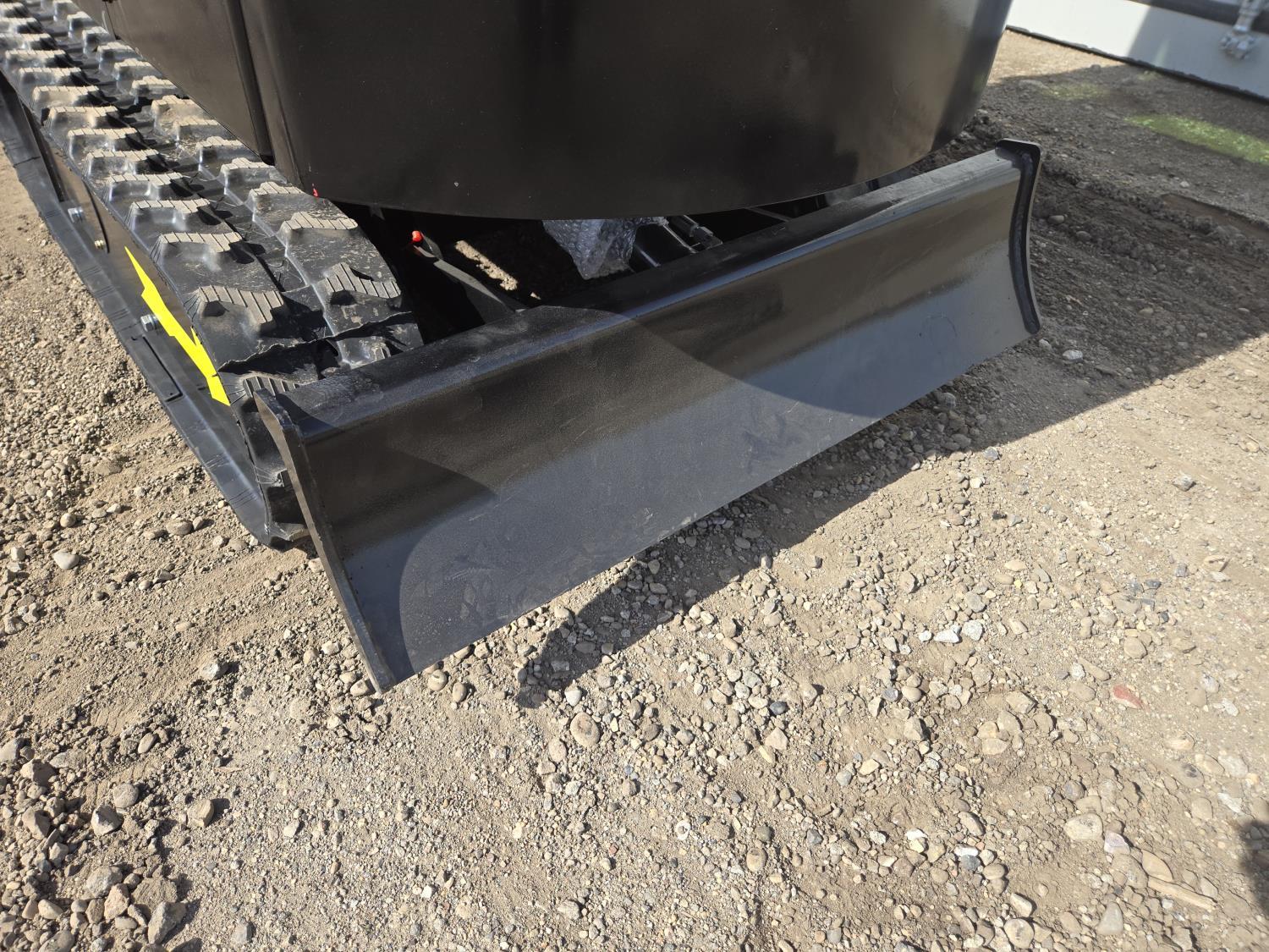Enclosed cab, gas engine, 16 inch dig bucket, manual thumb, 2 Ft 6 inch stick, backfill blade, 7 inch rubber tracks