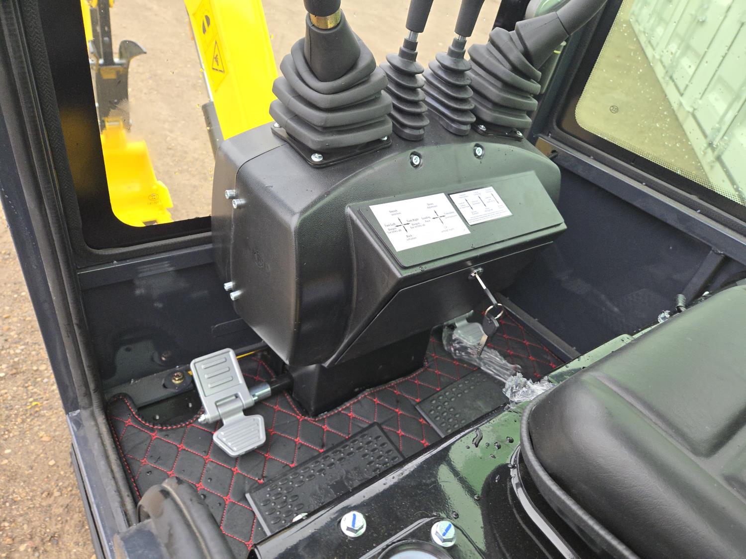 Enclosed cab, gas engine, 12 inch bucket, manual thumb, 2 Ft 6 inch stick, backfill blade, 7 inch rubber tracks