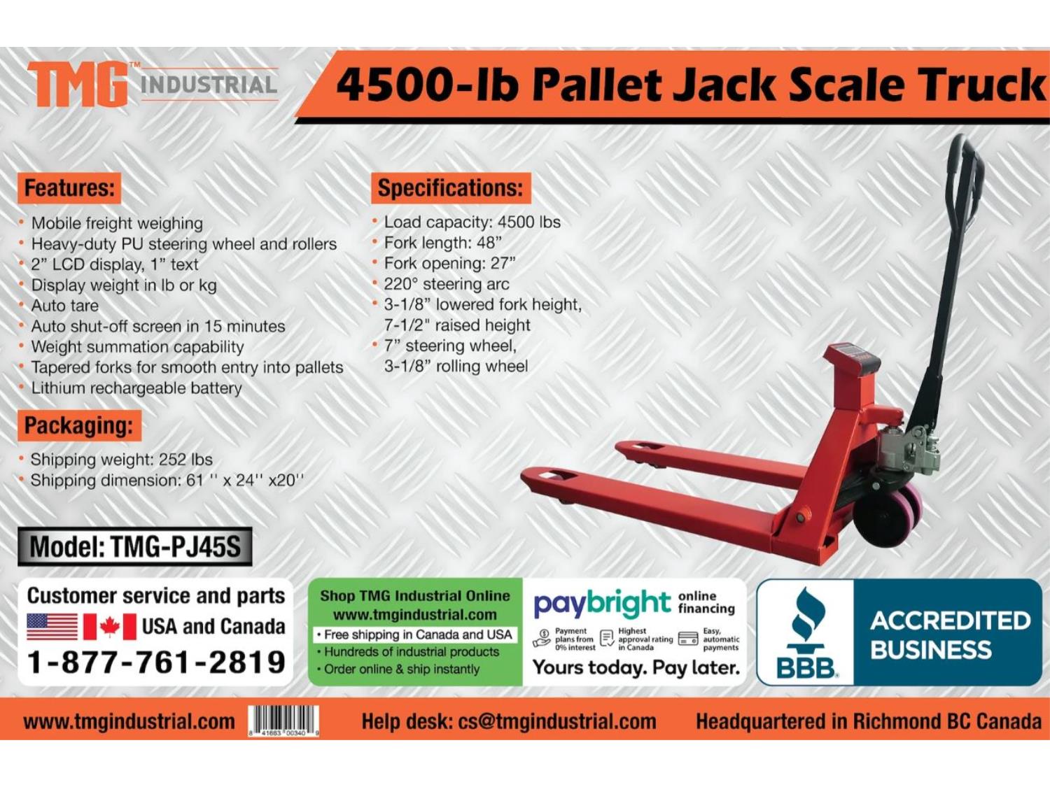 3049 TMG Industrial TMG-PJ45S 4500-lb Pallet Jack Scale Truck (Unused)