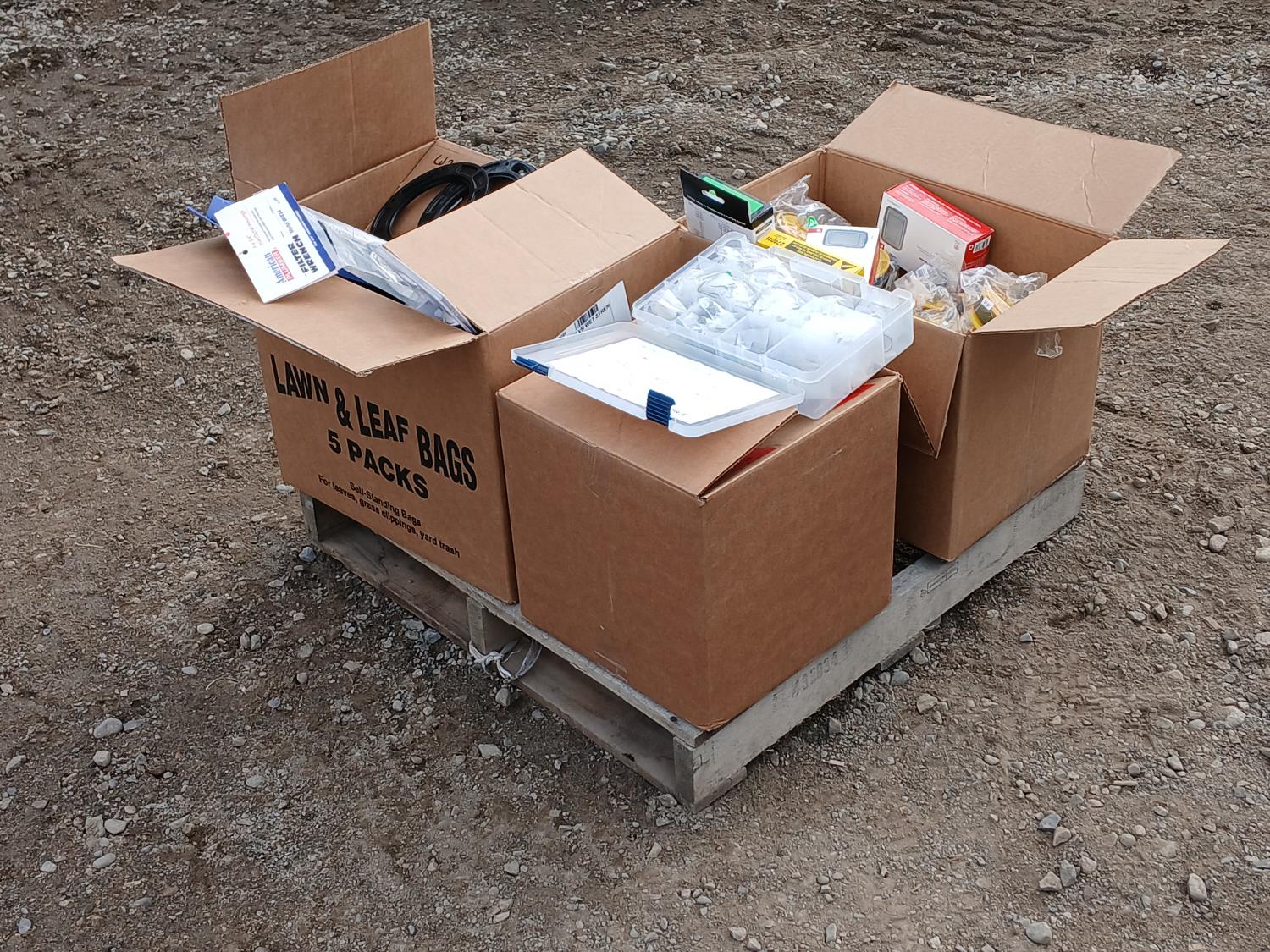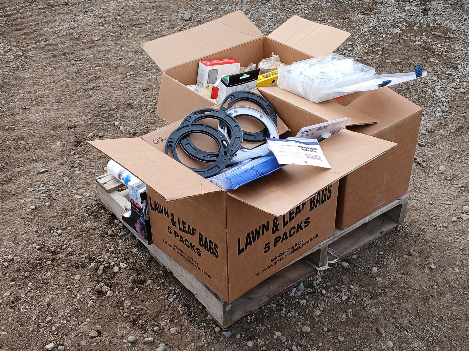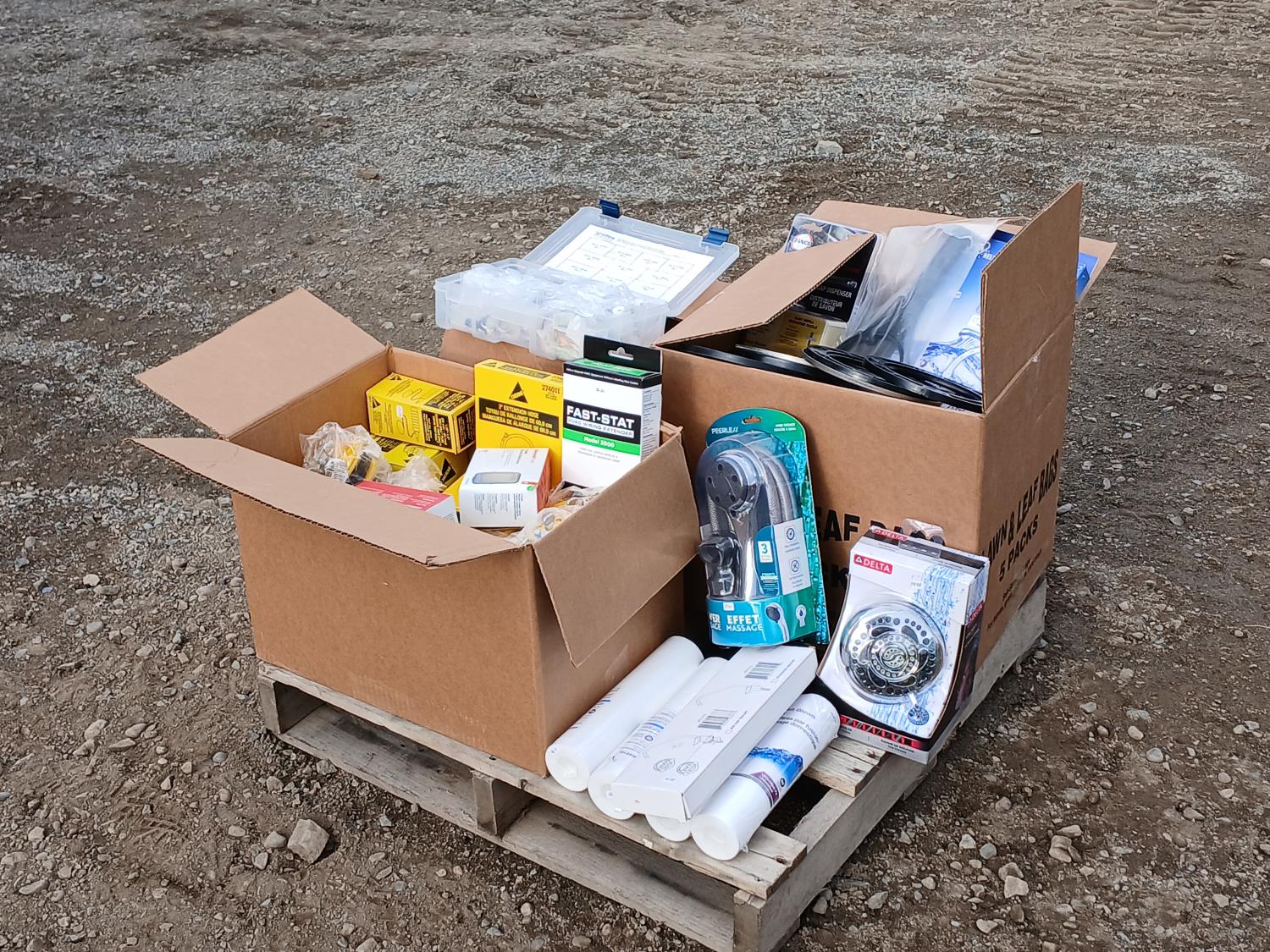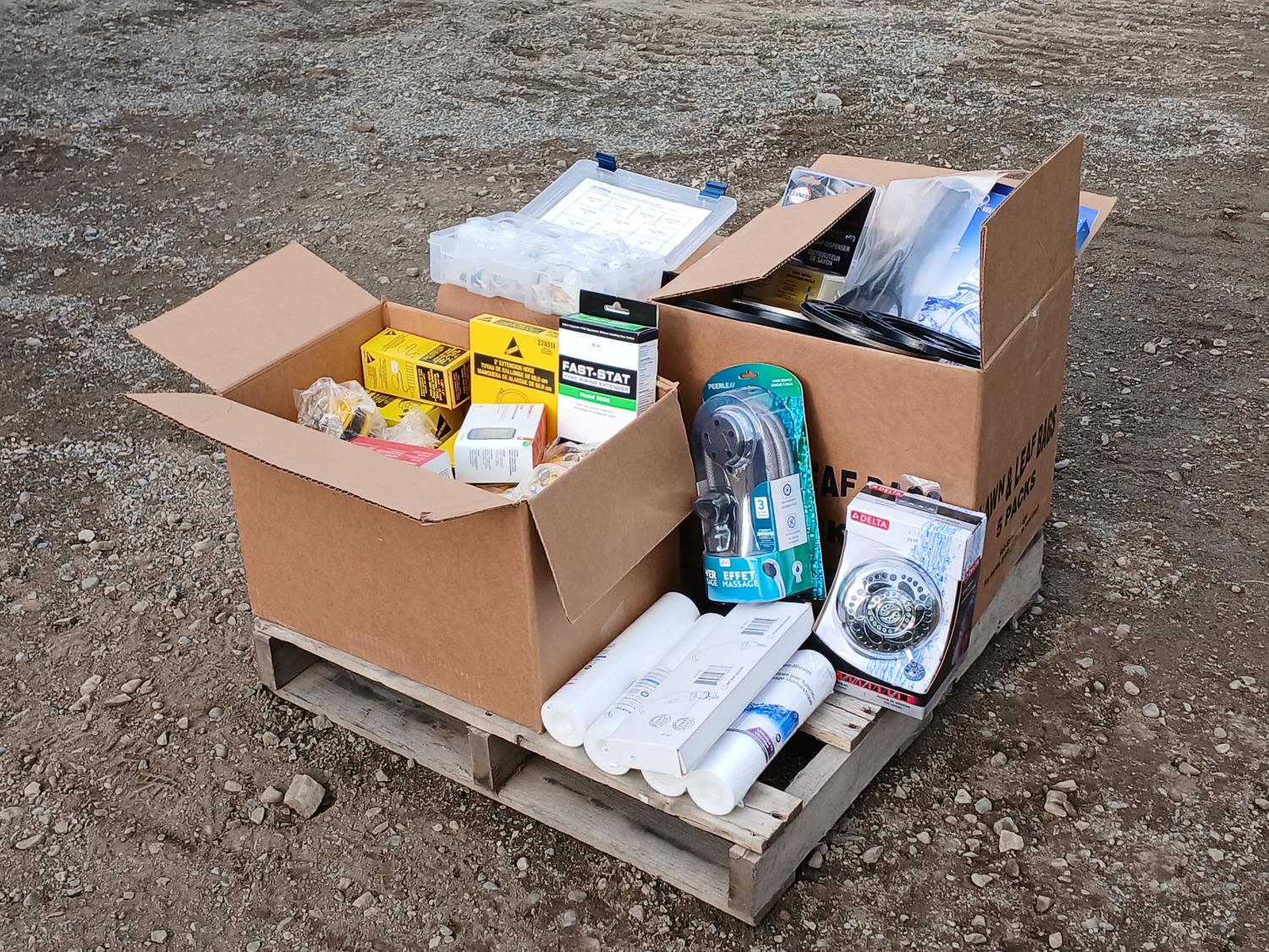 (2) wireless outdoor sensors, (1) HVAC wiring extender, (12) grippers, (1)-4 inch pneumatic plug, (2) -4 inch test ball plugs, (5) clean seal pneumatic plugs, (1)-3 inch test ball plug, (1)-1.25 inch test ball plug, (2)-2 inch extension hose, (3)-2 inch x 22 ft ratchet straps, (2) pk HDX household melt blown filters, (2) sediment filter cartridges, (1) American Plumber 3/4 inch filter wrench, (1) ISO9001Standard Faucet, (5) flanges, (4) NSF Face, (1) NSF bumper, (1) NSF hose grip, (1) Delta Chrome finish shower head, (1) peerless chrome finish hand shower, (4) Delta chrome finish spray shower head, (6) pk aluminum tubing, (4) quick ring floor repair plates, 2.25 inch x 25 ft PEX tubing, (110 straight & (3) angle valves, (1) swivel valve goose neck, (3) soap dispensers, (4) Moen Tap handles, (4) Tap Fixture installation kits, (21) 2-handle faucet replacement cartridges, (1) case w/multiple fixture screws/ washers/ replacement rings etc.