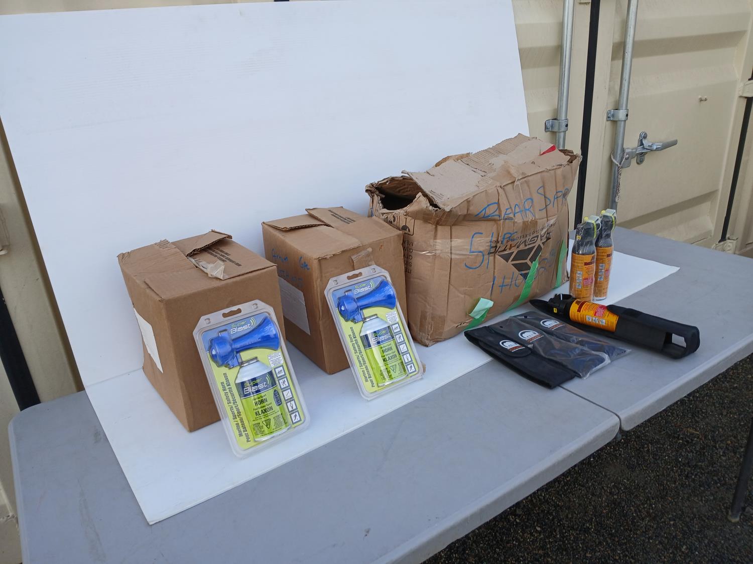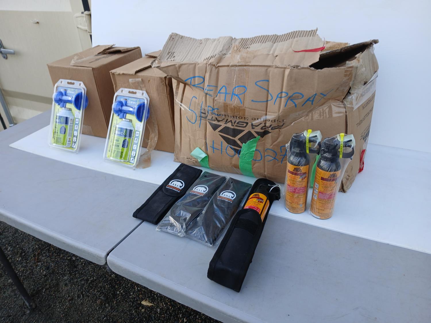 (10) Bear spray holsters, (48) Frontiersman bear spray, (14) Super Blast Marine/Sport Horns.