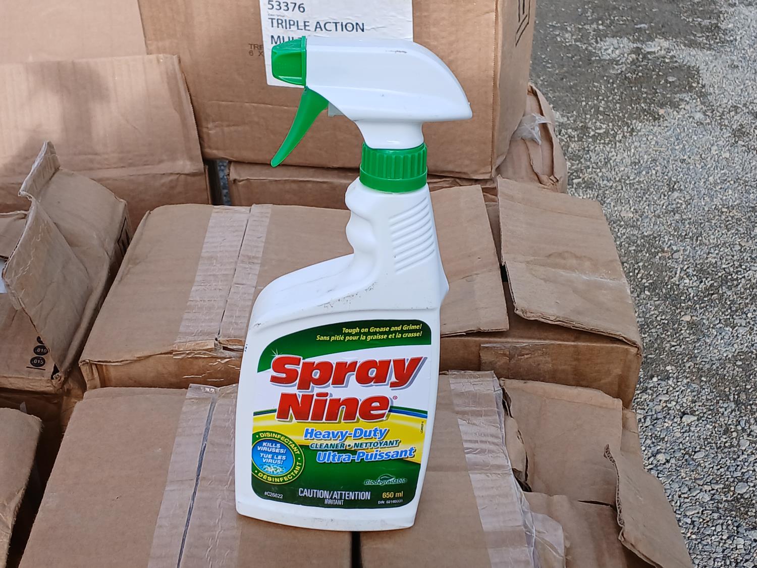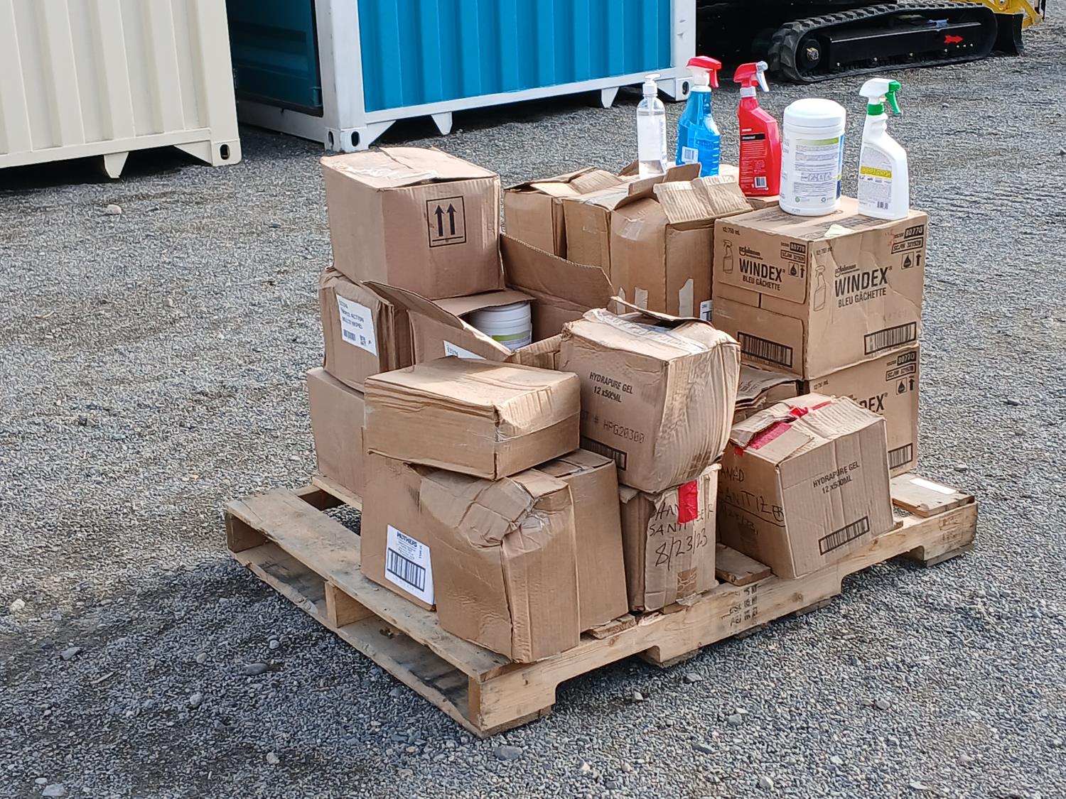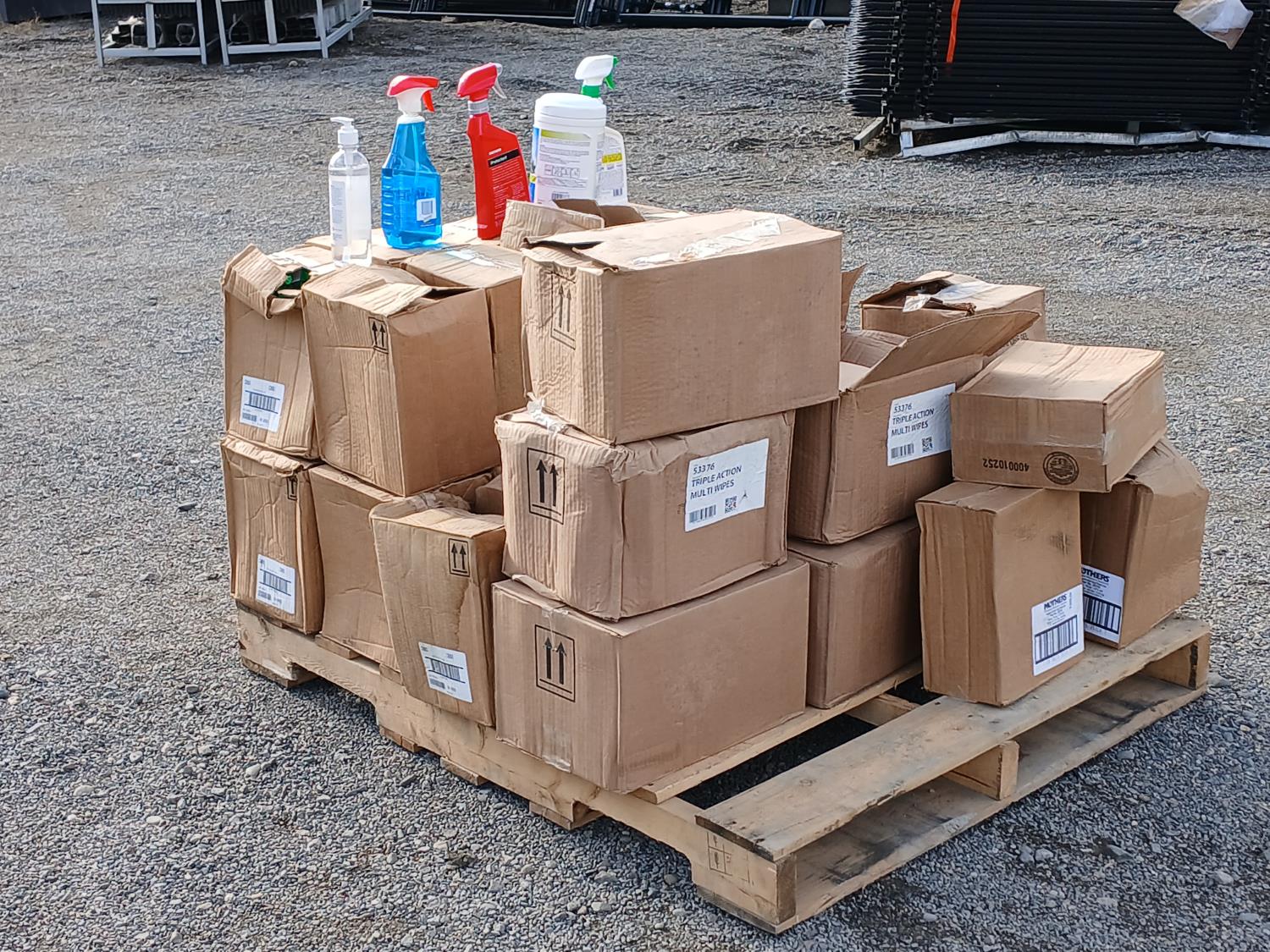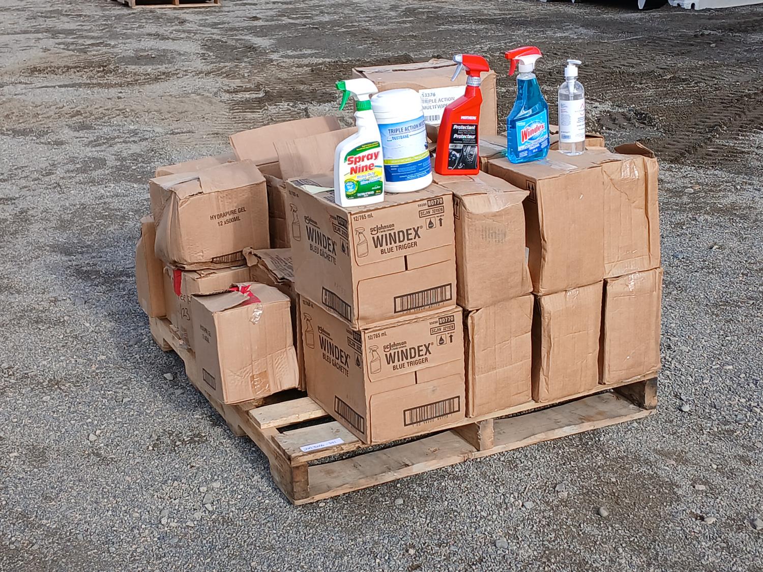 (27) Triple Action Multi cleaning wipes (120 wipe per container), (91) Spray Nine (650ml bottles), (33) Hydra pure gel Sanitizer (500ml bottles), (24) Mother's Protectant (443ml bottles) Vinyl and rubber protectant, (24) Windex Glass cleaners (765ml).