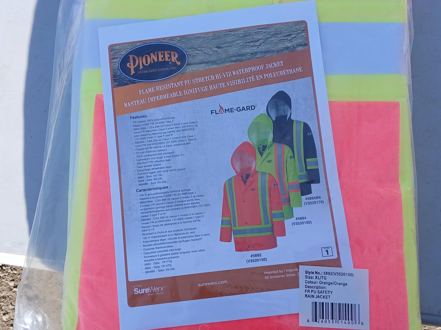 (1) pair Watson impact/cut protection gloves, (1) Pioneer XL High visibility Flame/Waterproof resistant Jacket, (1) can Bear spray with holster case, (1) Emergency signal horn, (1) pair Ice treckers (Diamond grip), (1) 3 M Peltor Ear muffs, (1) Dynamic yellow hard hat, (1) Lufkin fibre glass long tape, (1) pair Dunlop full safety Green/Black Rubber boot - size 13, (2) BDG Classic neck warmers, (2) pairs Superior Glove Chem stop impact/cut resistant gloves, (1) size 56 Avenger cotton High visibility coveralls.