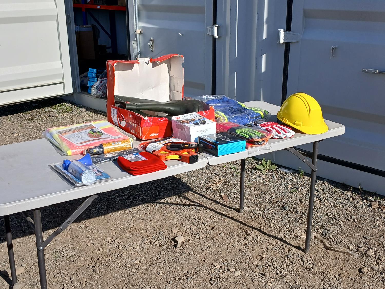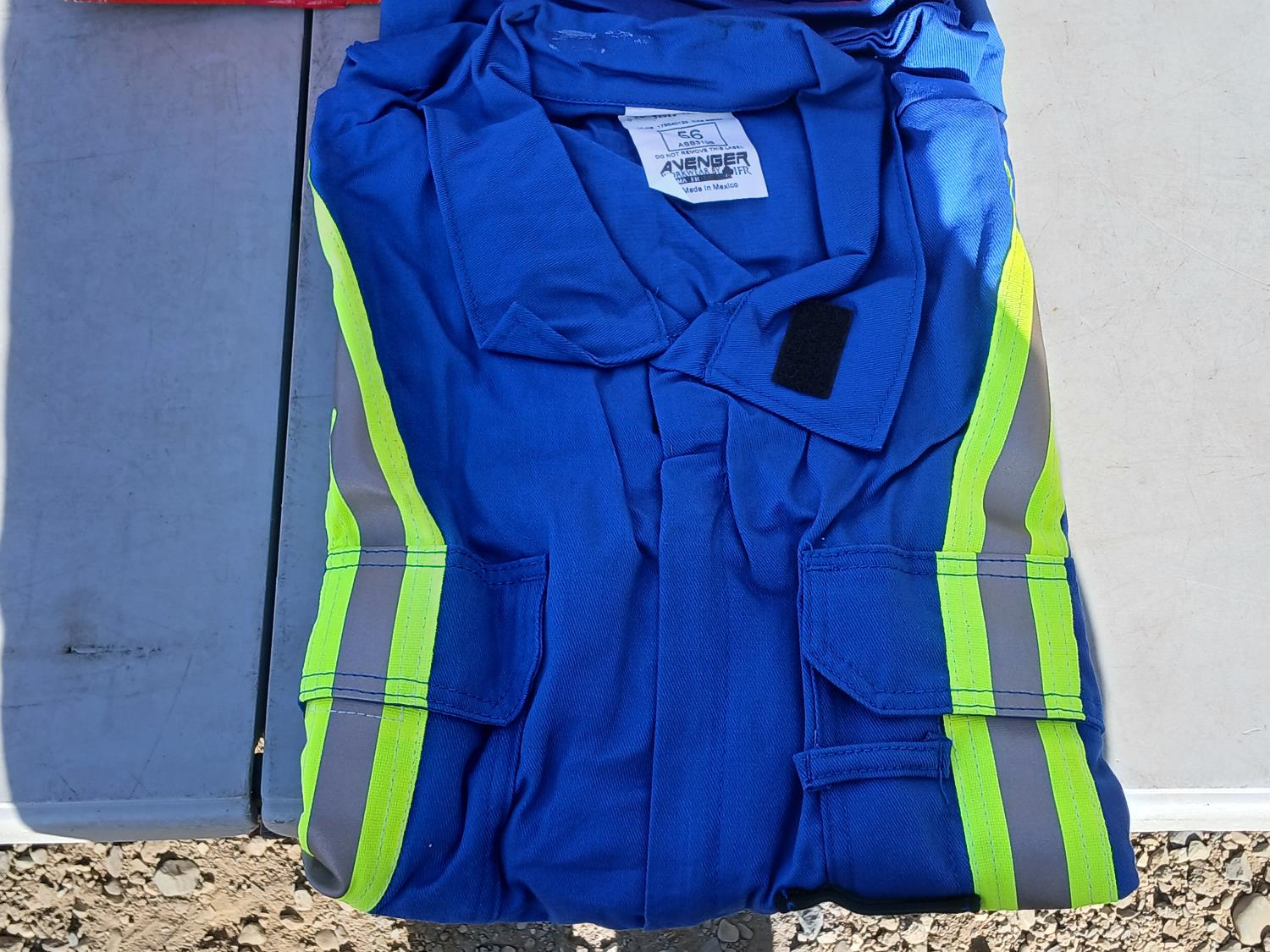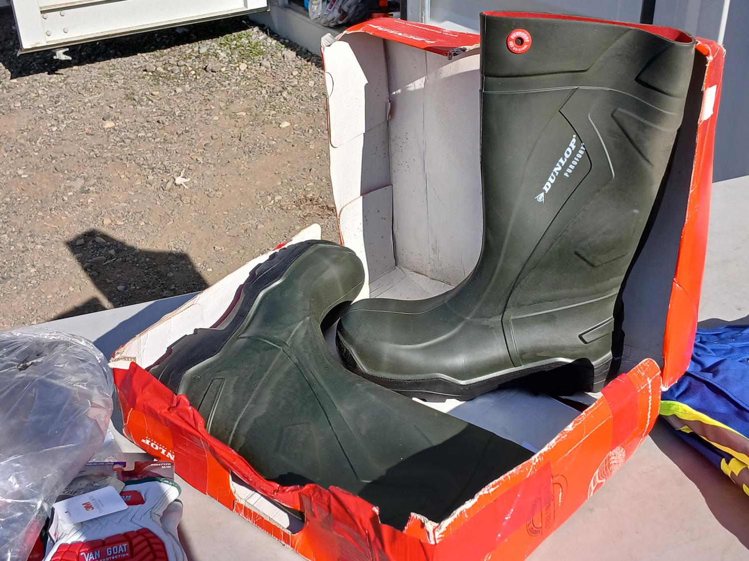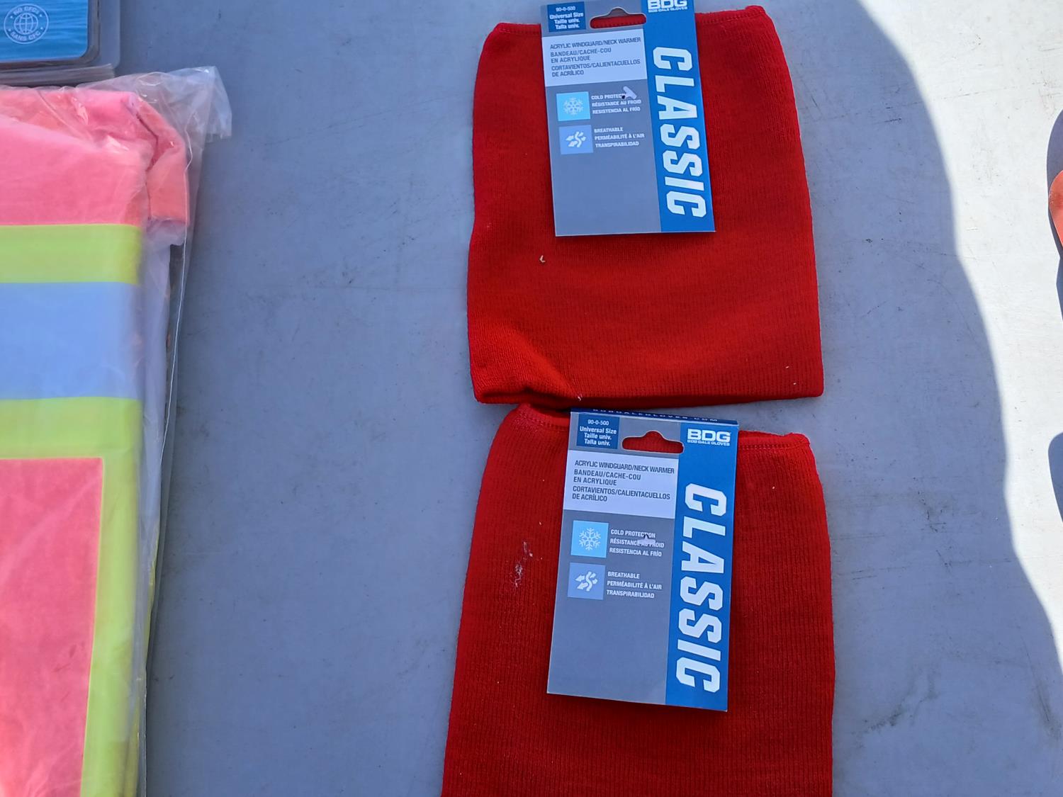 (1) pair Watson impact/cut protection gloves, (1) Pioneer XL High visibility Flame/Waterproof resistant Jacket, (1) can Bear spray with holster case, (1) Emergency signal horn, (1) pair Ice treckers (Diamond grip), (1) 3 M Peltor Ear muffs, (1) Dynamic yellow hard hat, (1) Lufkin fibre glass long tape, (1) pair Dunlop full safety Green/Black Rubber boot - size 13, (2) BDG Classic neck warmers, (2) pairs Superior Glove Chem stop impact/cut resistant gloves, (1) size 56 Avenger cotton High visibility coveralls.