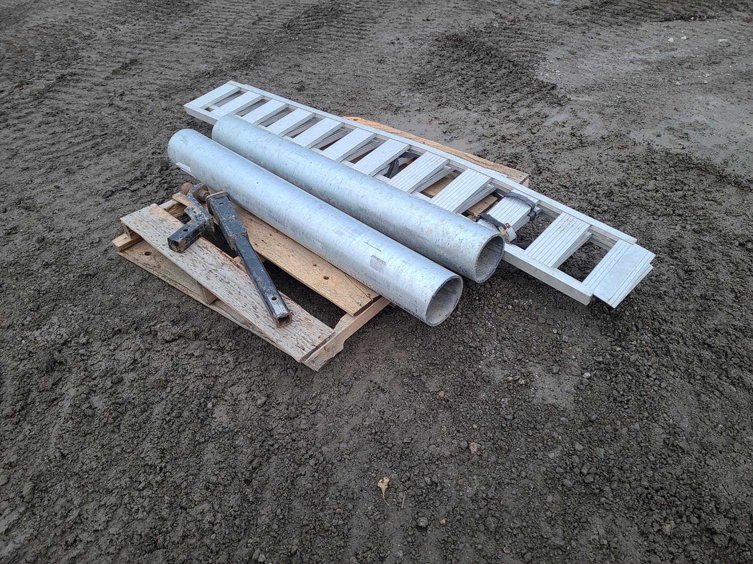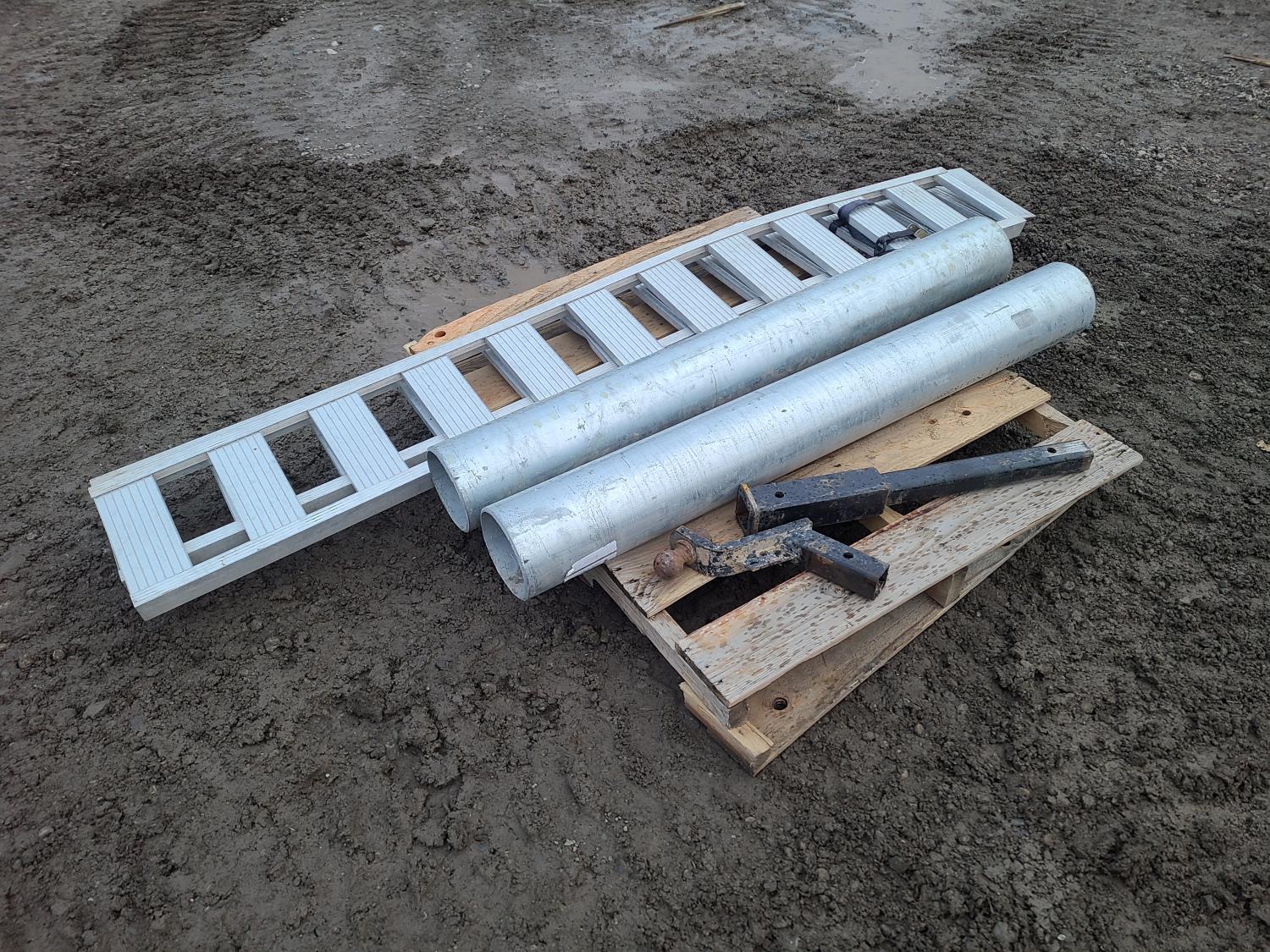 (1) set Loadit Ramps, (1)-2 Inch Hitch Extension, (1) - 2 Inch Hitch, (2) Schedule 40 6 inch Pipe (54 Inch Long)