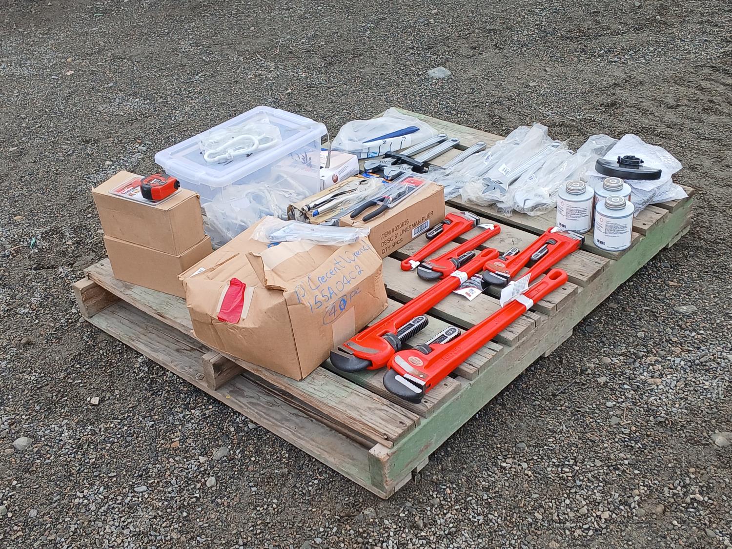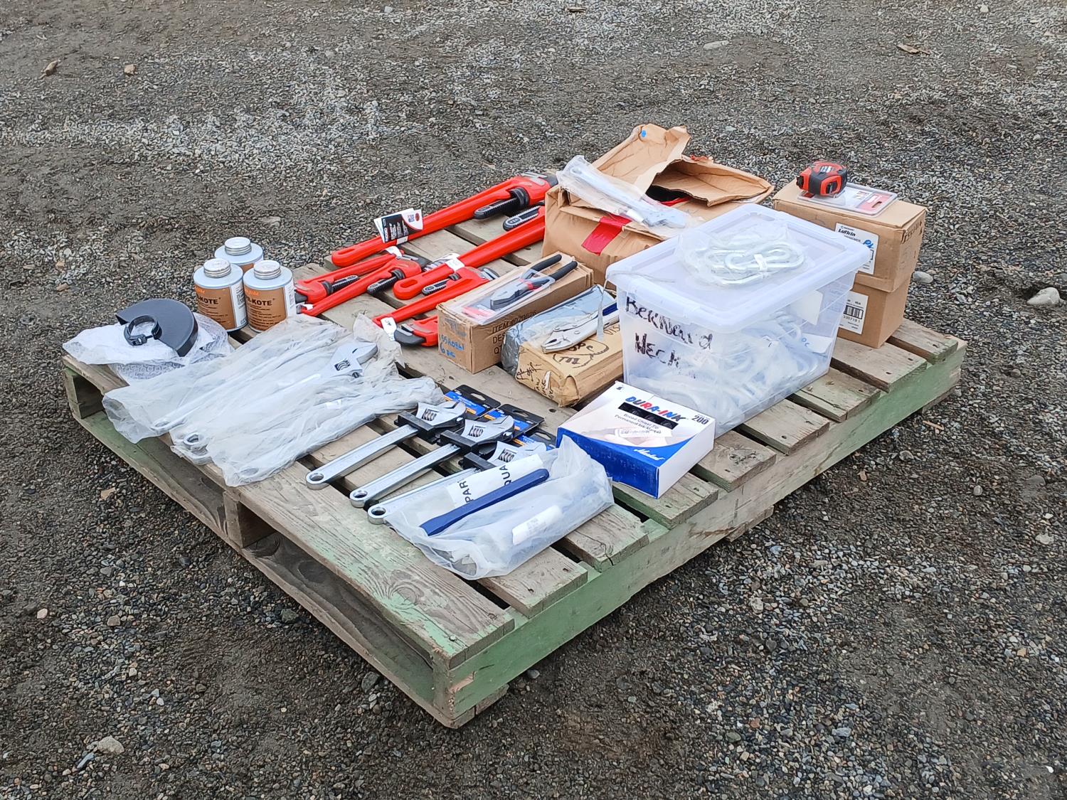 (40) 10 inch Crescent Wrenches, (3) 12 inch Crescent wrenches, (5) 15 inch Crescent wrenches, (2) 24 inch Heavy duty Pipe Wrench, (4) 12 inch Heavy duty pipe wrench, (6) Linesman pliers, (12) Lufkin 3/4 inch x 16 ft measuring tape, (12) Broad tip Dura Ink markers, (8) Cold Chisel 1 inch diameter, (4) Grinder guards, (35) 1/2 snap hooks, (10) 8 inch vise grips, (3) Jet Lube Anti-seize compound.