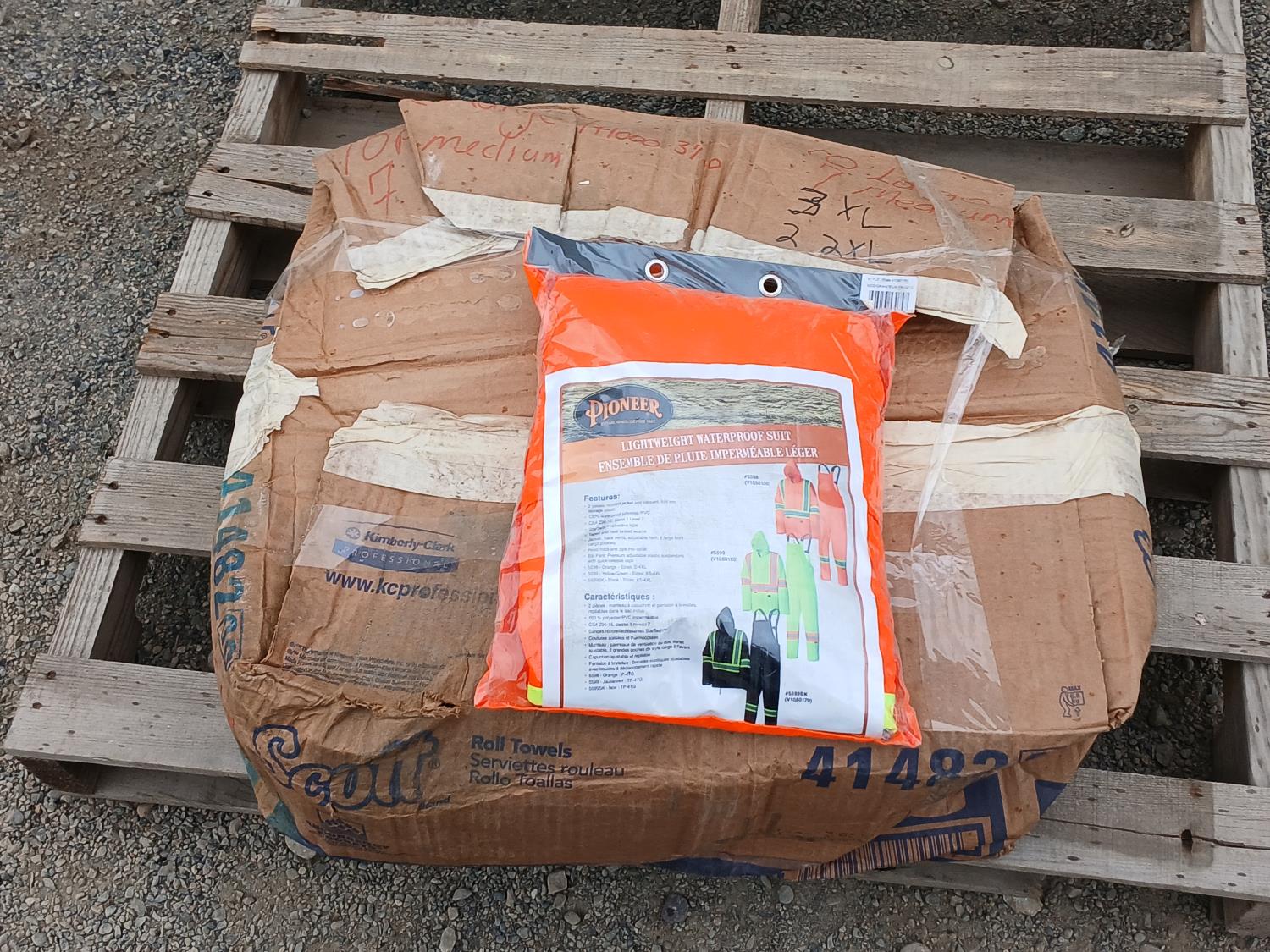 1 box Sizes (3)- XL, (2) -2XL, (7) -Med, (10)- LG Pioneer lightweight waterproof suites.