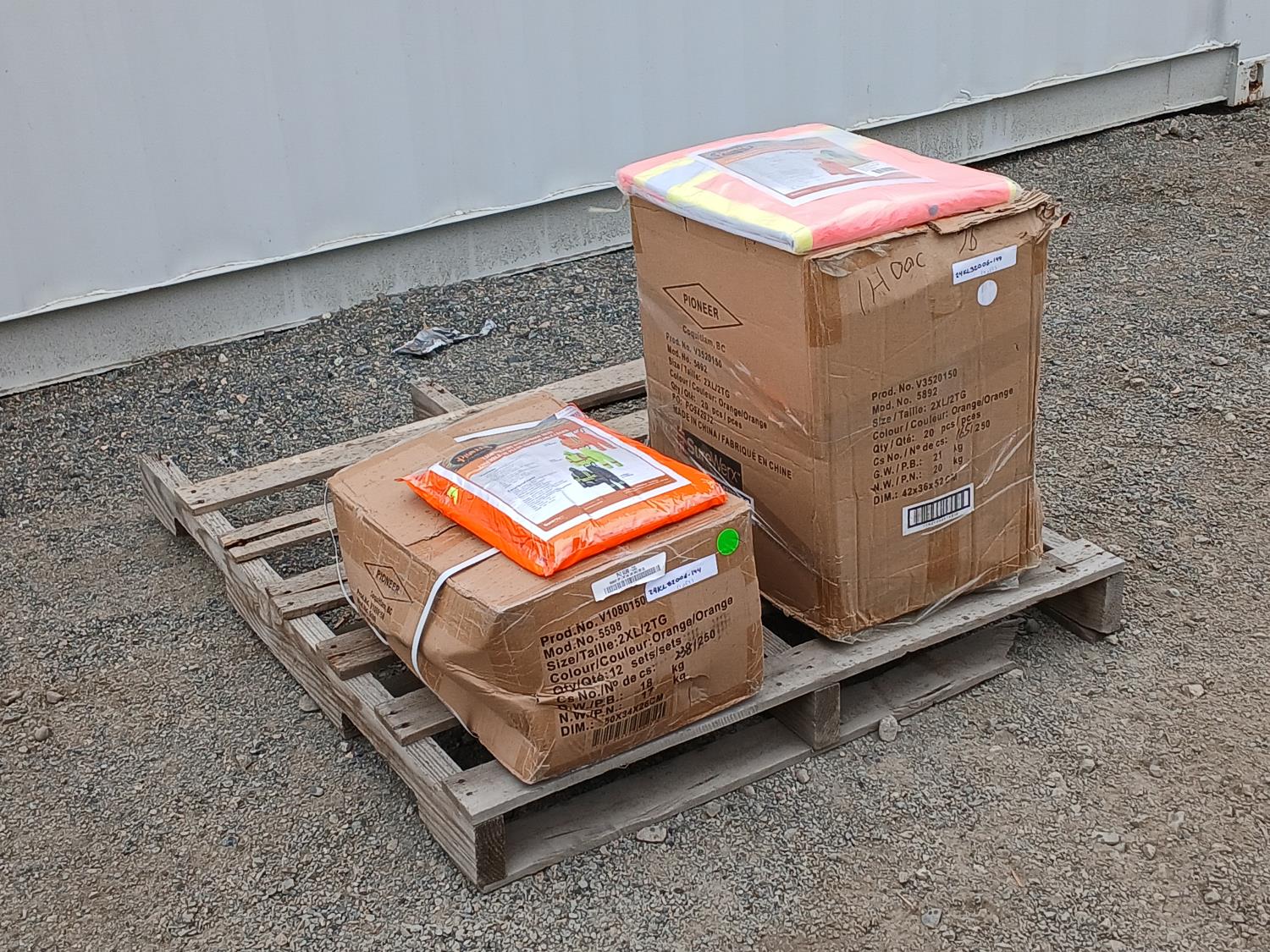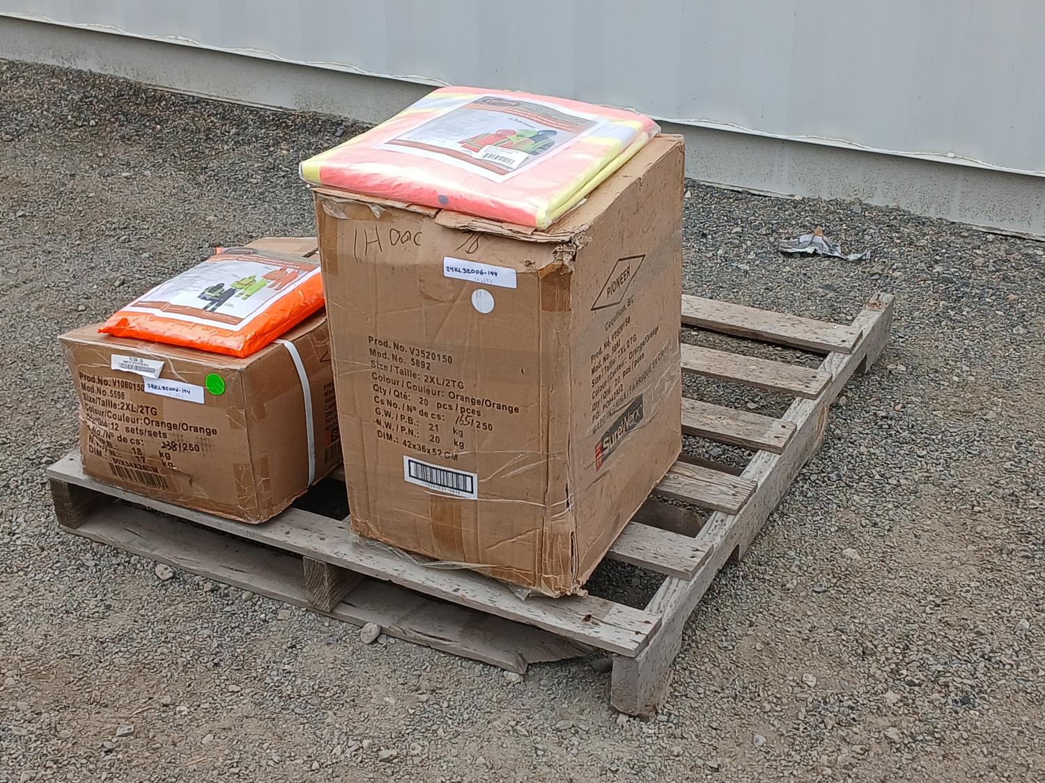 1 box (10) size 2XL Pioneer lightweight waterproof suits, 1 box (20) size 3XL Pioneer waterproof/flame resistant PU stretch high visibility Jackets.