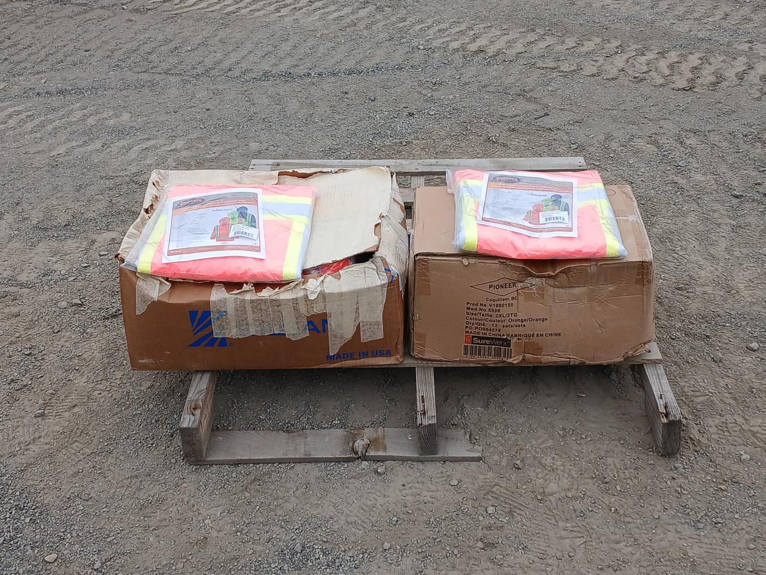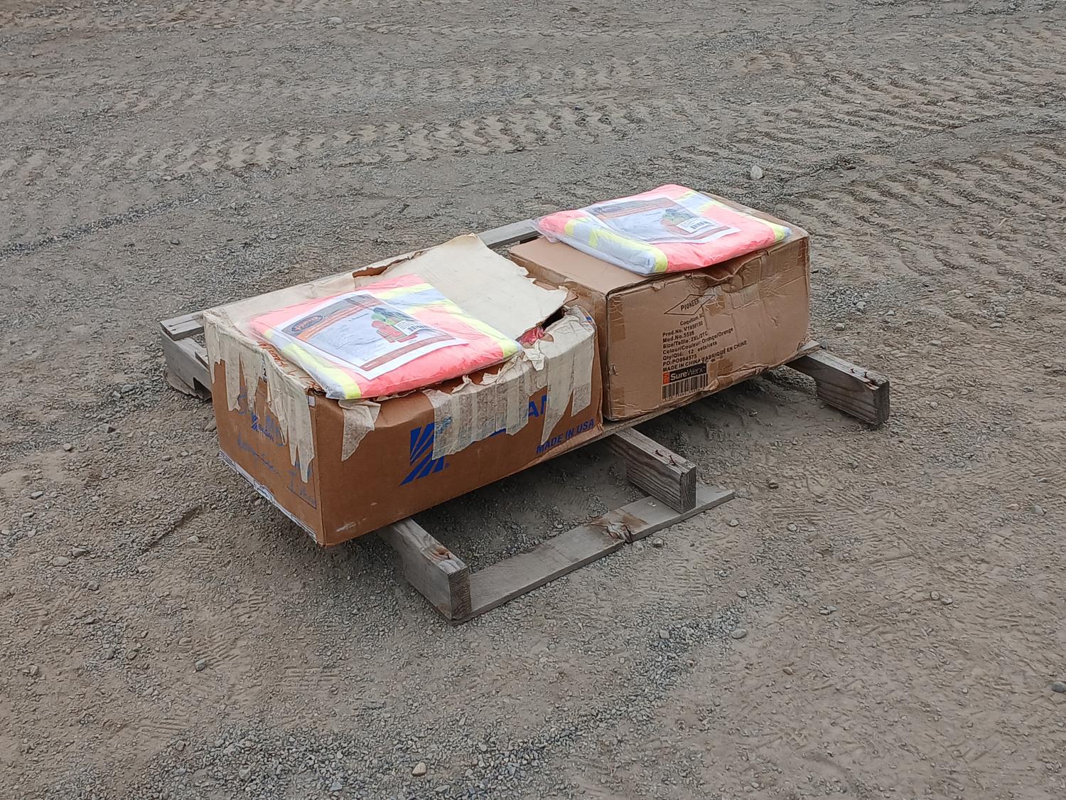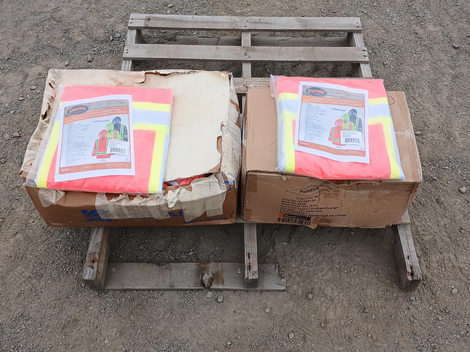1 box (20) size LG Pioneer waterproof/flame resistant PU stretch high visibility jackets, 1 box (11) size 2XL Pioneer waterproof/flame resistant PU stretch high visibility jackets.