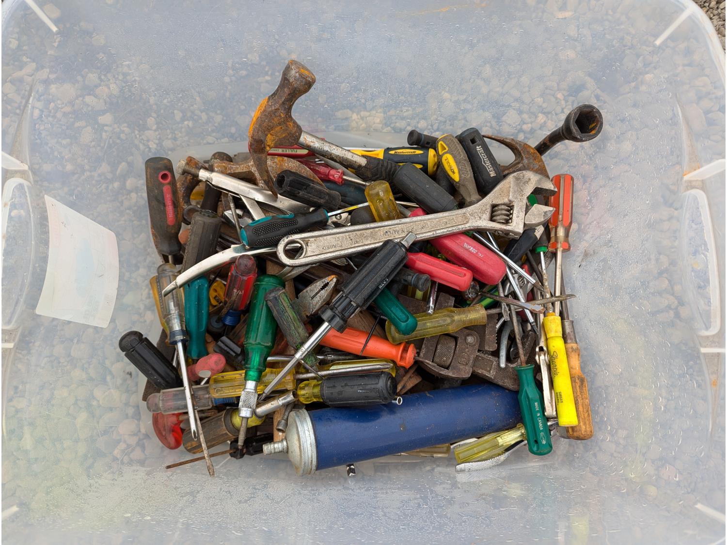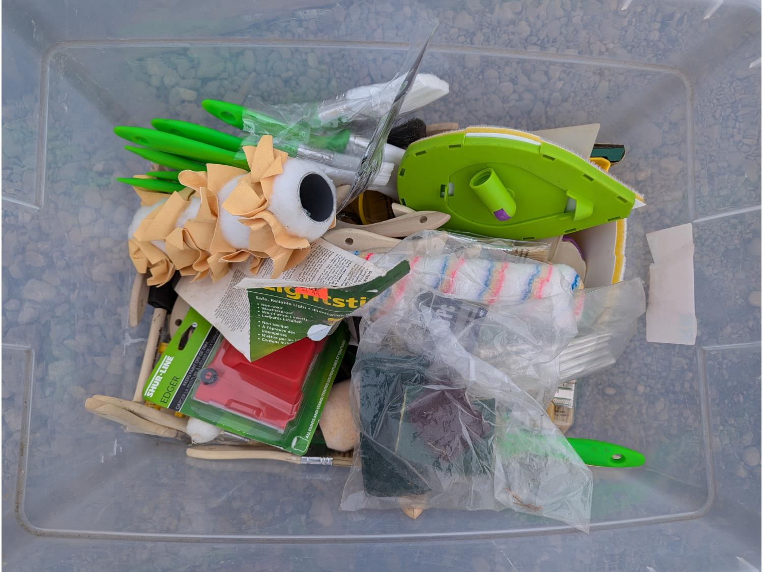 Extension cords, miscellaneous hand tools, paint brushes & supplies, drill bits, battery charger