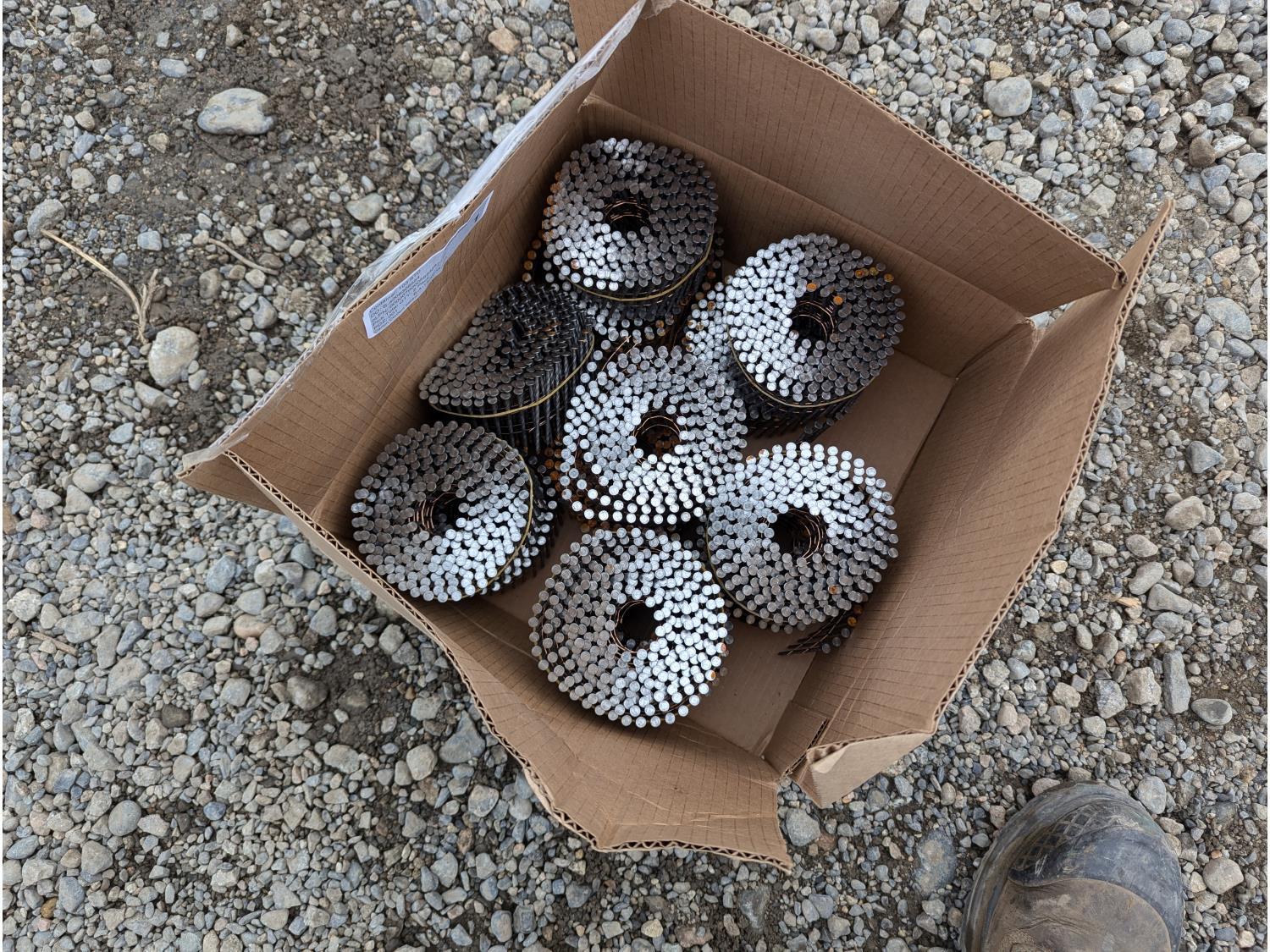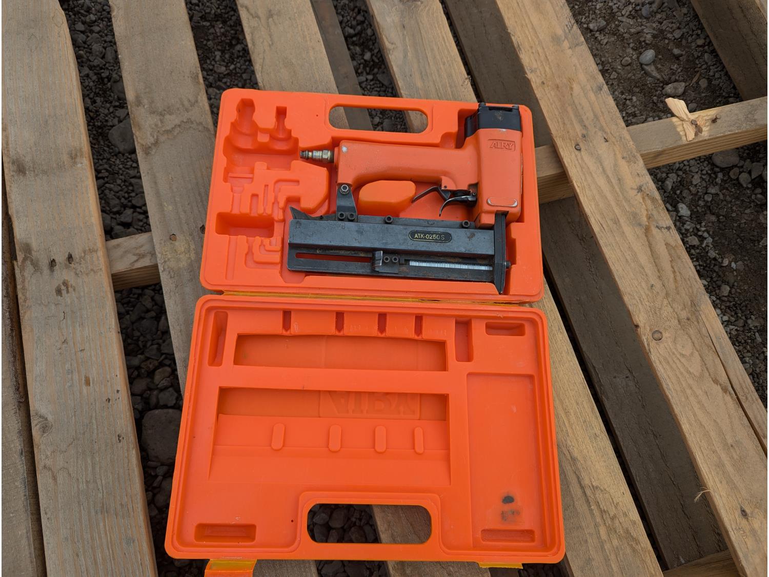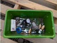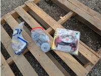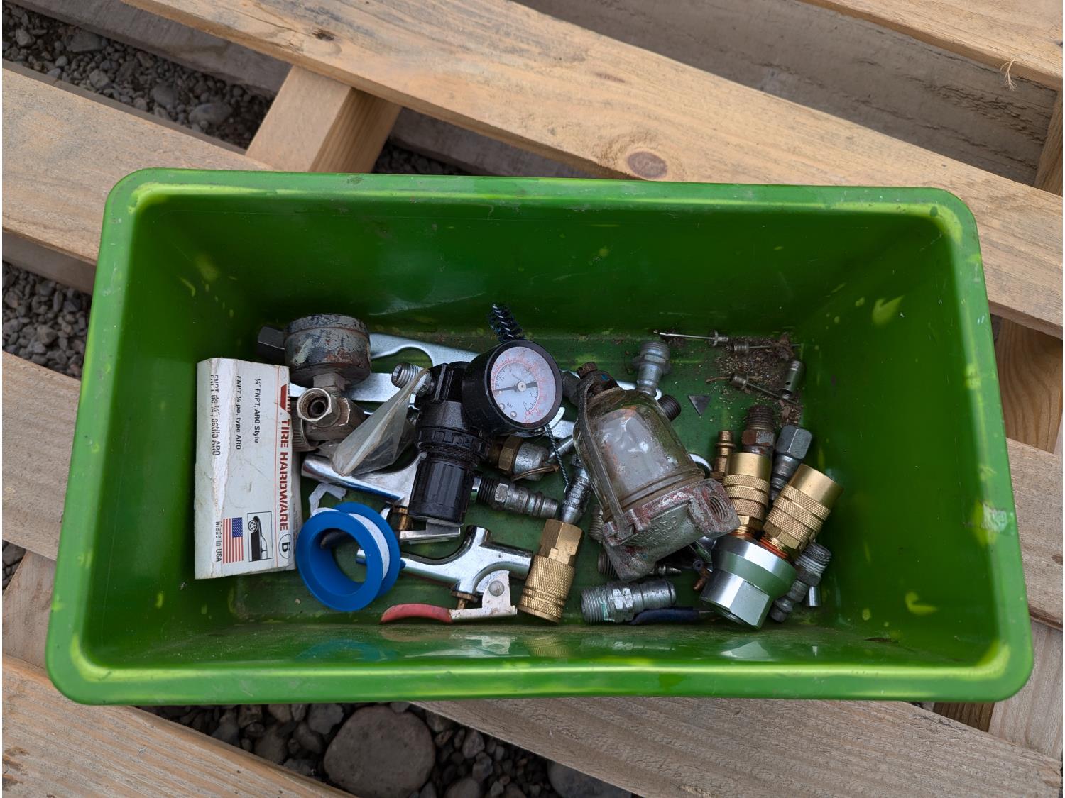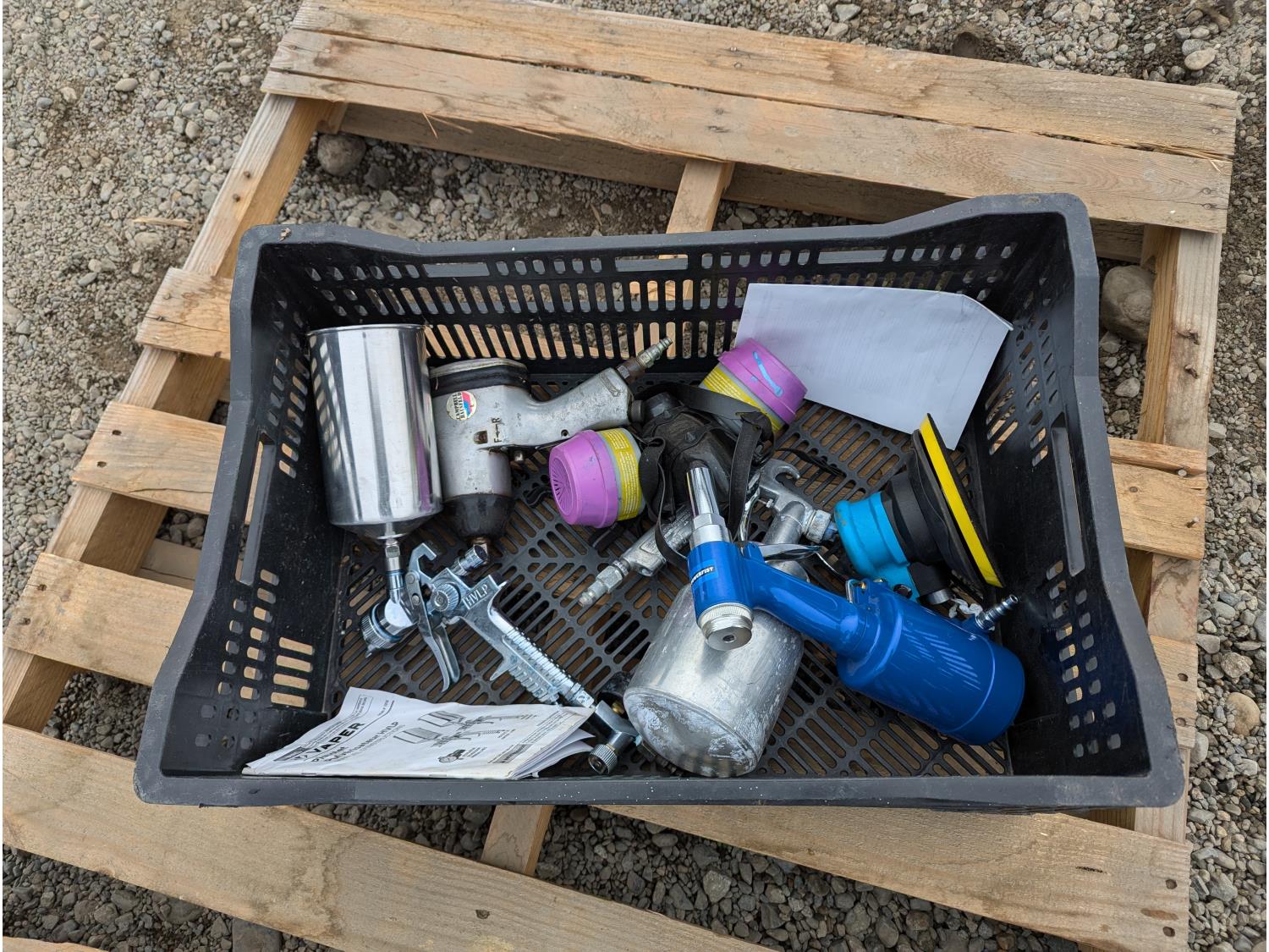 Air nail gun, paint sprayers, tool box with assorted hand tools, electric fillet knife, respirator & cartridges, nails
