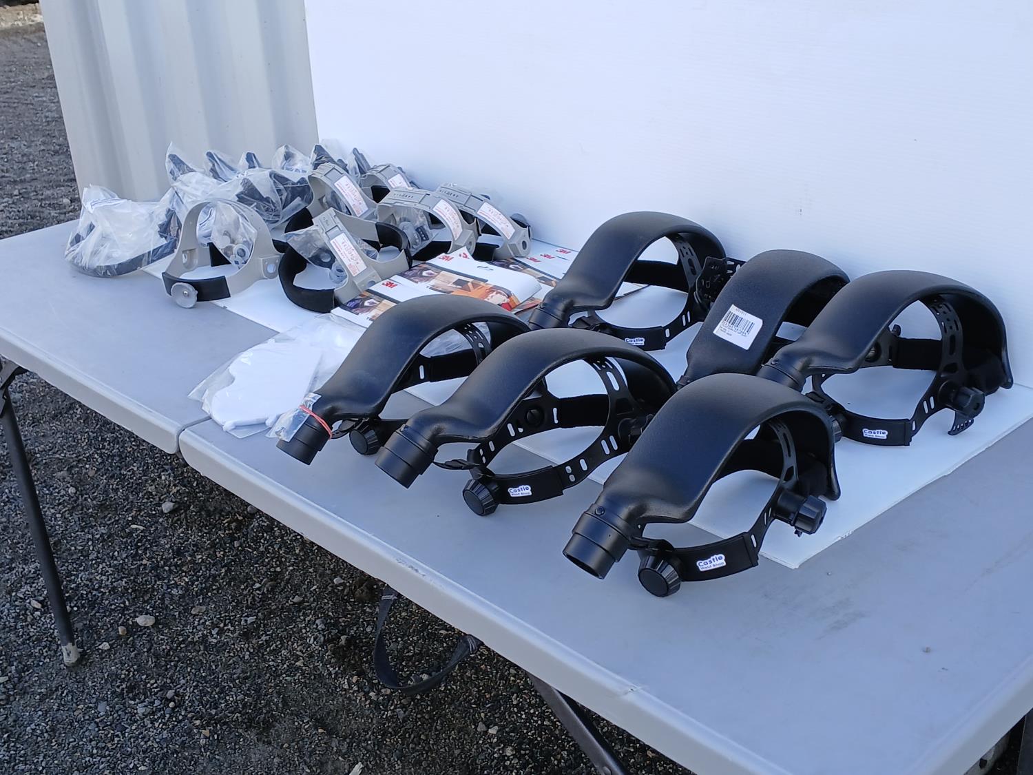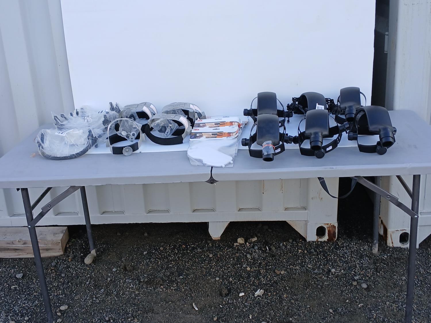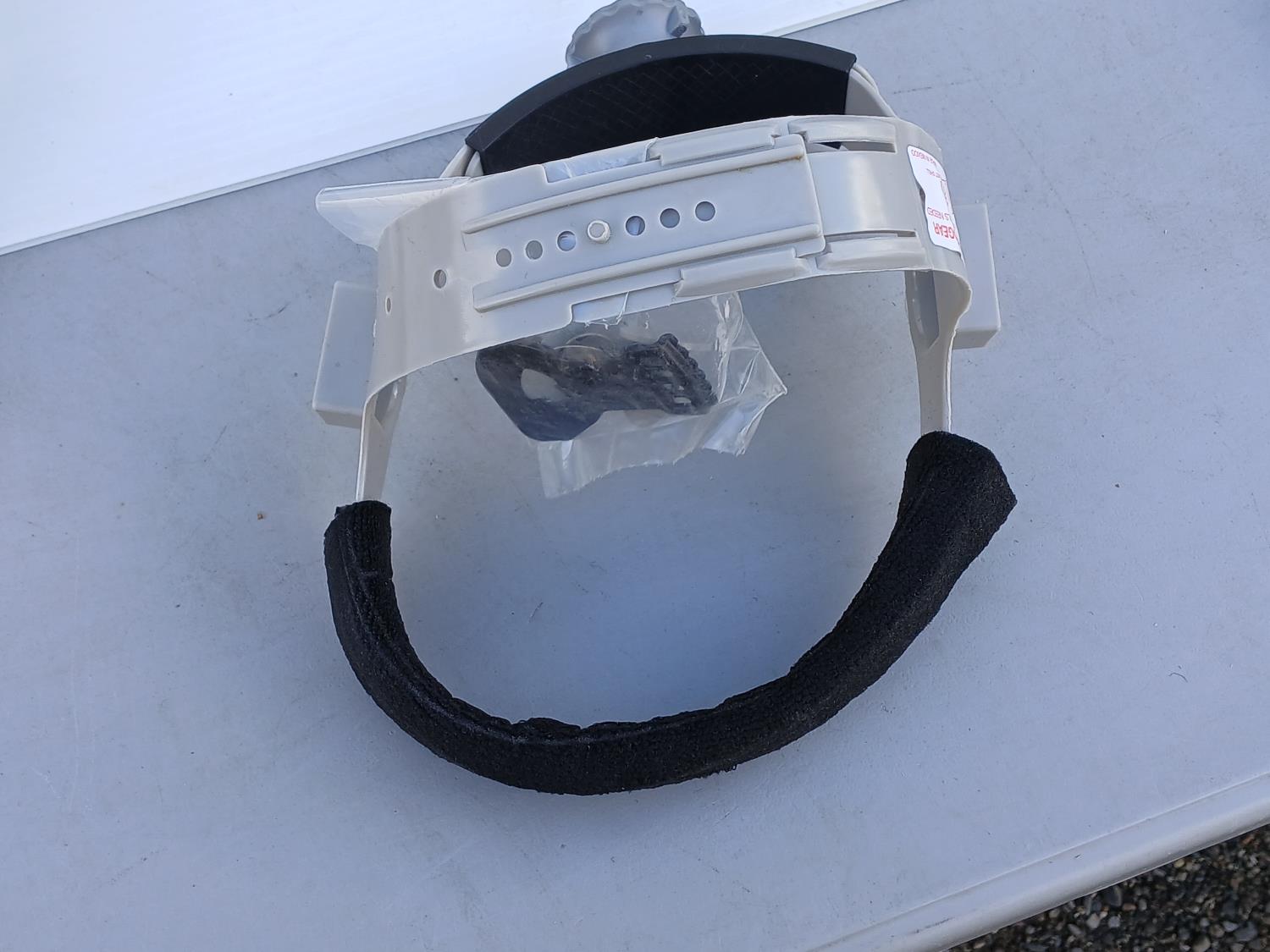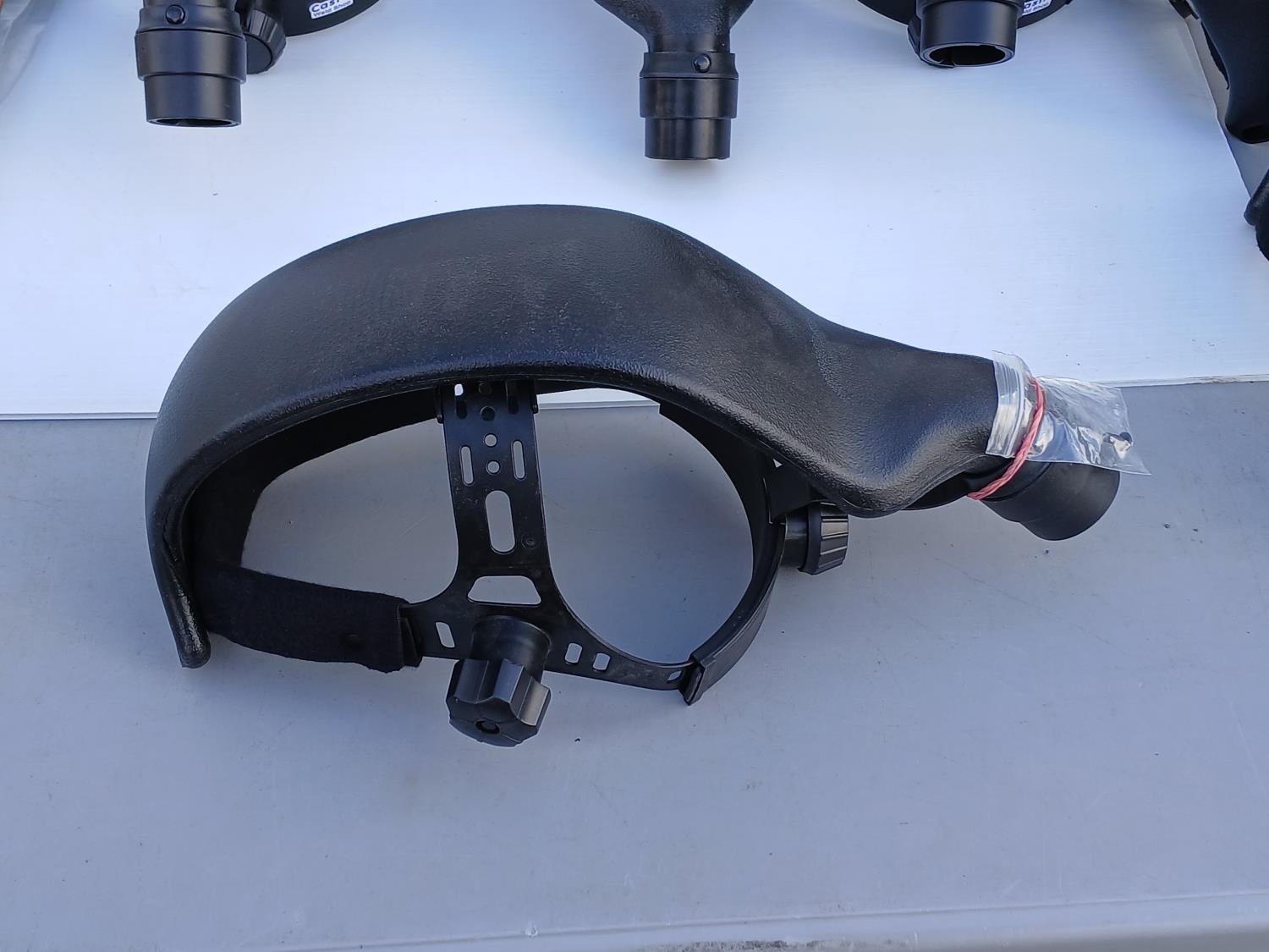 (6) Head Gear Inc Air Duct, (6) 3 M Speed glass wide view clear grinding visor, (5) Honeywell Fibre Metal 1-CR Head gear, (6) Dynamic Cap mount face shield brackets.
