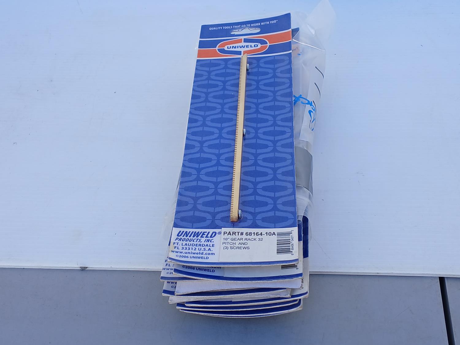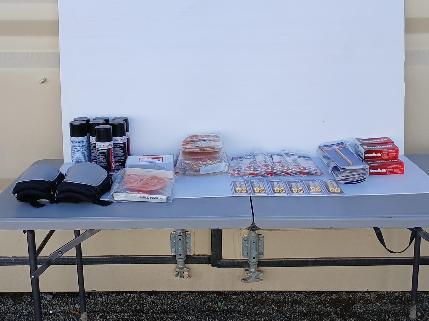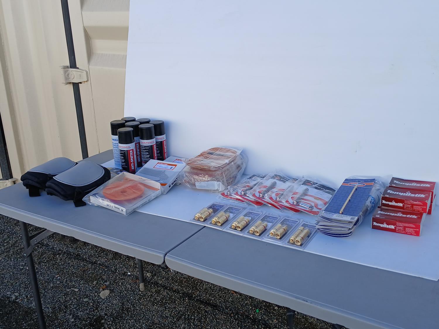 (46) Tempilstick, (6) Flasback arrester sets, (5) penlights, (2) pair Hard shell knee pads, (10 piece) Leather hand shields, (10 piece) 10 inch Gear rack pitch and screws, (3) Walter 6 inch x5/8 inch backing pad sanding discs, (2) Powerweld Anti-splatter spray, (5) Canesco Anti-splatter spray.
