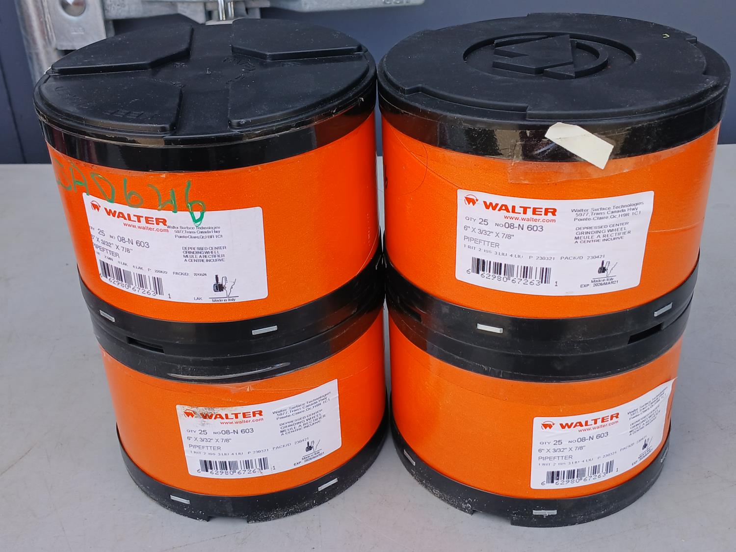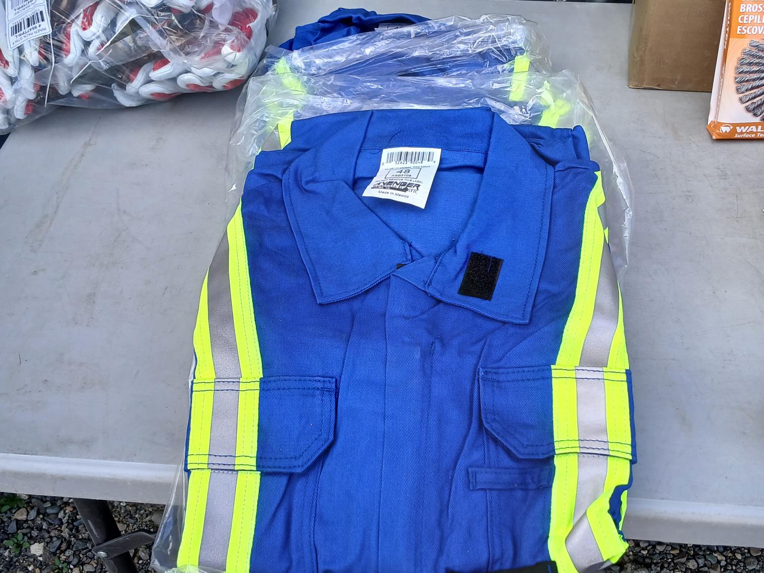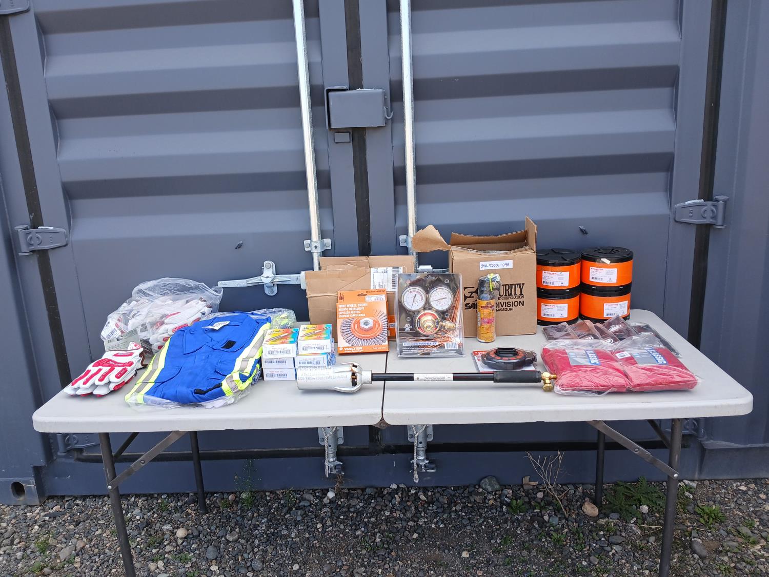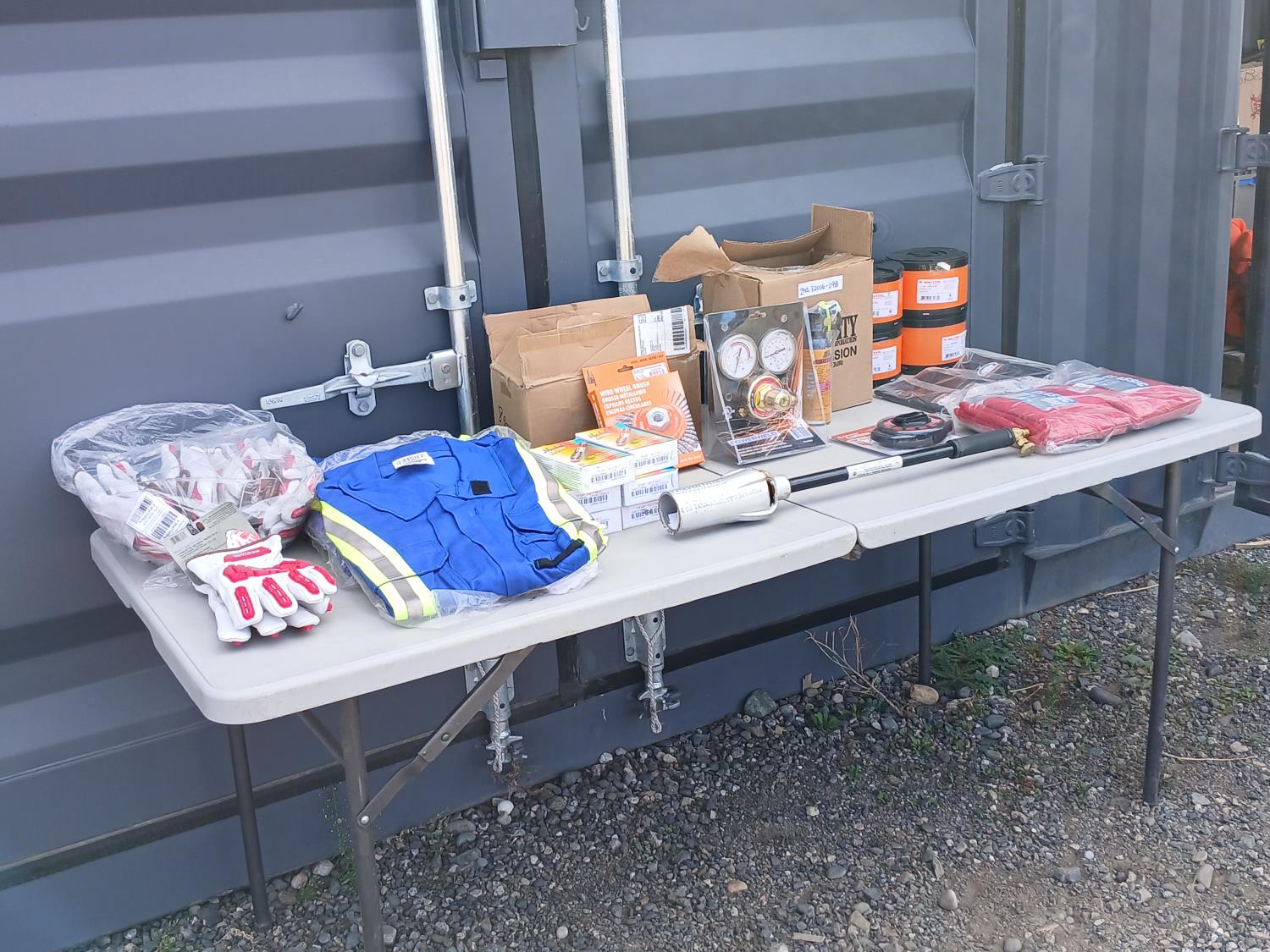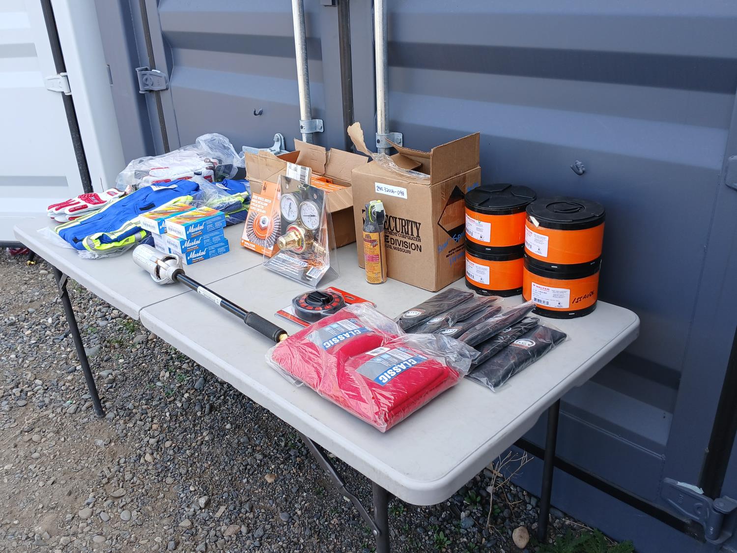 (6) pairs Watson Van Goat impact resistant gloves, (1) Lufkin 100 ft measuring tape, (6) boxes Thermomelt heat sticks, (3) Avenger size 48 High visibility coveralls, (6) Dynamic neck warmers, (4) pkg of 25 (100 total) Walter 6 inch x 3/32 inch x7/8 inch depressed centre grinding wheels, (10) cans Frontiersman bear spray with 6 holsters, (1) CSA propane Tiger torch, (1)0 Walter 6 inch x 1/4 inch x 5/8 inch -11 Wire wheel brush, (1) Powerweld Med duty Acetylene regulator