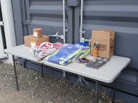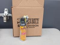 (6) pairs Watson 3 M oil/cut/impact resistant gloves, (1) Lufkin 100 ft measuring tape, (6) boxes Thermomelt heat sticks, (3) (multiple sizes) Avenger High visibility coveralls, (6) Dynamic neck warmers, (4) Walter 6 inch x 5/8 inch -11 40 grade enduro flap disc, (1) CSA propane tiger torch, (10) cans Frontiersman bear spray with 4 holsters.