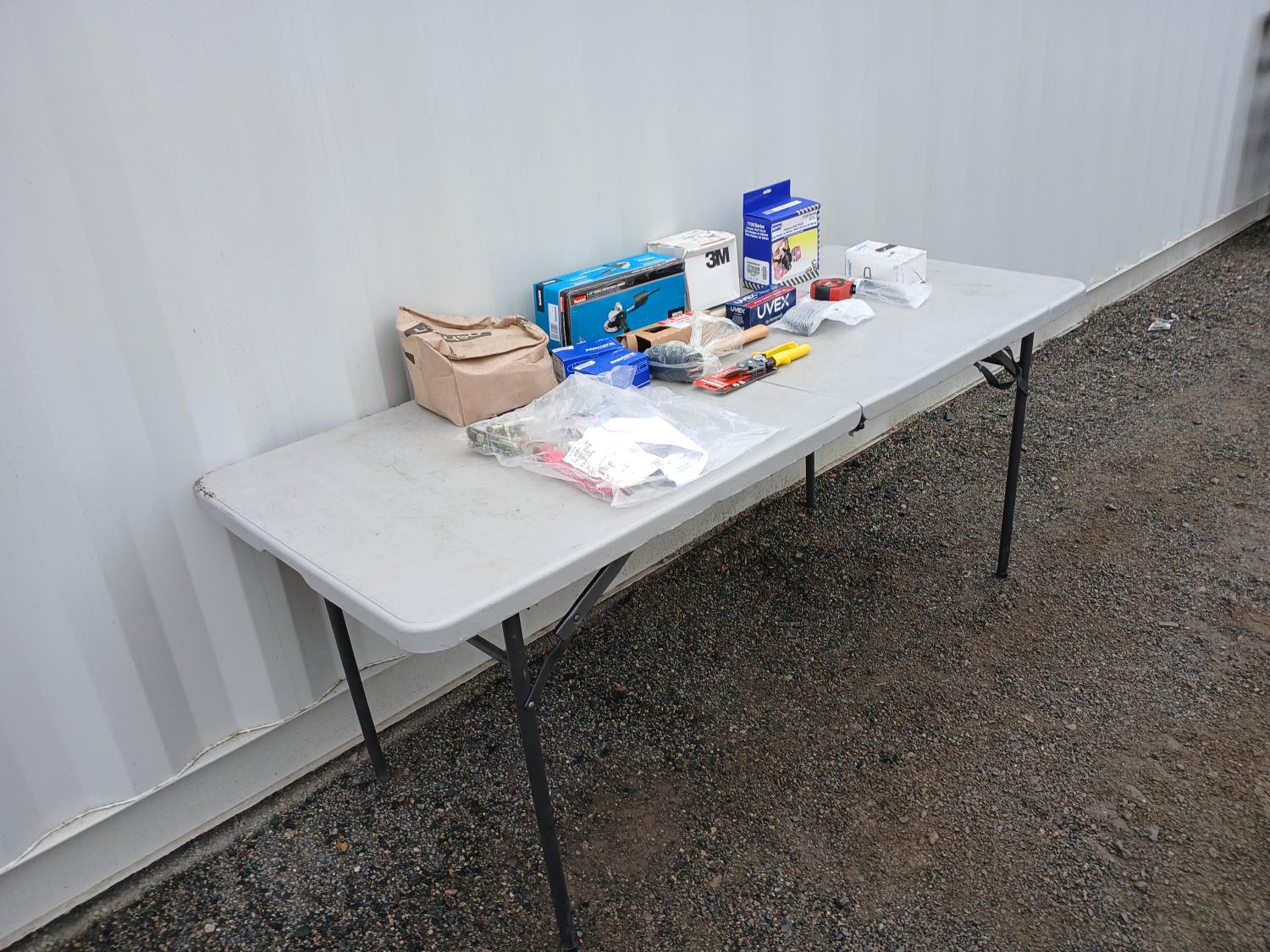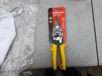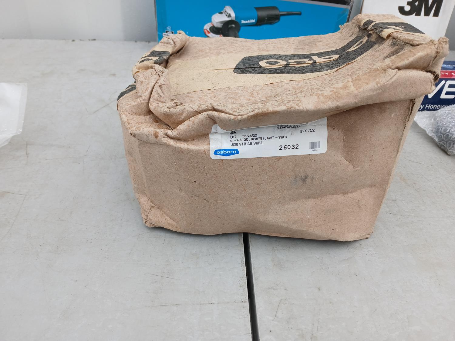1 case Walter 6 inch x 5/8 inch Wire wheels, 1-pair Crescent Aviation Snips, 1-box (10) Maltor Secumex Safety cutters, 2-boxes White paint markers, 1- North silicone half mask, 1 - box 4.5inch flap discs, 1 - 4.5 inch Makita Angle grinder, 1 - Lufkin 1 inch x 26 ft measuring tape, 1- grinder guard, 1- 1pound mallet, 1- 8 inch plastic counter brush, 1- rope grab 3 M protection, 1 - 10 inch Crescent wrench, 1 - U Vex Safety eyewear.