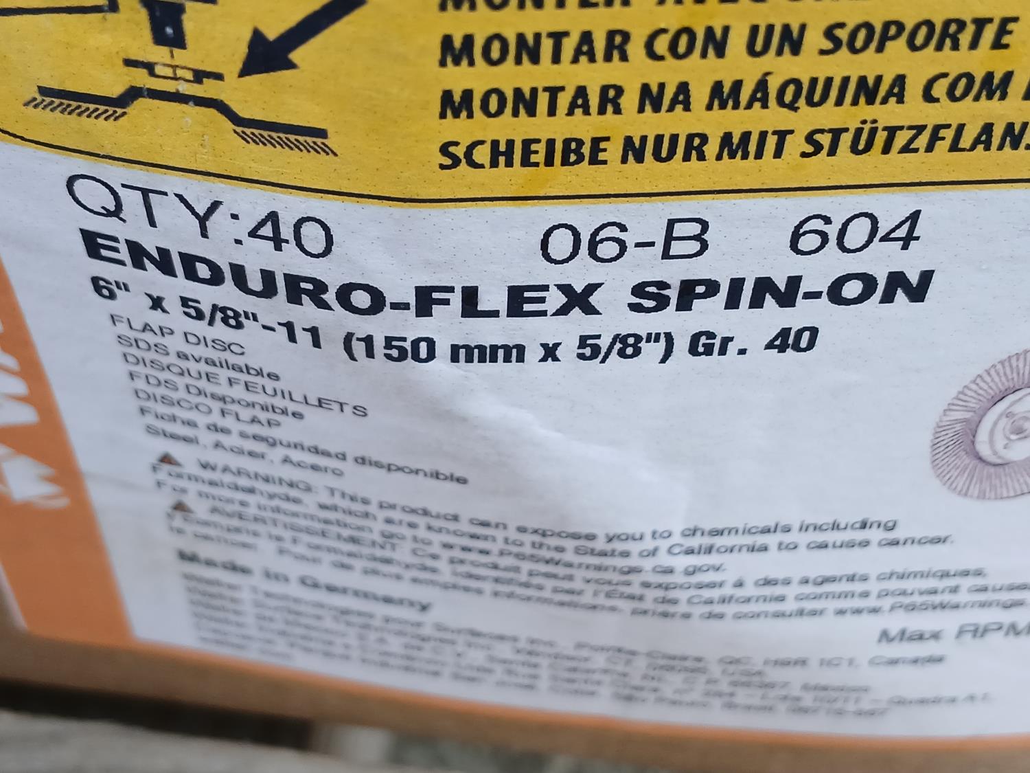 1 case (40) Walter 6 inch x 5/8 inch spin-on flap discs, 2 boxes (20) Walter 6 inch x 3/8 inch x 5/8 inch Wire brush discs.