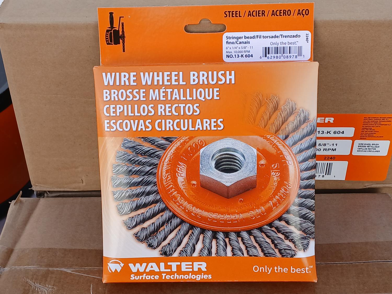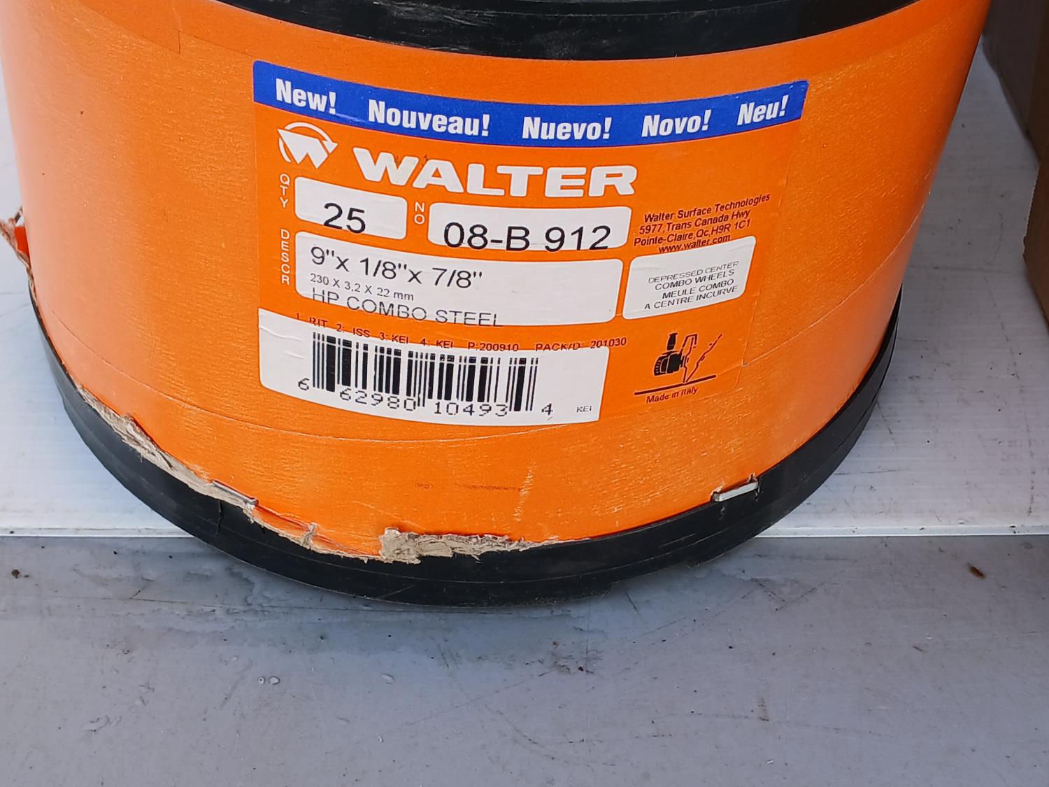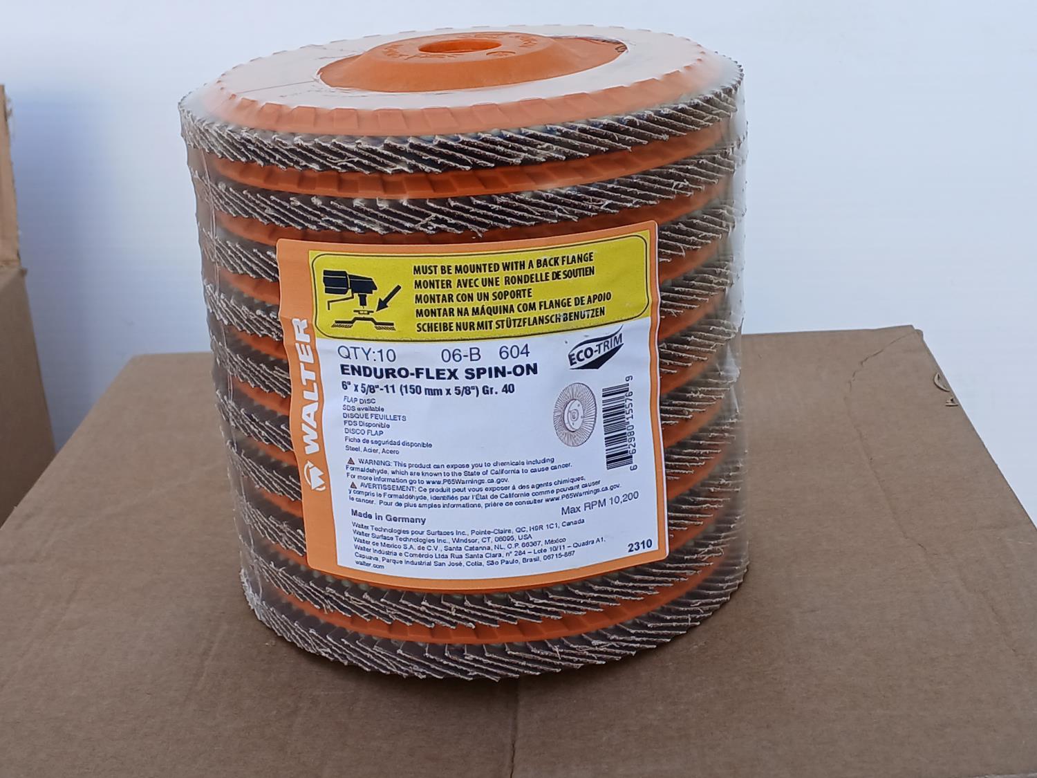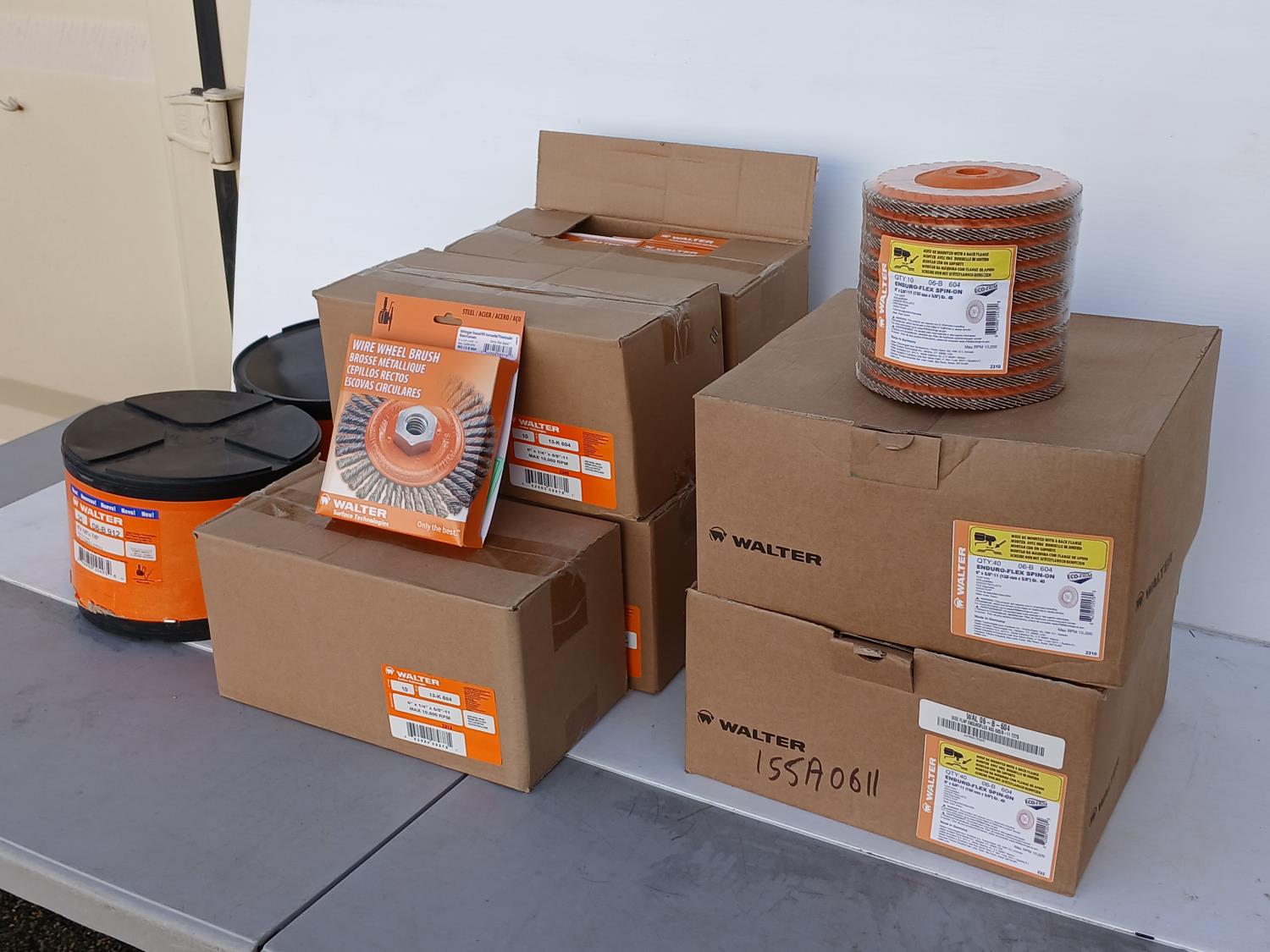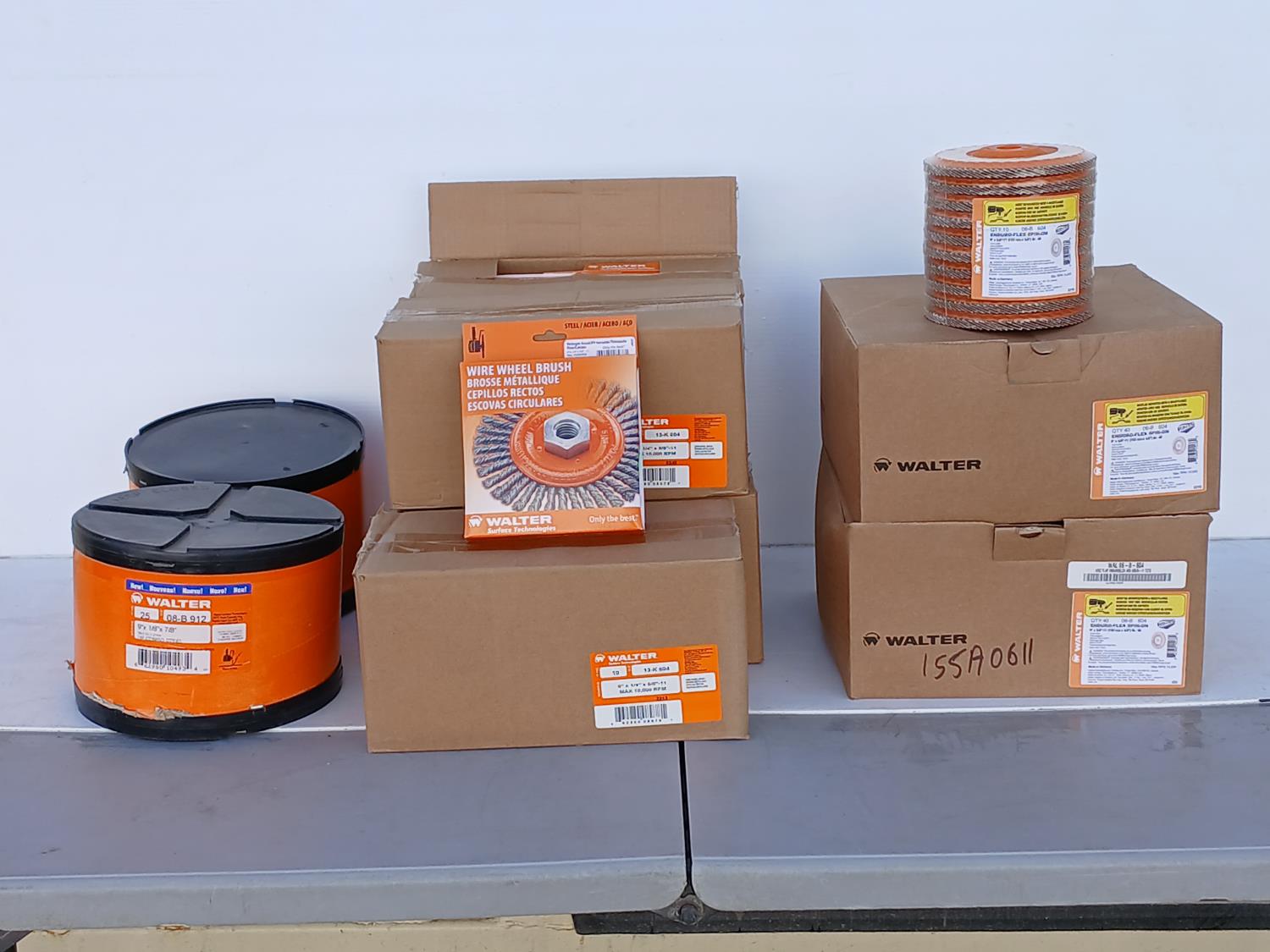 (80) Enduro Flex Spin on Flap discs (6 inch x5/8 inch ), (50) Walter Wire wheel stringer bead brush (6 inch x1/4 inch x5/8 inch ), (50) Walter Depressed center combo wheels (9 inch x 1/8 inch x 7/8 inch ).