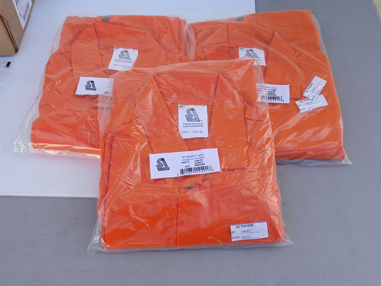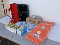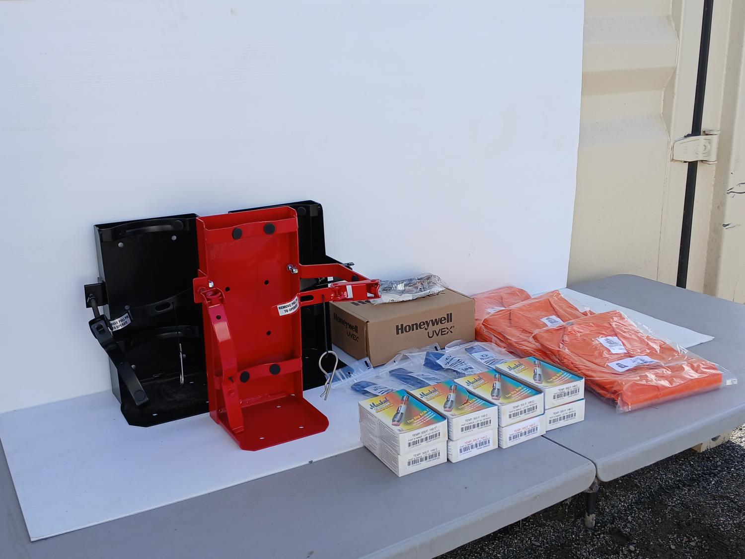 (3) size MED Weldlite jackets, (32) boxes Thermomelt heat sticks, (100) Dynamic sweatbands, (10)pair Honeywell UVEX safety glasses, (3) Fire extinguisher brackets ((2) black and (1) red).