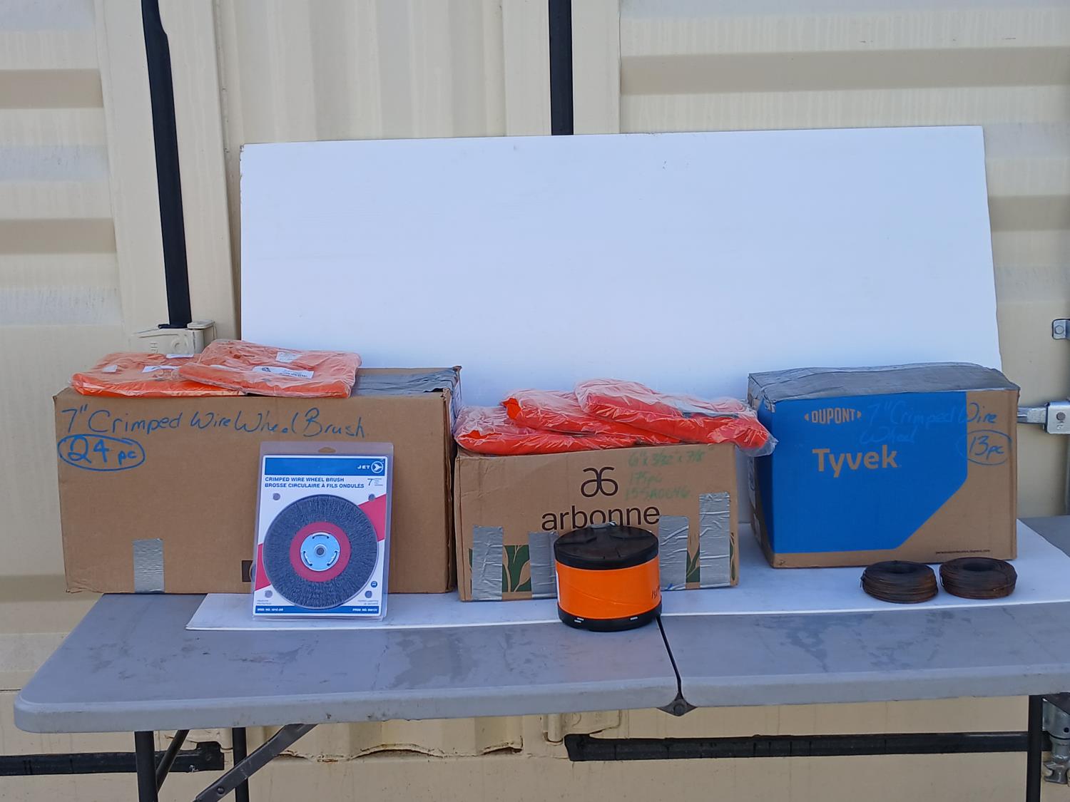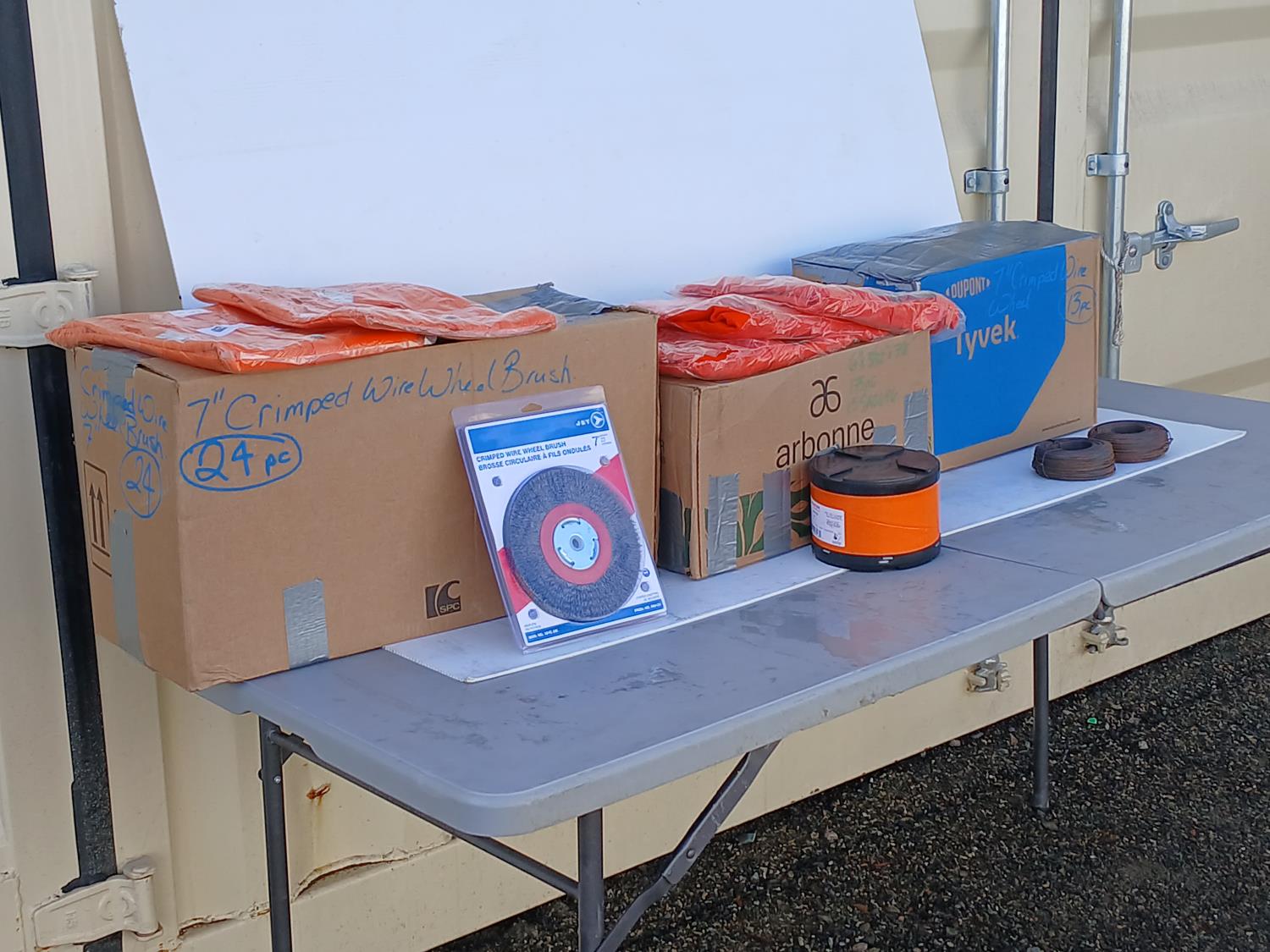 (5) size 2XL welding jackets, (37) Crimp wire wheels (7 inch ), (7) Walter depressed center grinding wheels (6 inch x 3/32 inch x 7/8 inch ), (20) spools Rebar tie wire (black).