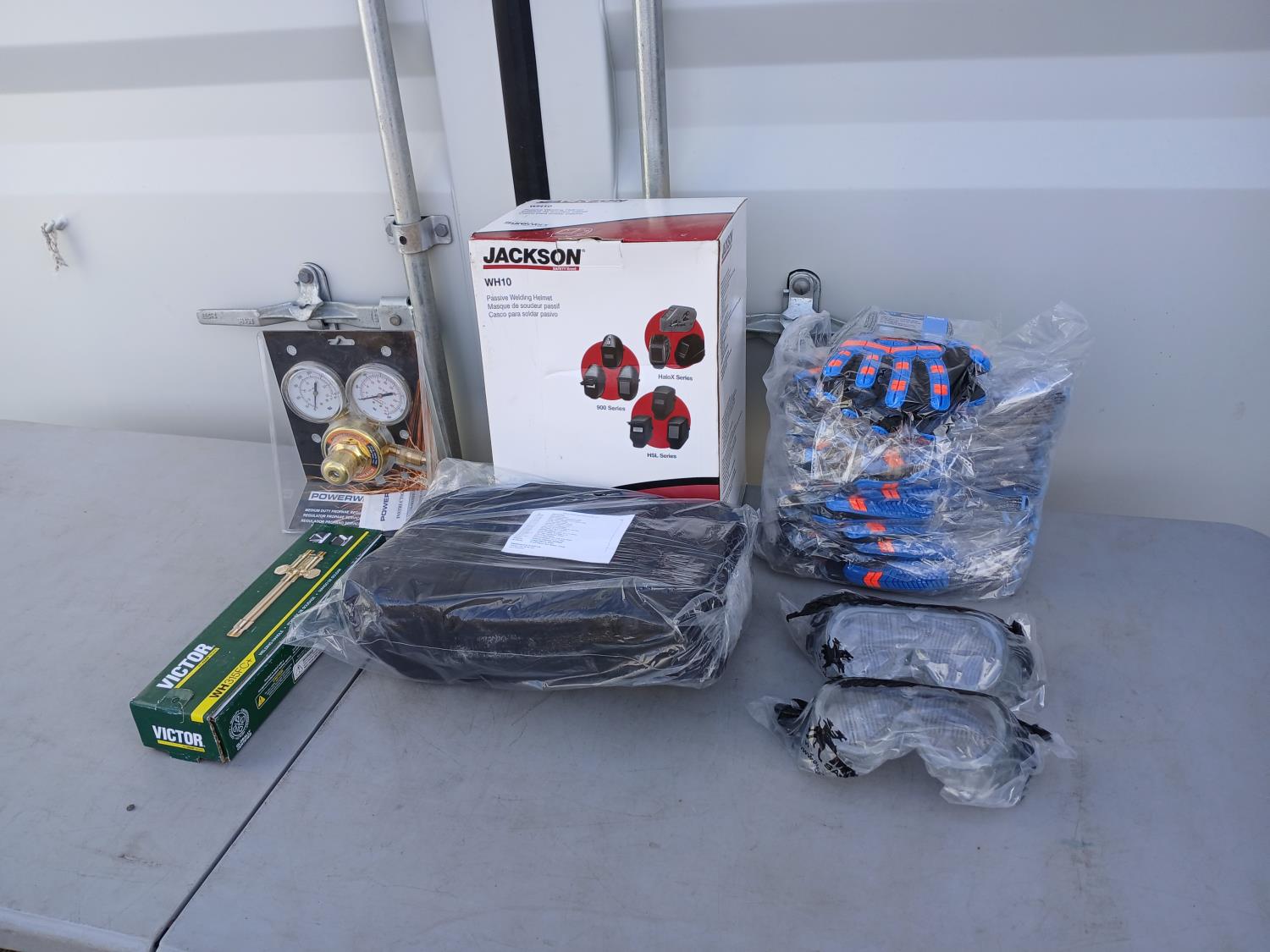 (2) Pair Safety Goggles, (1) Power Pro Med duty Propane regulator, (1) Victor Welding handle, (1) Jackson Welding Helmet, (10) pairs Cut-X gloves, (1) Redi-Medic EVR3 first aid kit.