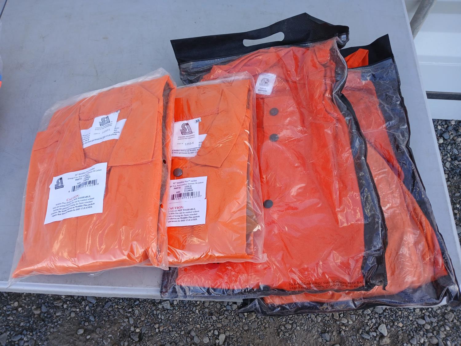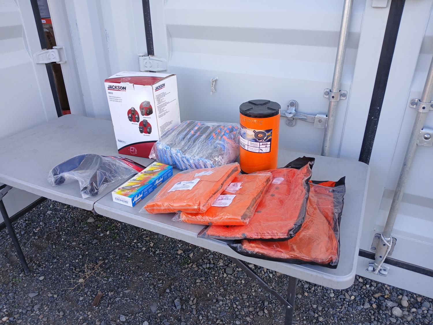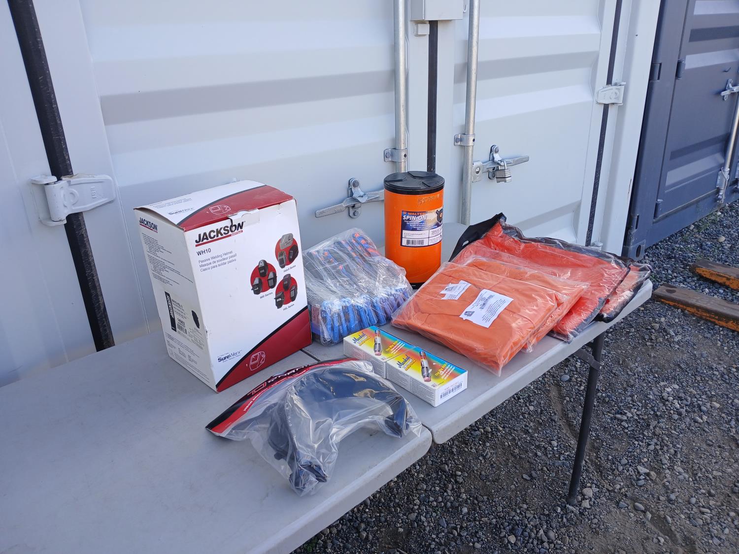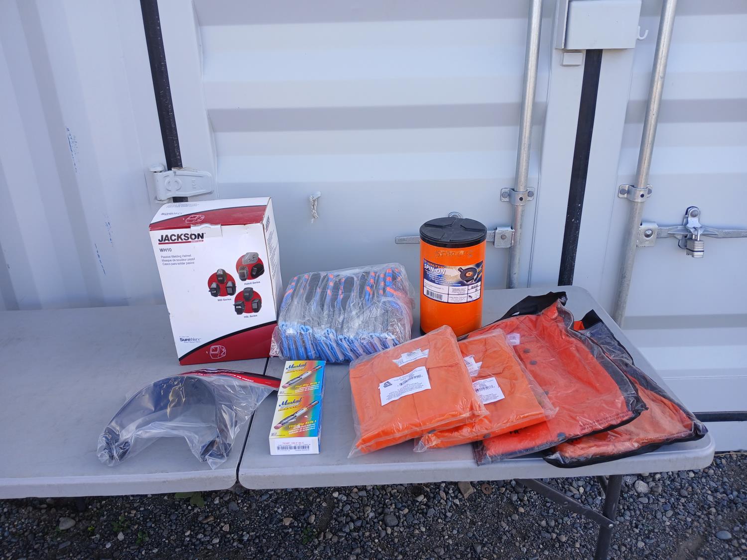 (1) Jackson Welding helmet, (5)0 Walter 6 inch x3/32 inch x7/8 inch depressed center grinding wheels, (2) boxes Pumper rechargeable paint markers, (1) PowerWeld Med duty propane regulator, (2) Steiner welding jackets, (2) Steiner Leather sleeve welding jacket, (12) pairs X-Cut impact/cut resistant gloves.