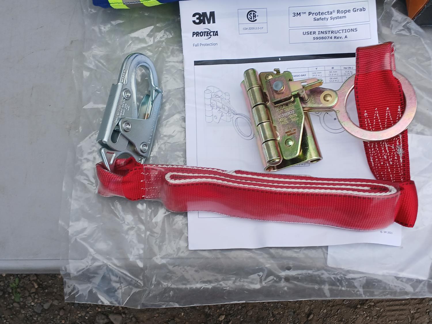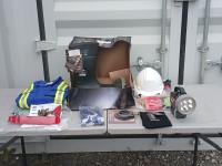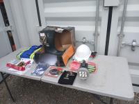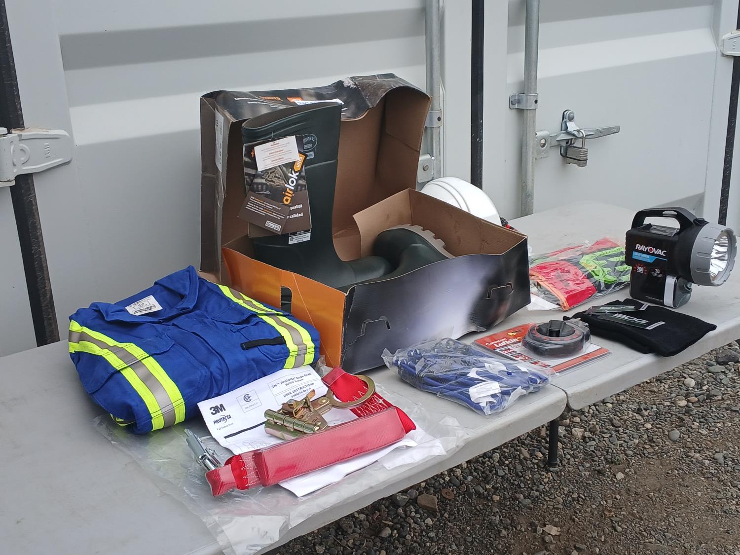 (1) pair size 10 Pioneer Air Lok Ultra Boots, (1) pair size 44 Avenger High visibility coveralls, (1) 3 M Protecta Rope grab, (1) bag of 10- 18 inch Bungee cords, (1) 50 ft (15 m) Luftkin Tape measure, (2) pairs Superior Chem Stop gloves, (1) LED 6 volt Lantern, (2) BDG classic neck warmers, (1) white Dynamic hard hat.