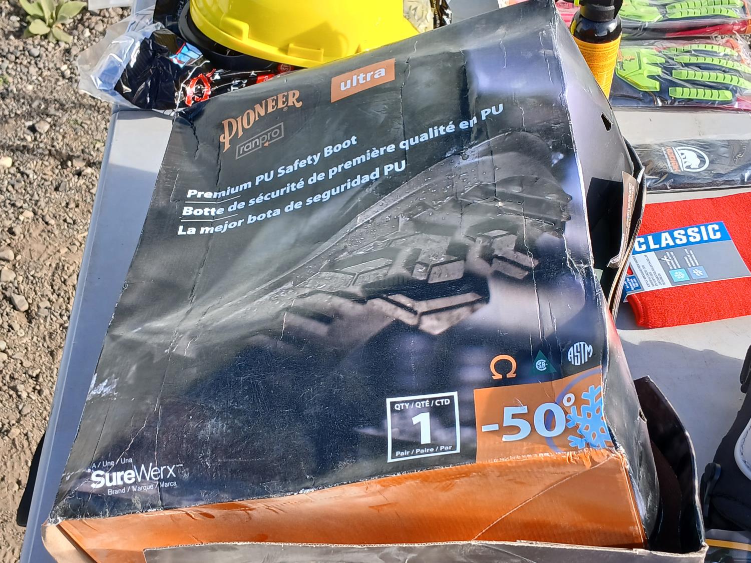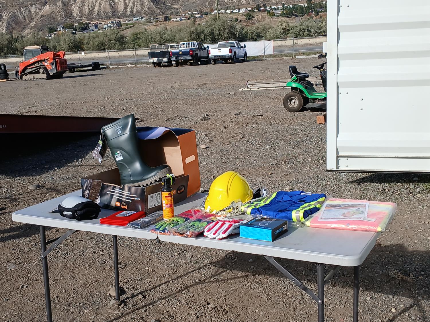 (1) pair Pioneer Ranpo size 11 Ultra -50 degrees boots, (2) pairs Superior cut/impact resistant chemical gloves, (1) pair Watson Van Goat impact protection gloves, (1) pair size 48 Avenger high visibility coveralls, (1) size XL Flame/Water resistant jacket, (1) pair Kuny's hard shell knee pads, (1) Dynamic yellow hard hat, (1) pair Ice Trekkers, (1) bear spray with holster, (2) BDG Classic neck warmers. s.