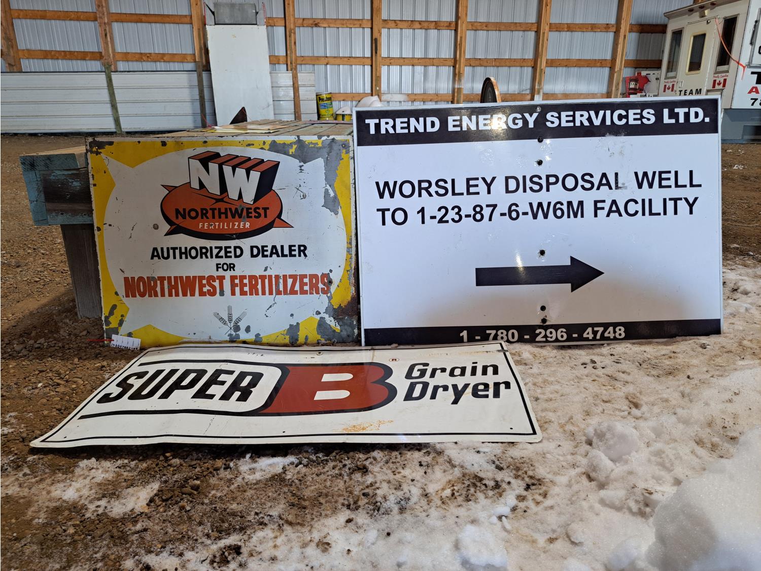Super B grain dryer sign, northwest fertilizer sign and trend energy services ltd
