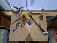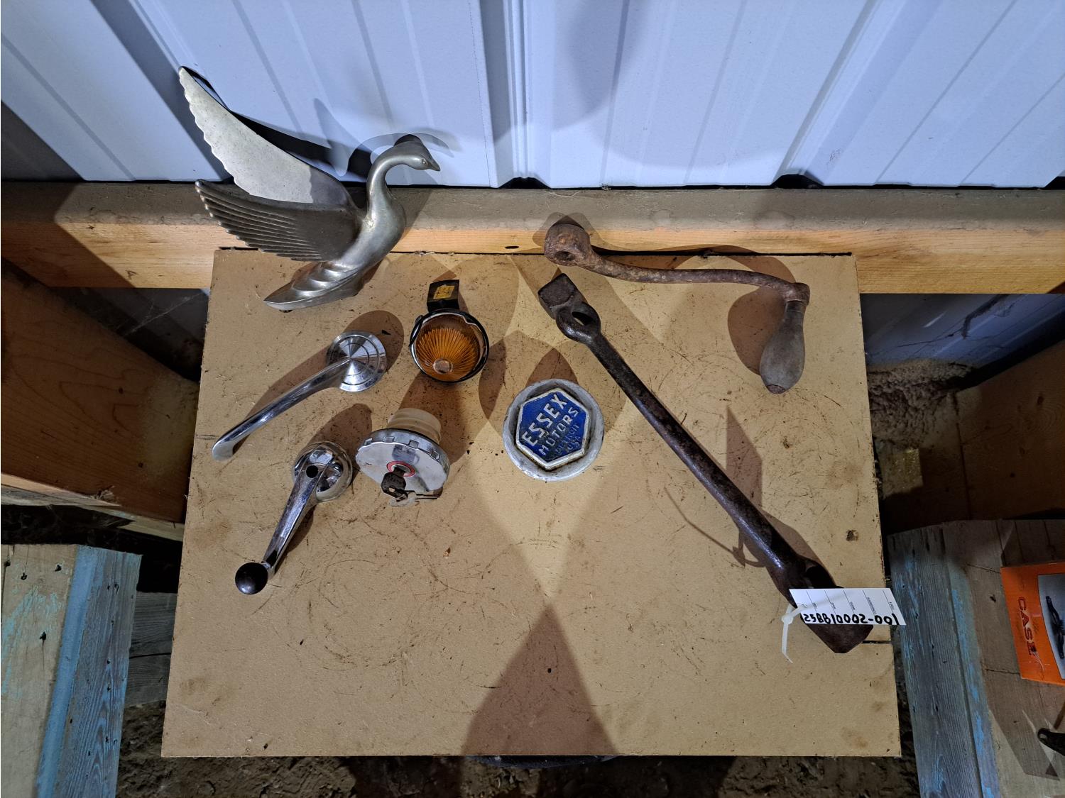 model T wrench, 1937 swan chrome hood ornament, (2) gas caps (1) with key, door and window handle, crank, beehive auto light
