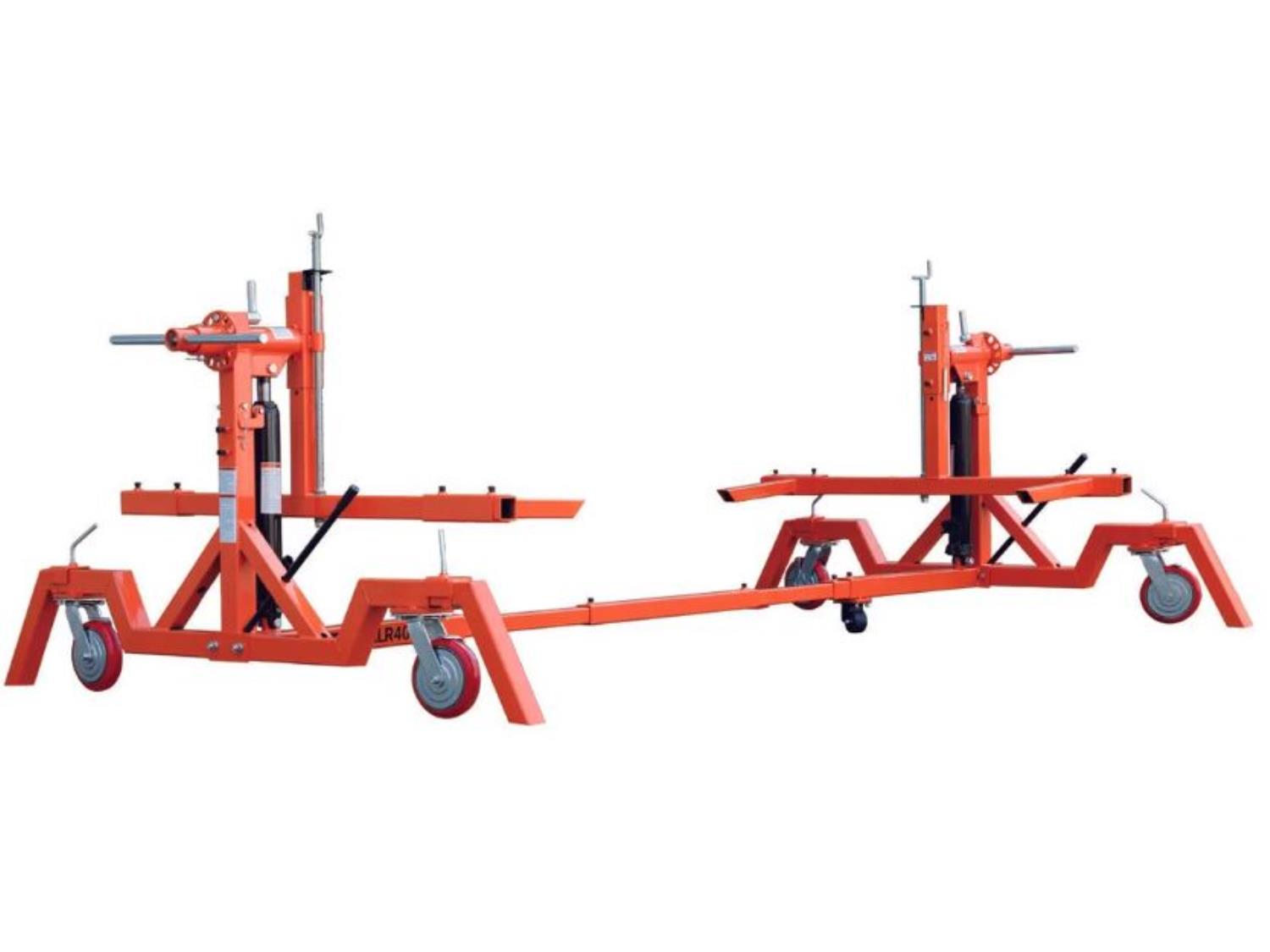 For heavy-duty vehicle restoration and maintenance, dual hydraulic cylinders, 8” locking casters, 22 ft working length,