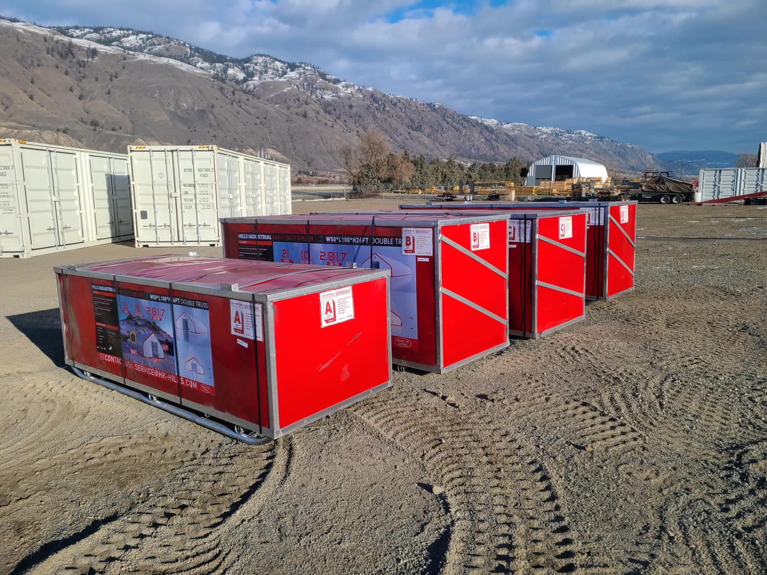 Double truss, 10 ft truss spacing, 21 oz PVC fabric, peak ceiling, 2.4 inch tubing, total weight of four crates 10,352 lb