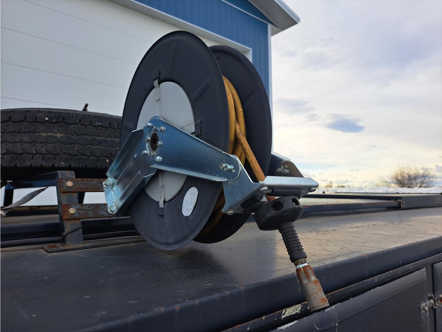 V8 gas engine 5 speed transmission, rear trailer hitch, aluminum service body, air hose reel, spare tire, 235/85R16 tires