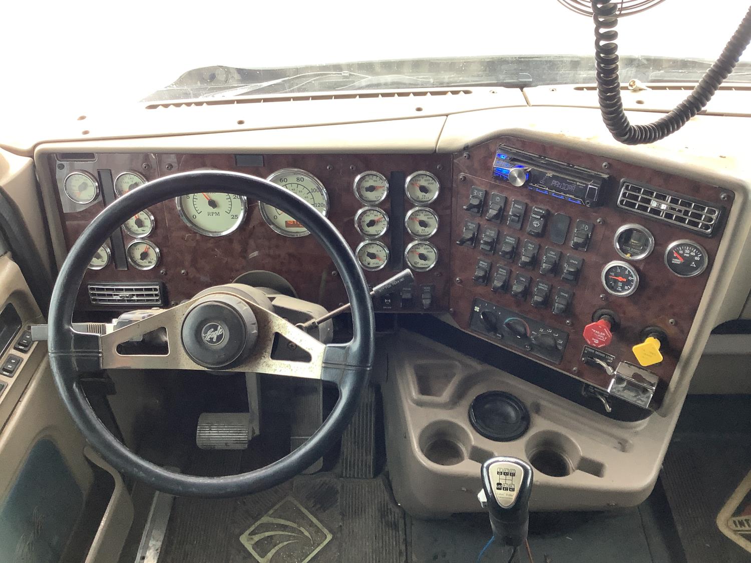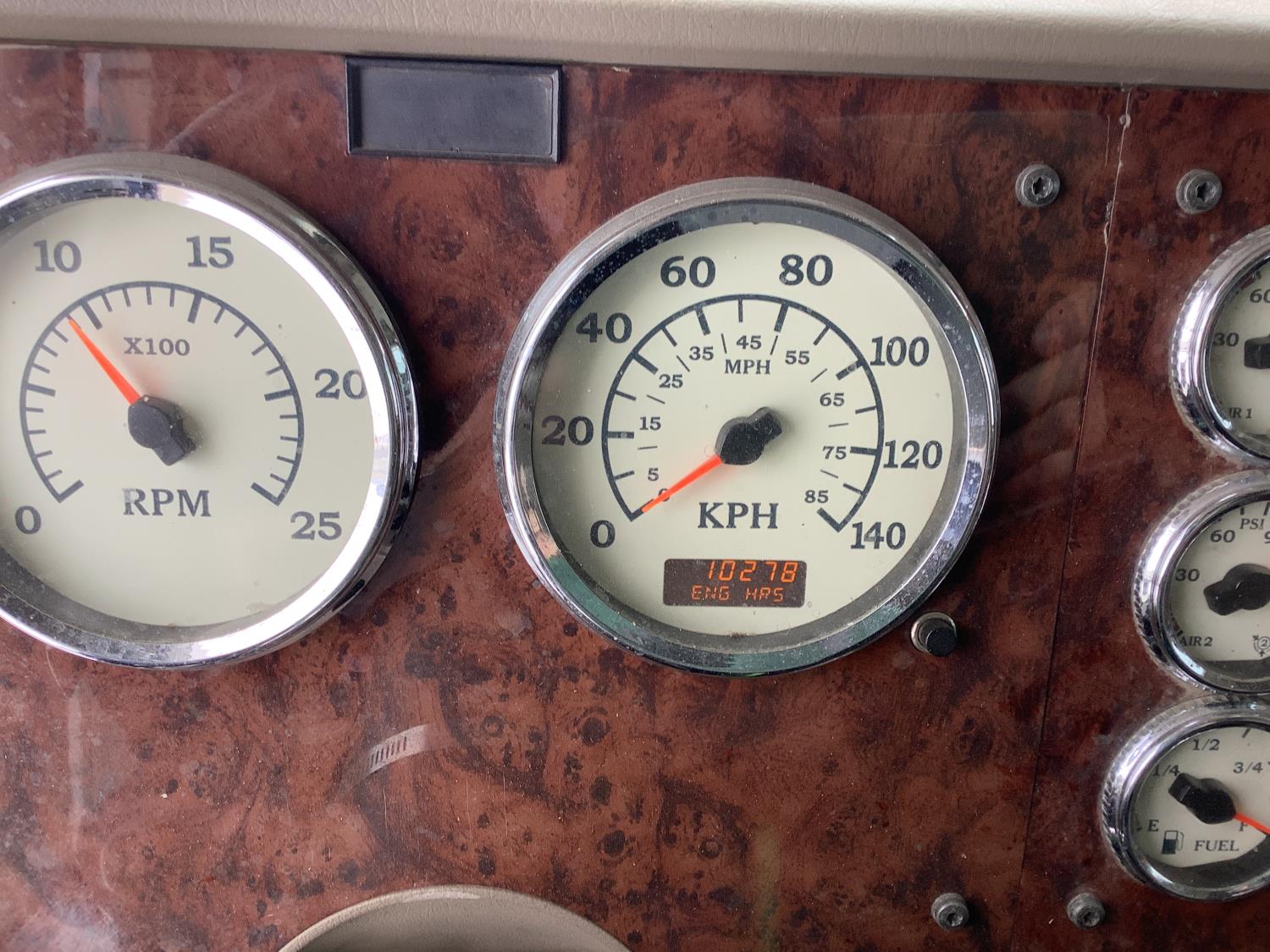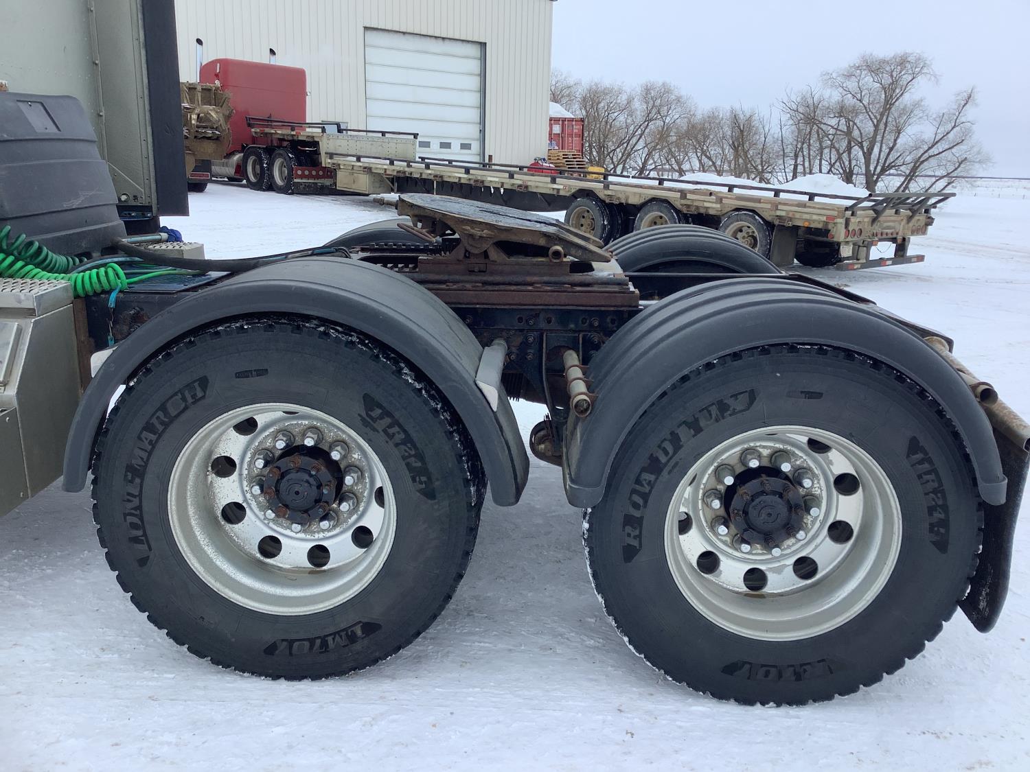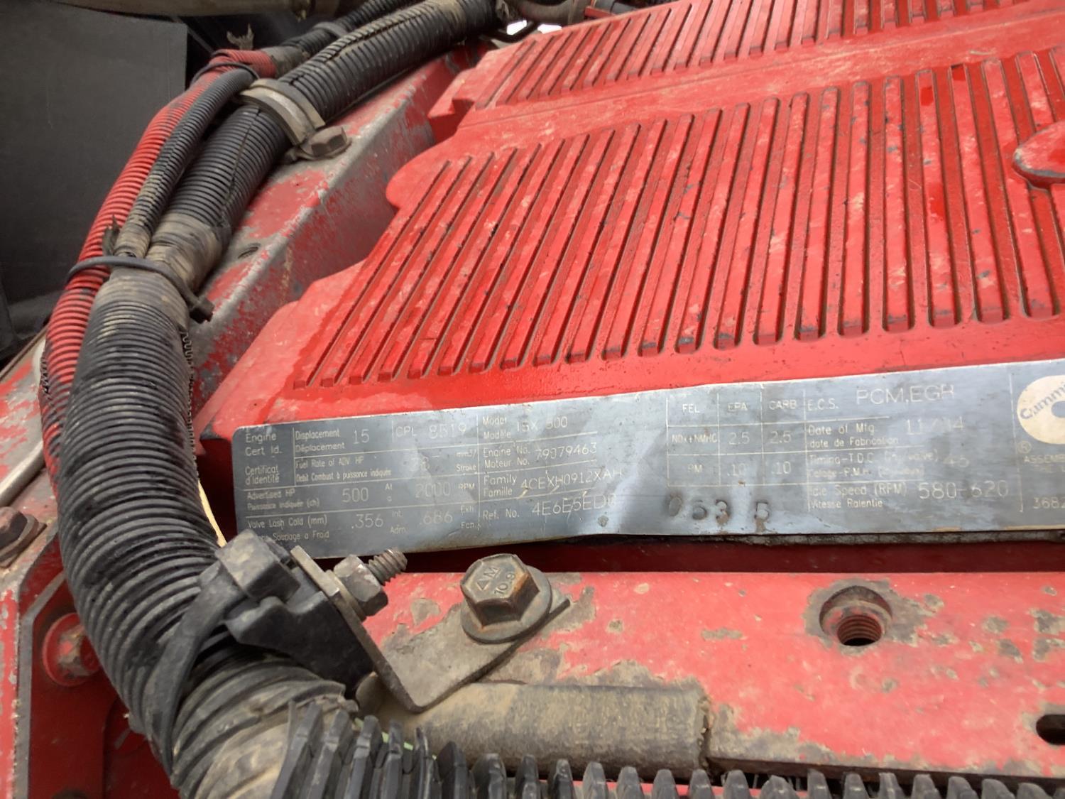 Cummins ISX 500 15 L 6 cylinder 500 HP engine, engine brake, Eaton Fuller 18 speed manual transmission, mid rise 72 inch sleeper, air ride seats, Eagle package, air ride cab, hydraulic wet kit, beacons, air slide raised 5th wheel, step tool box, air ride suspension, 12,000 lb front axle, full lockers, super 40000 rears, 1/2 moon rear fenders, all aluminum wheels, 11R24.5 tires