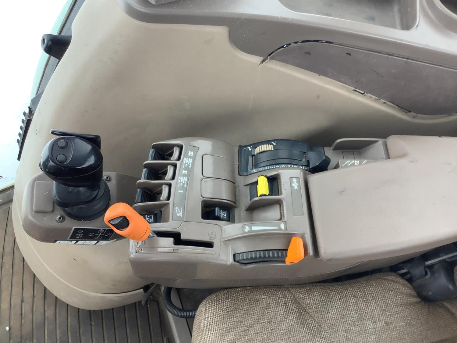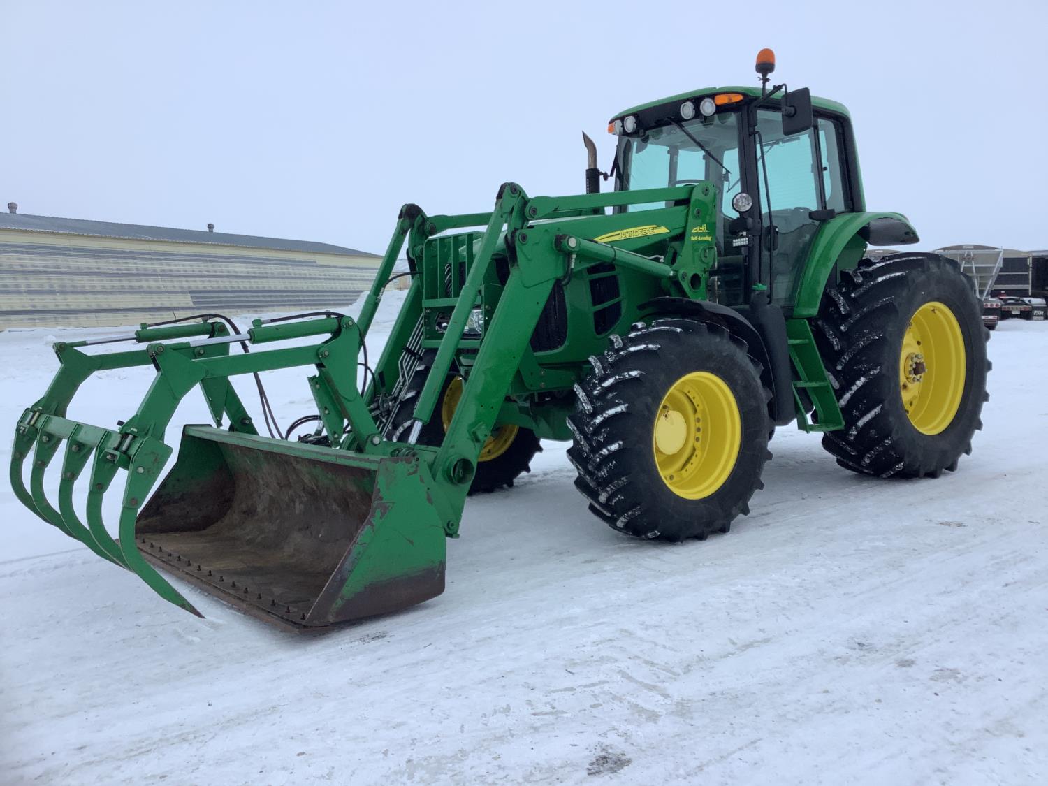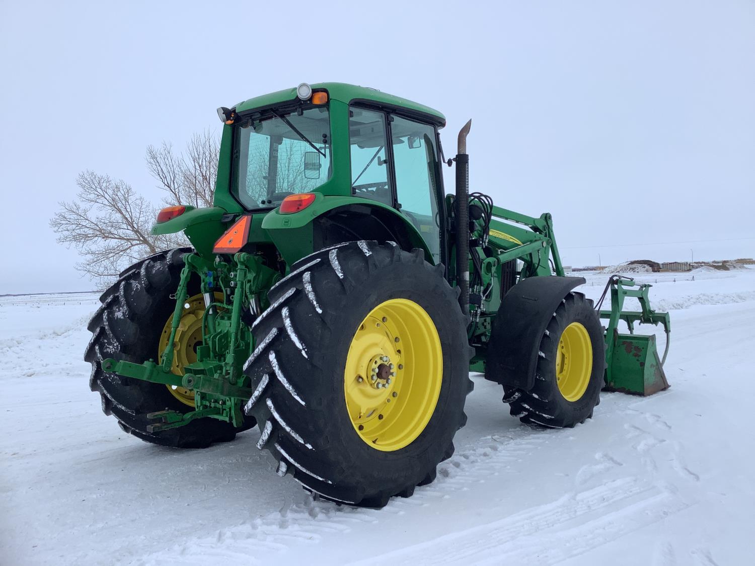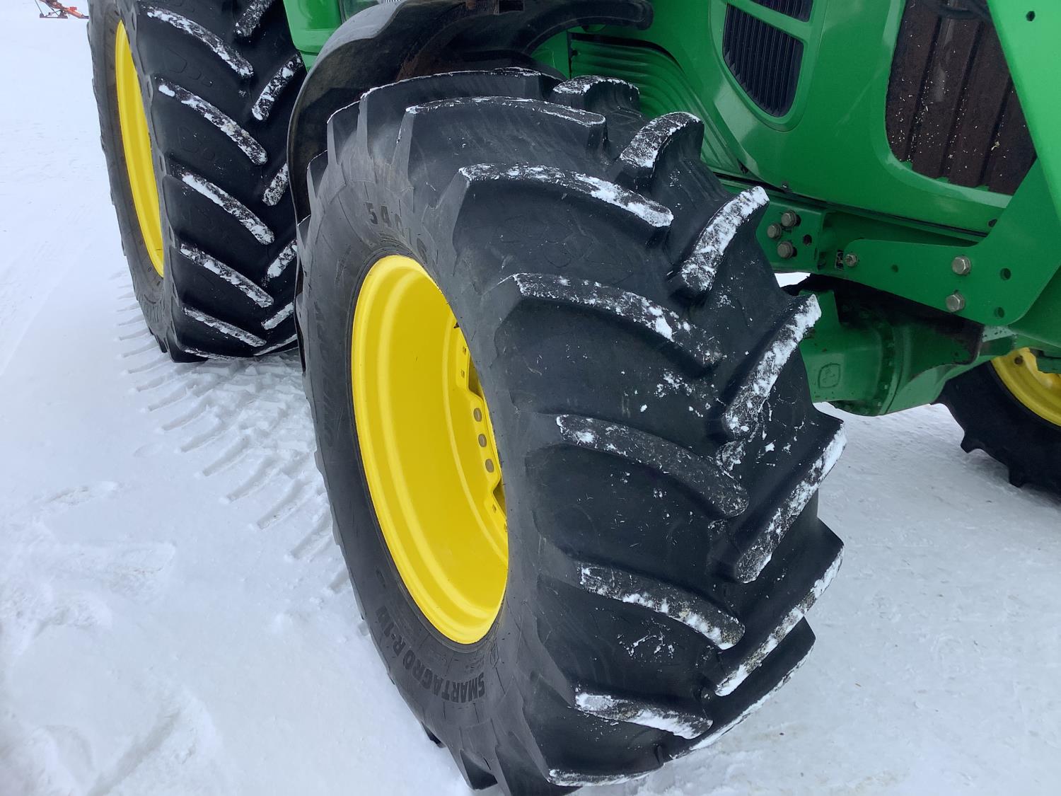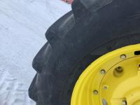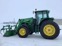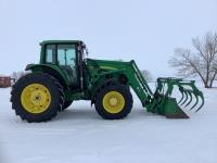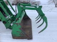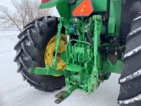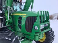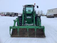 John Deere 741 Self levelling loader, Q/A, bucket, grapple, mid mount hydraulic connection, John Deere 6.8 6 166 HP, engine, 140 PTO HP, IVT transmission, front grill guard, cab, left hand reverser, joystick, A/C, radio, buddy seat, 540/1000 PTO, 3 point hitch, 3 rear hydraulic outlets, 540/65R28 front tires, 650/65R38 rear tires, front fenders