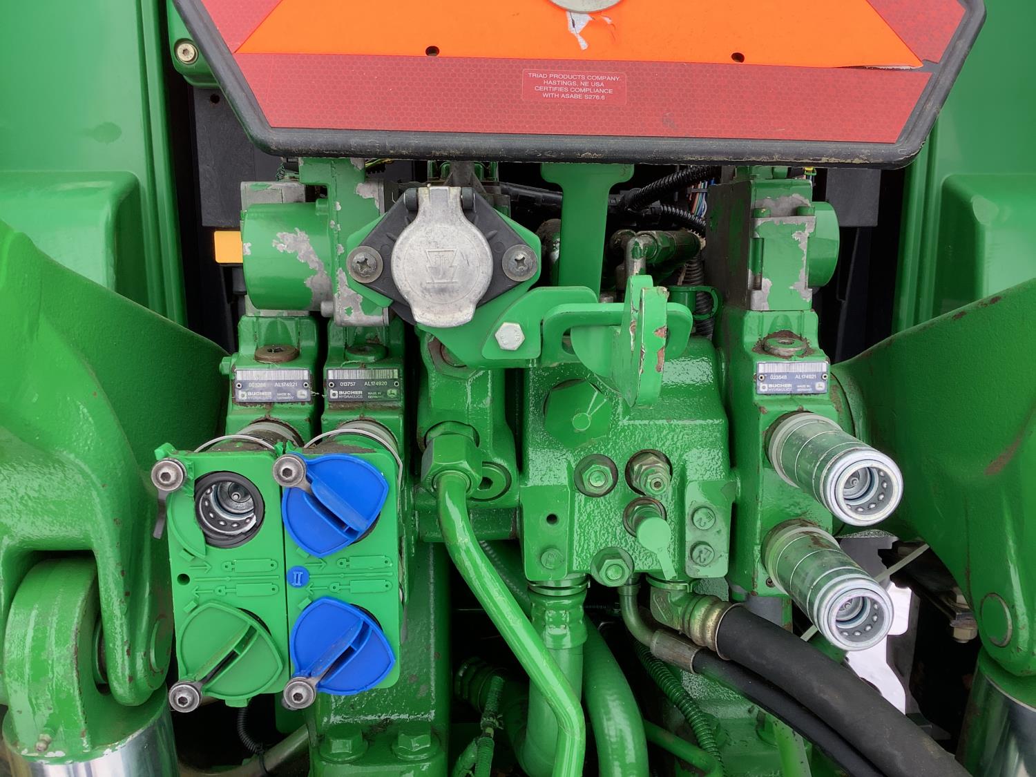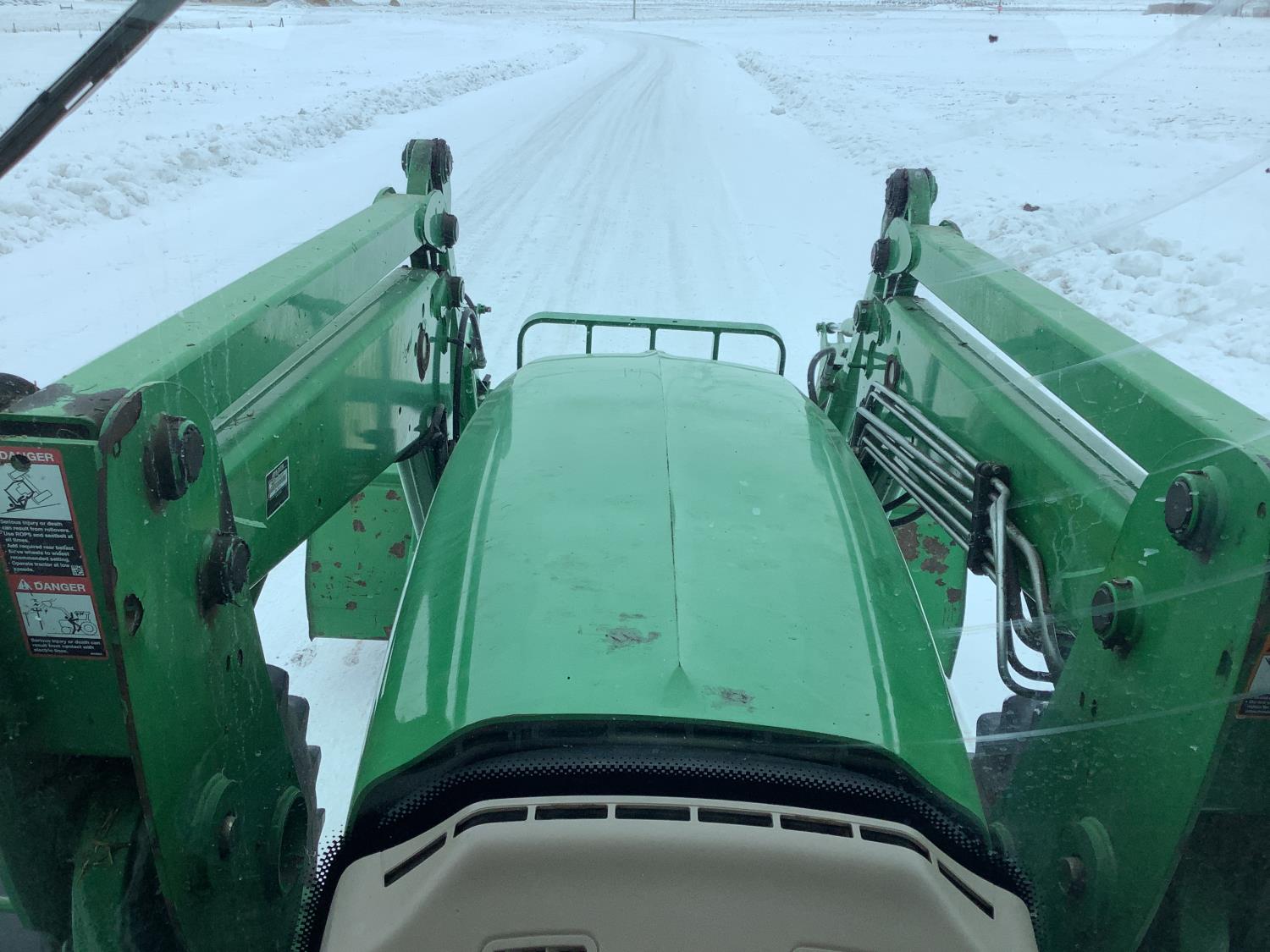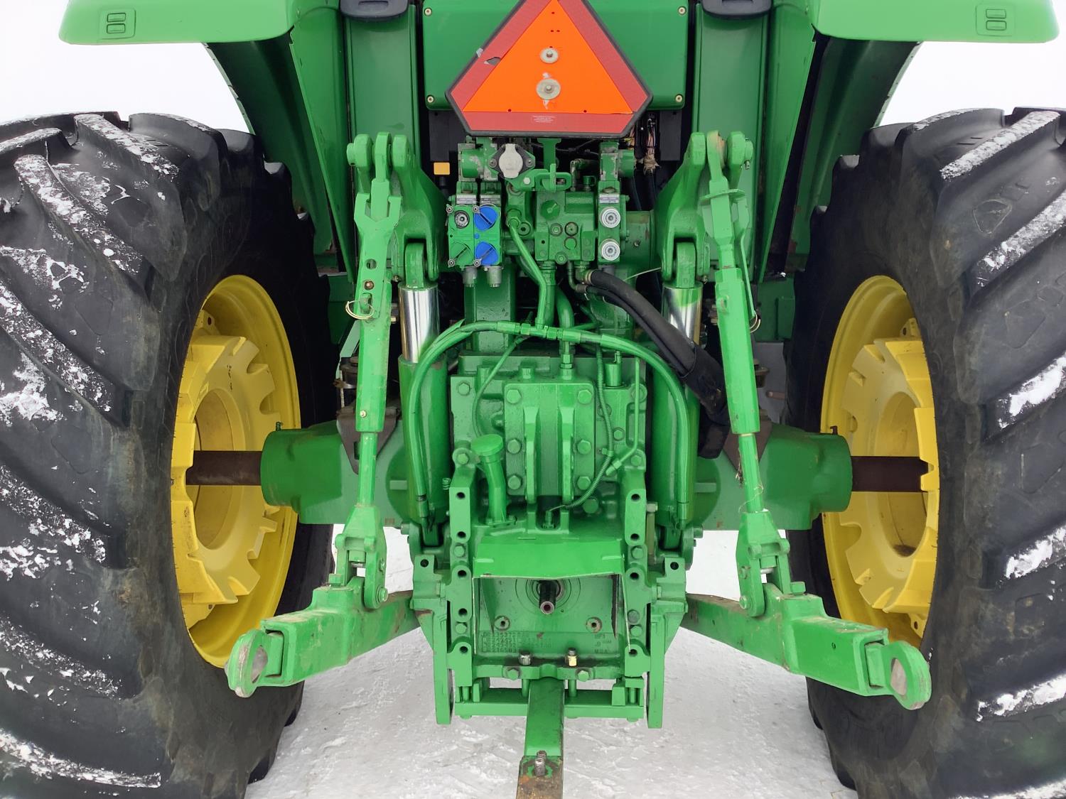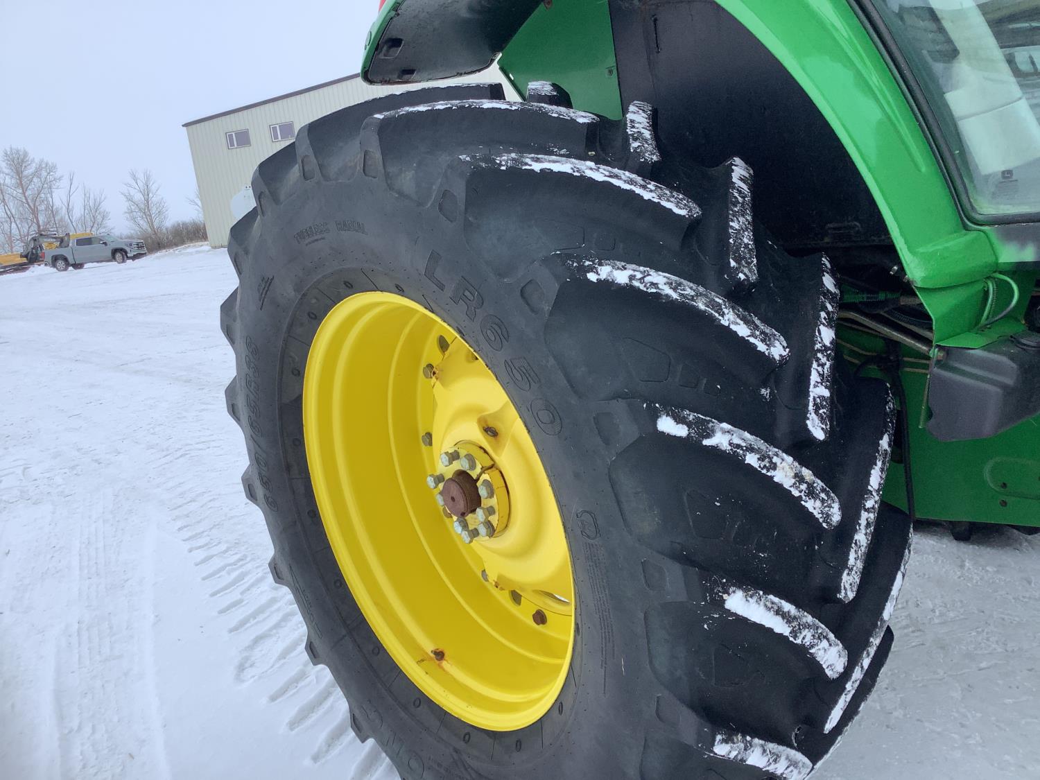 John Deere 741 Self levelling loader, Q/A, bucket, grapple, mid mount hydraulic connection, John Deere 6.8 6 166 HP, engine, 140 PTO HP, IVT transmission, front grill guard, cab, left hand reverser, joystick, A/C, radio, buddy seat, 540/1000 PTO, 3 point hitch, 3 rear hydraulic outlets, 540/65R28 front tires, 650/65R38 rear tires, front fenders