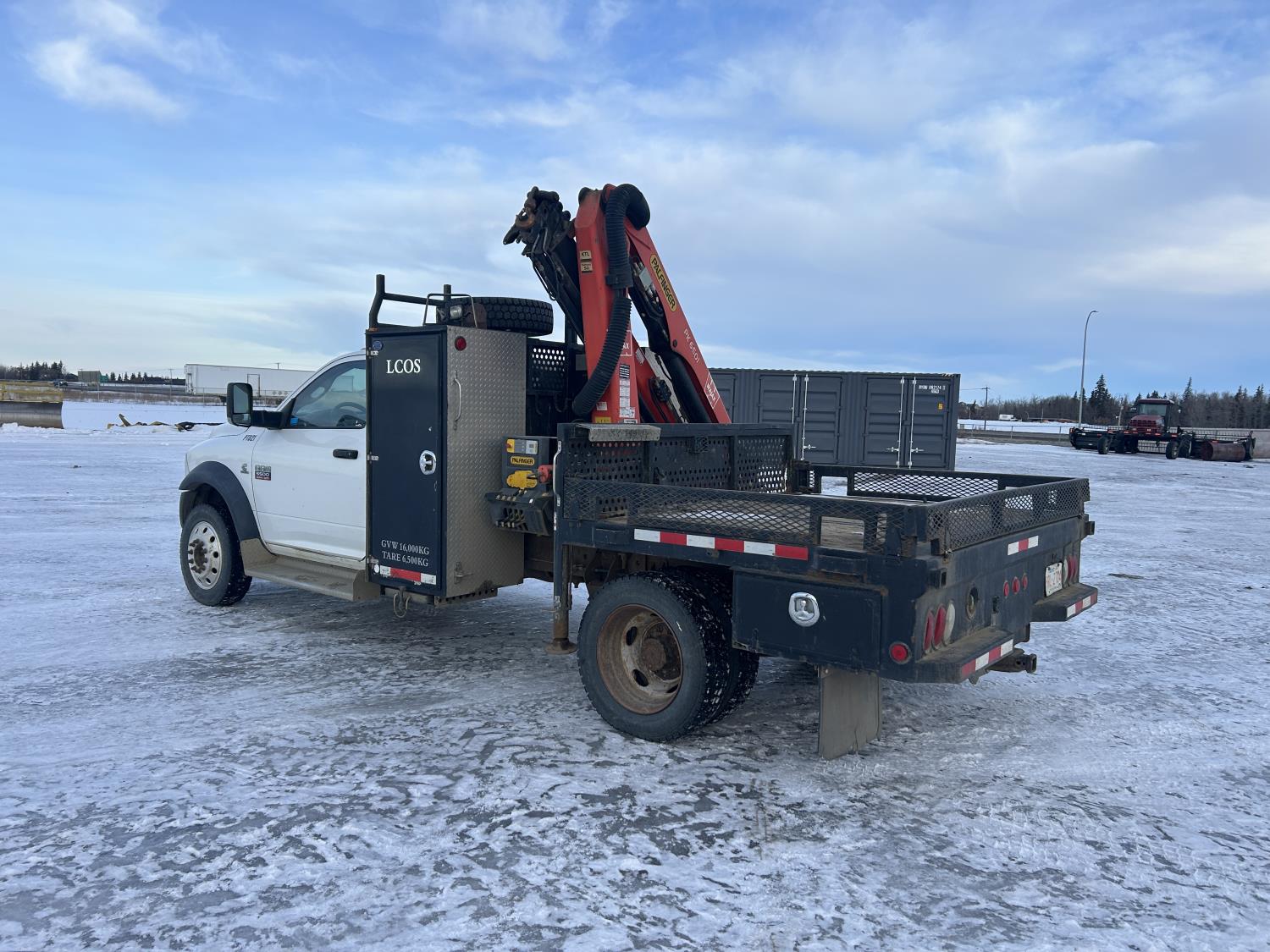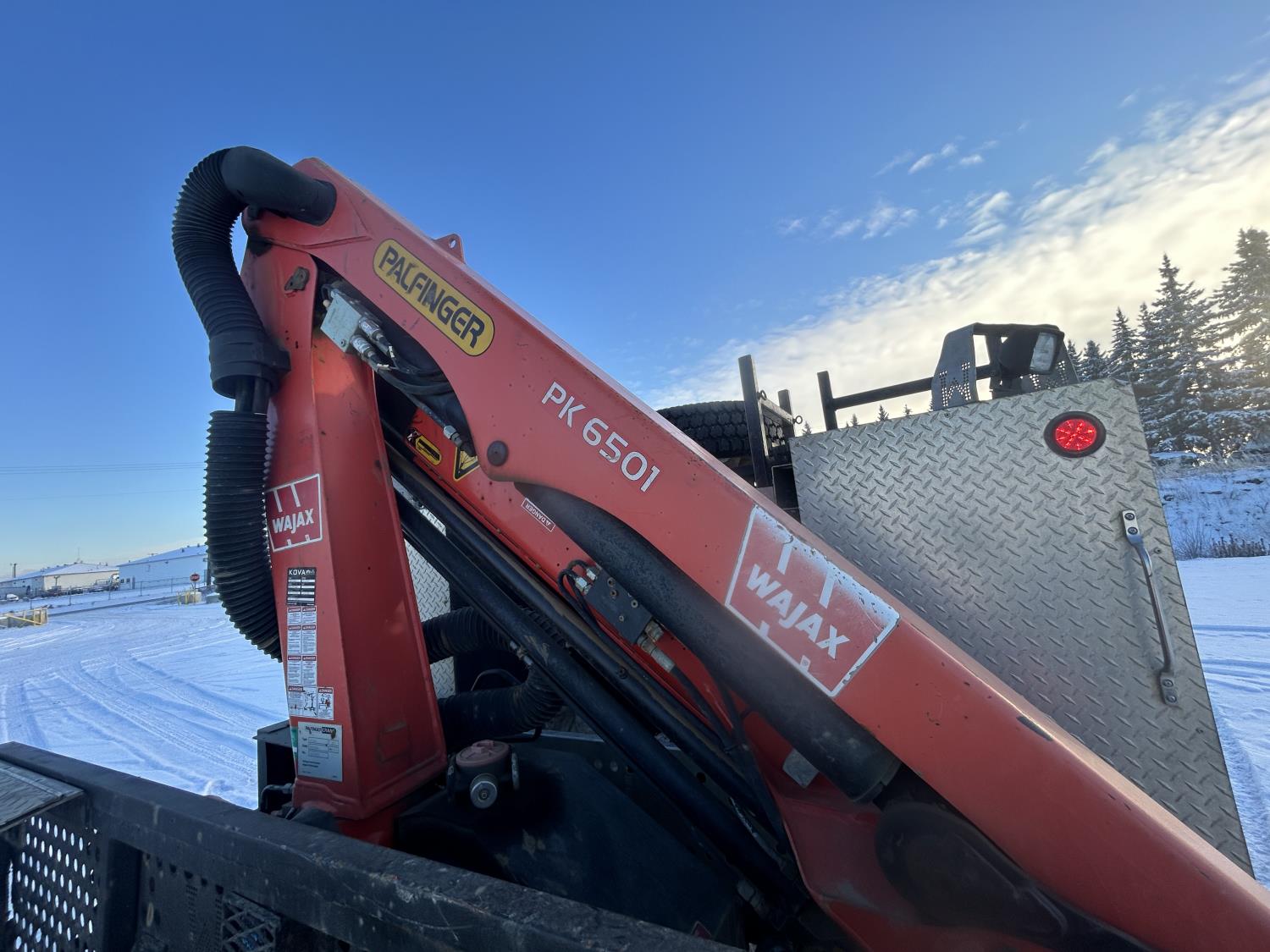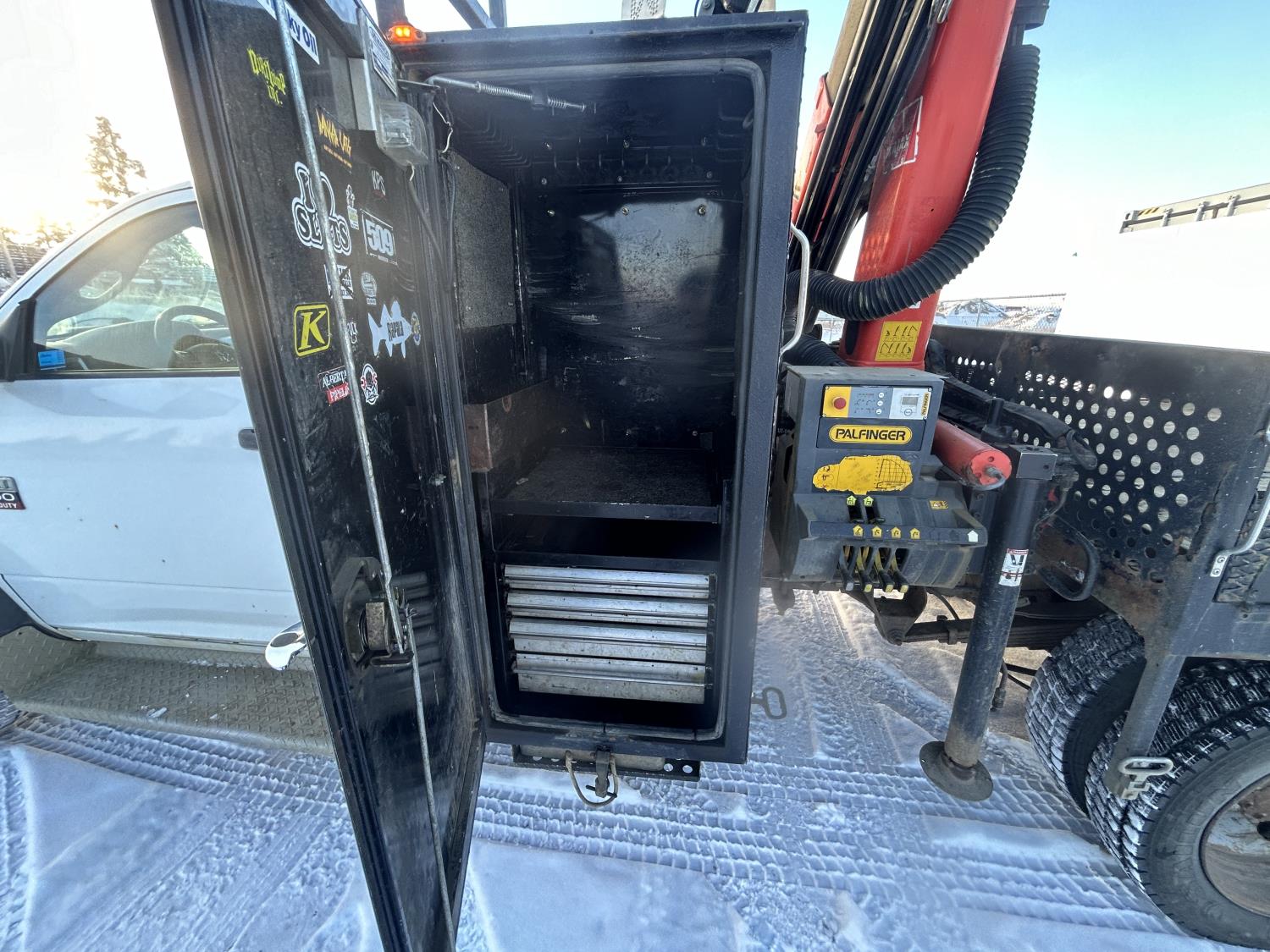Cummins 6.7 L diesel engine, DEF required, automatic transmission, A/C, P/W, P/L, cruise control, stereo, running boards, steel tool boxes, 90 inch x 72 inch deck, Palfinger PK6501 knuckle crane, outriggers, 225/70R19.5 tires