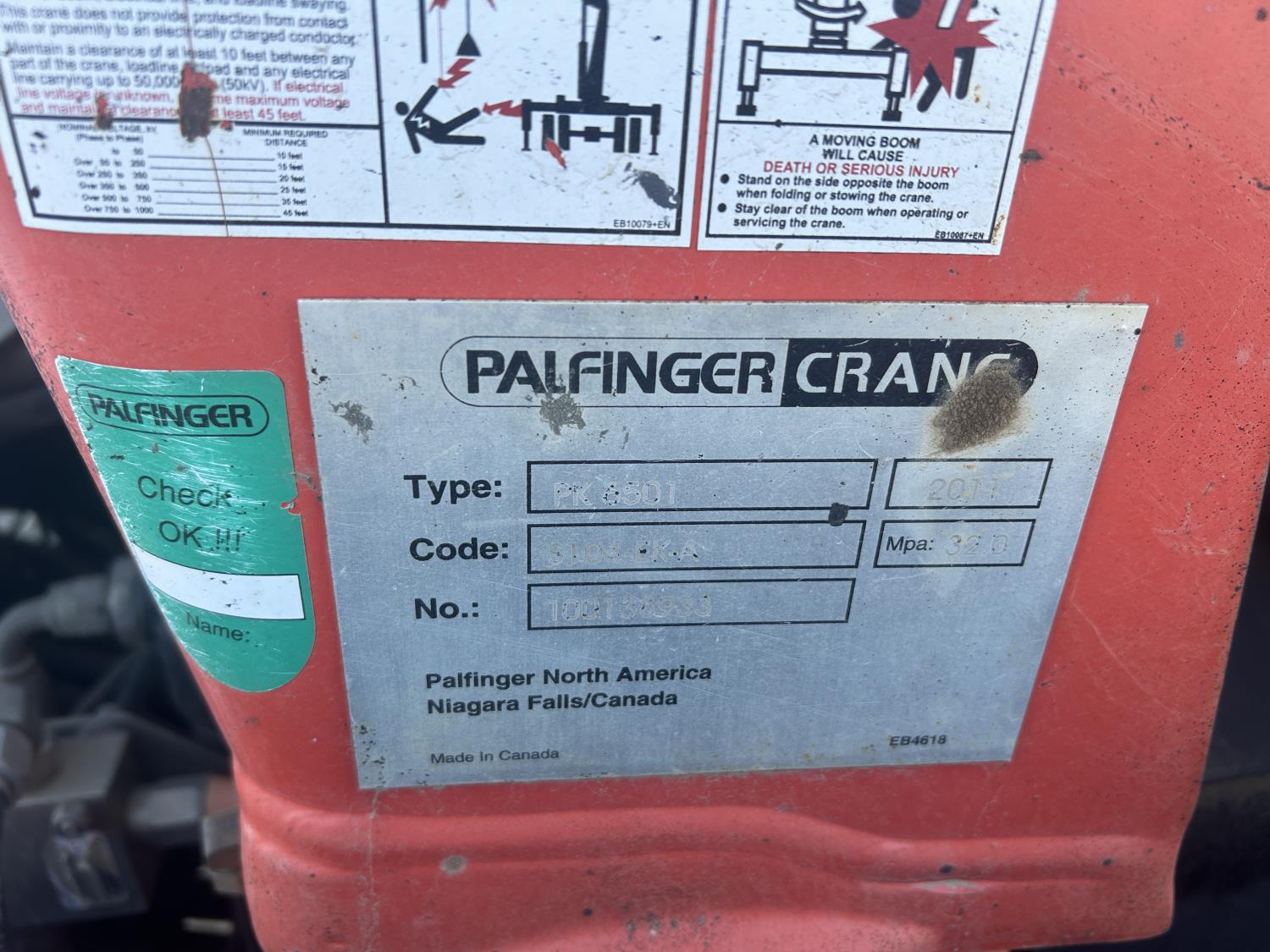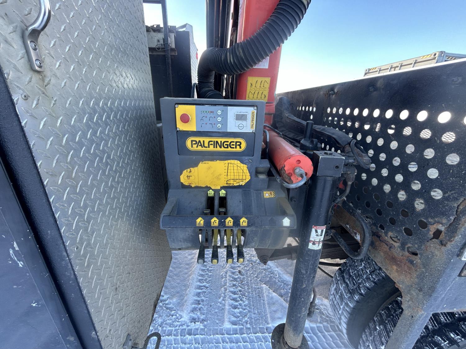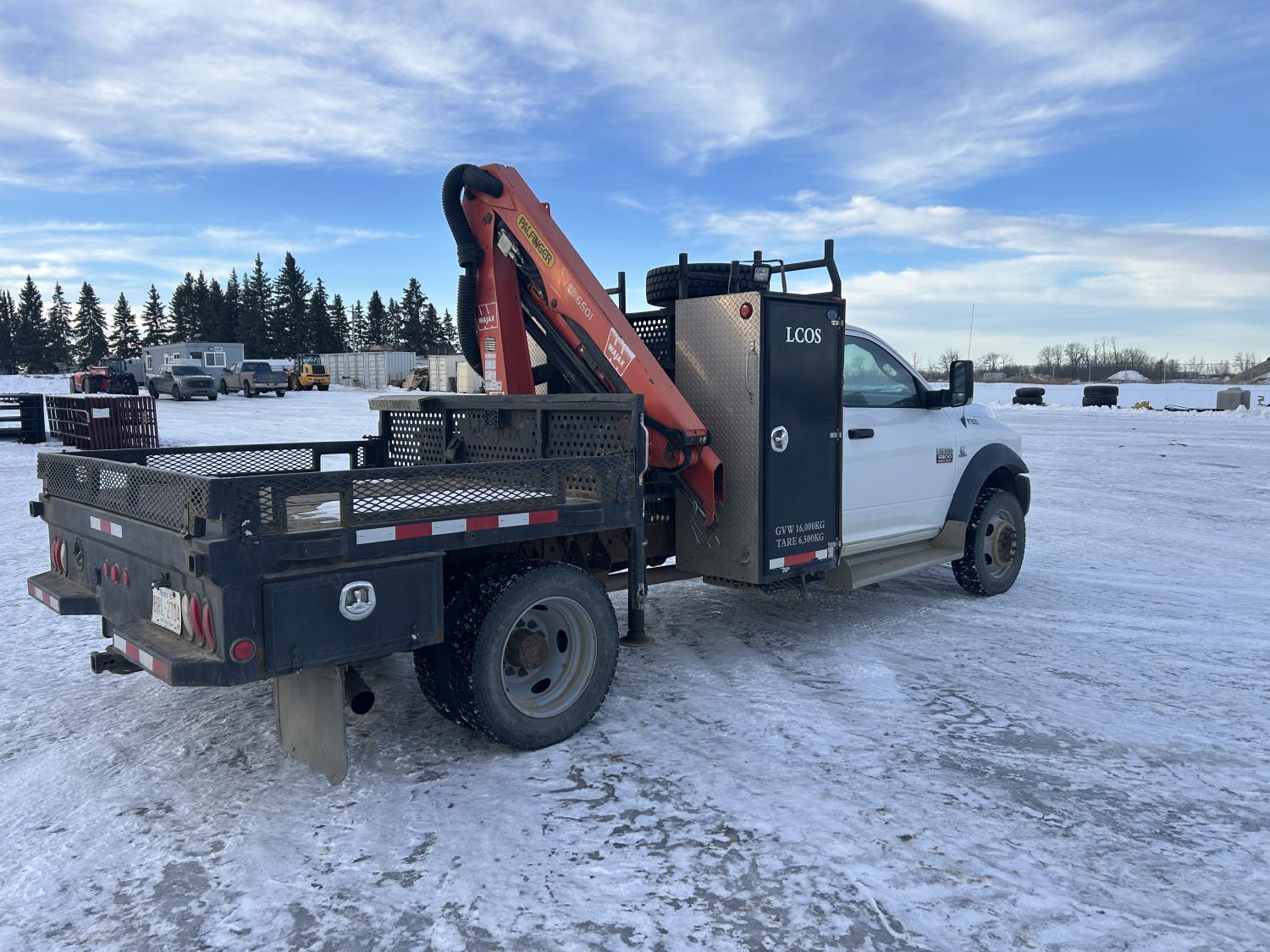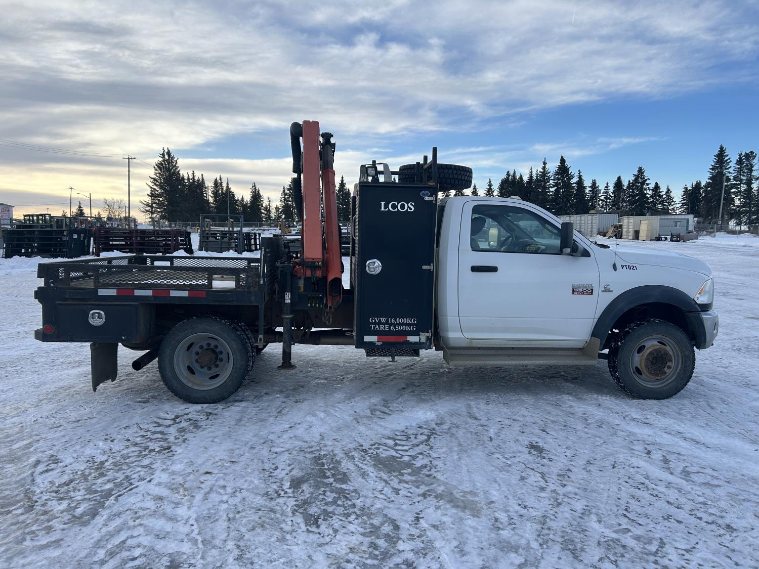 Cummins 6.7 L diesel engine, DEF required, automatic transmission, A/C, P/W, P/L, cruise control, stereo, running boards, steel tool boxes, 90 inch x 72 inch deck, Palfinger PK6501 knuckle crane, outriggers, 225/70R19.5 tires