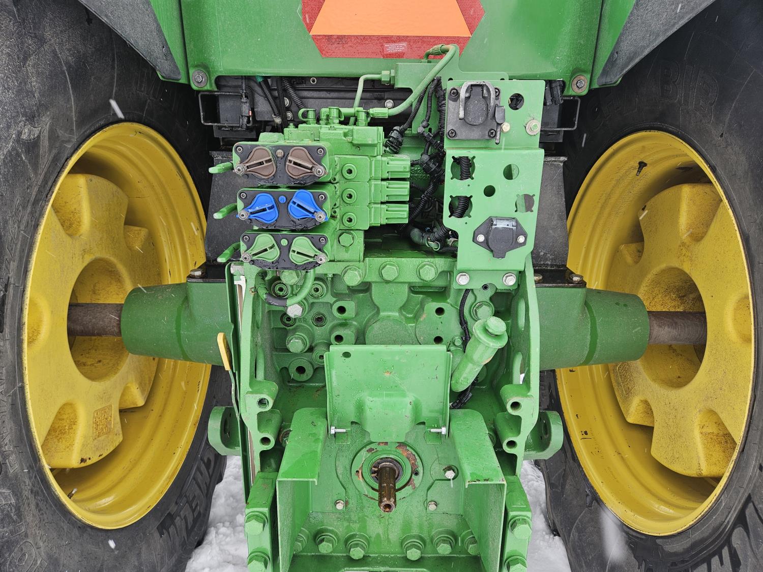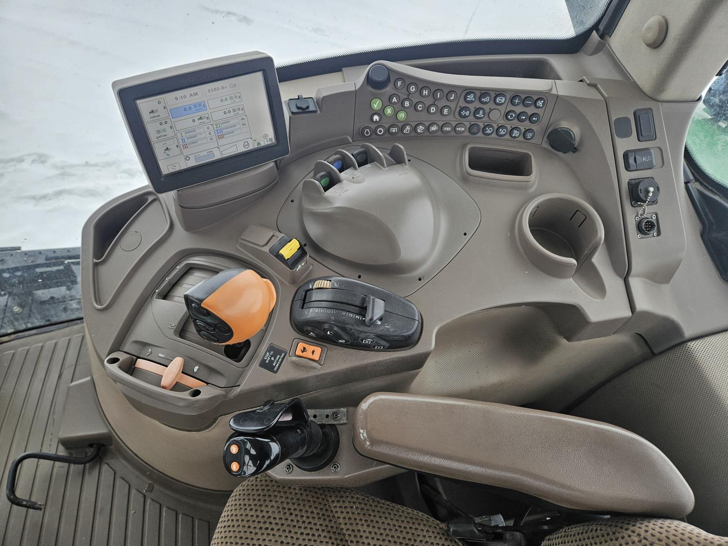 John Deere H480 loader, 96 inch Q/A bucket, grapple, joystick, 6.8 L 6 cylinder 200 HP, diesel engine, DEF required, 20 speed power shift transmission, left hand reverser, cab, A/C, radio, buddy seat, Integrated GPS, Green Star 3, 540/1000 PTO, 3 rear hydraulic outlets, 600/70R30 front tires, front fenders,, 710/70R42 rear tires, rear wheel weights