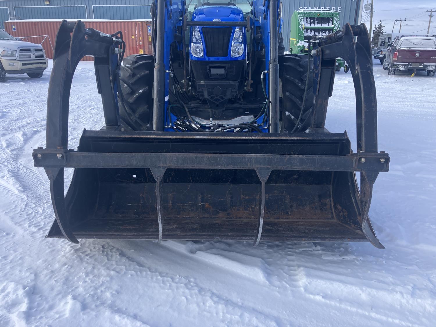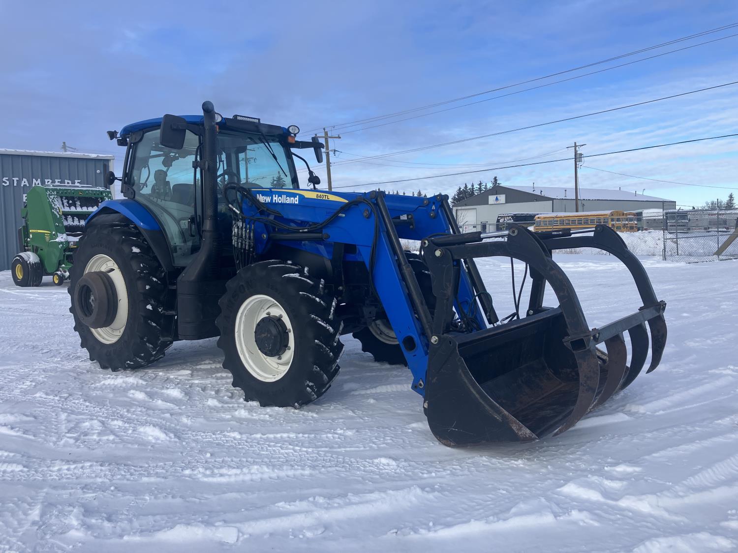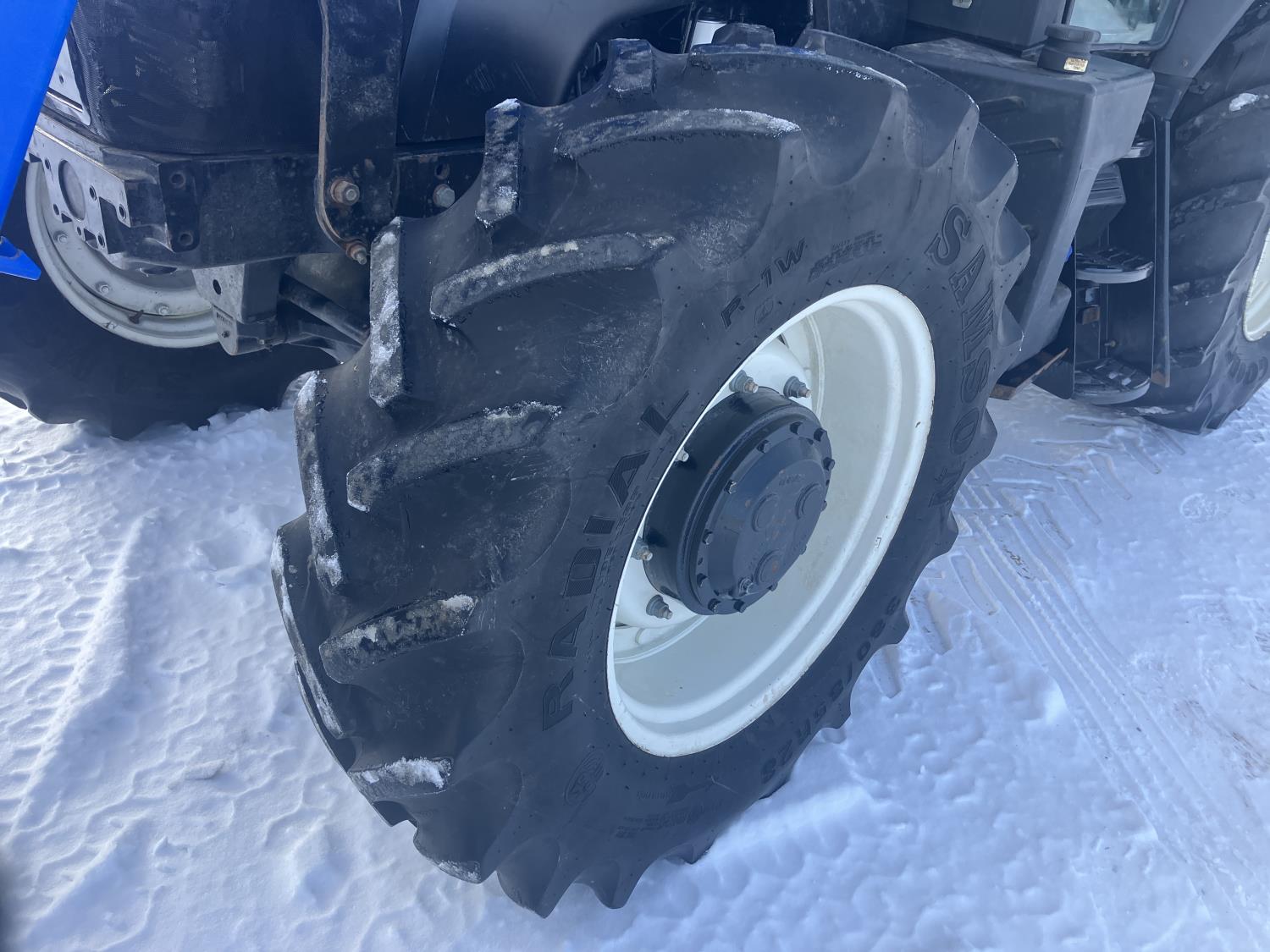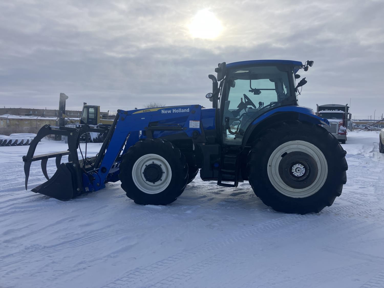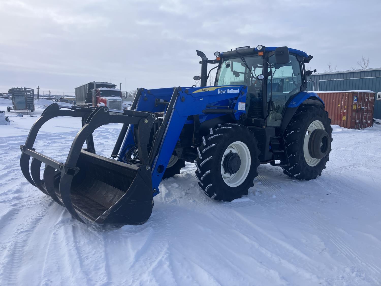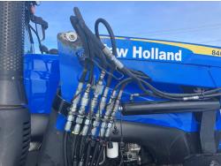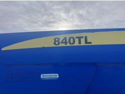 New Holland 840TL loader, grapple, bale forks, mid mount hydraulic connection, FPT 6.7 6 cylinder 165 HP, engine, DEF deleted, 16 speed partial power shift transmission, cab, left hand reverser, rear differential lock, A/C, air ride seat, buddy seat, Sun roof, front and rear window shades, AM/FM Bluetooth integrated radio, engine and transmission block heaters, L&R mirrors, tilt and telescopic steering wheel, rear flood work lights, 540/1000 PTO, 3 point hitch, 3 point hitch exterior control, 3 rear hydraulic outlets, 380/85R28 front tires, 460/85R38 rear tires