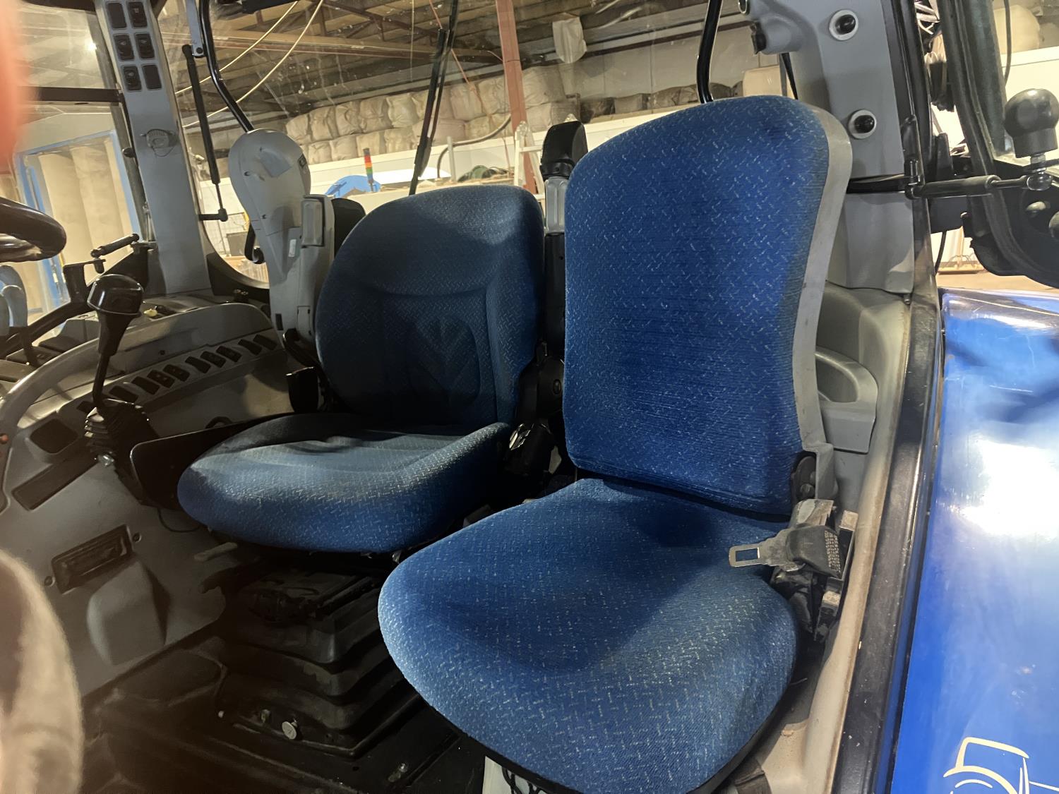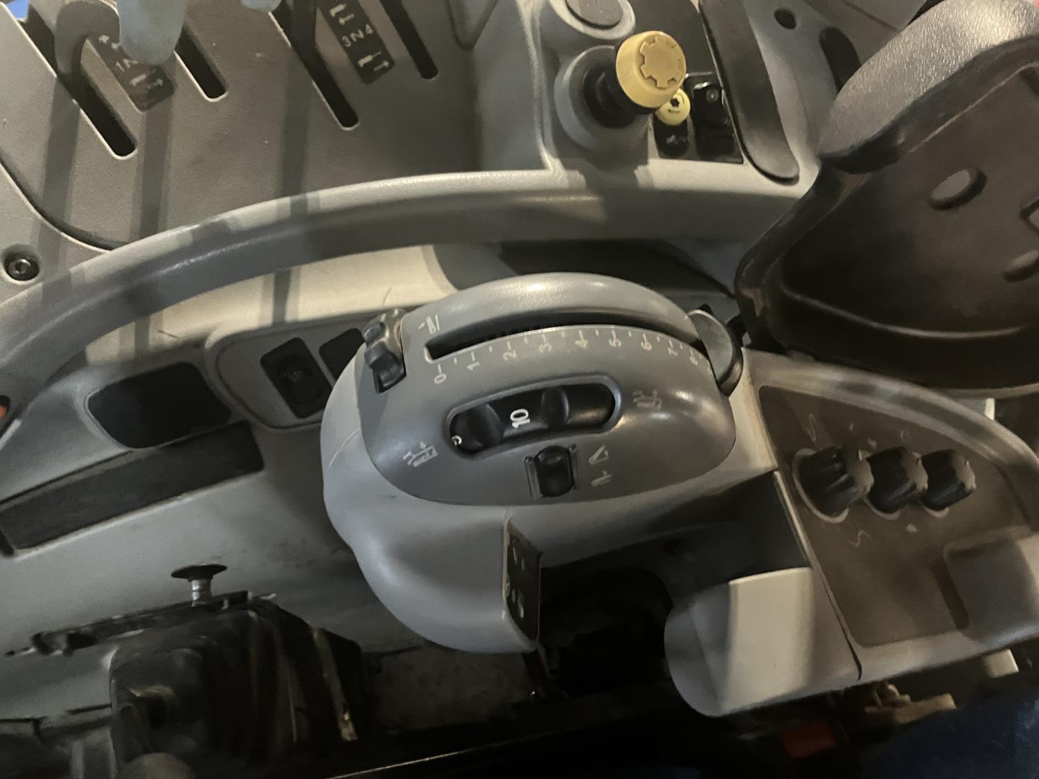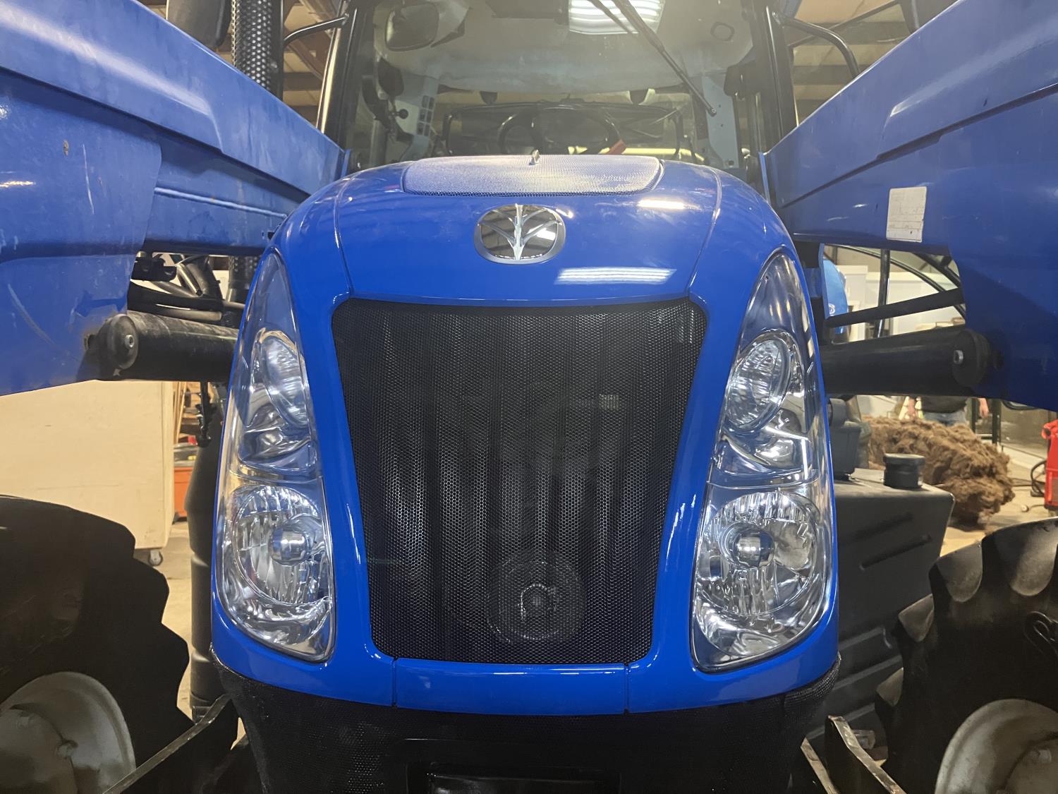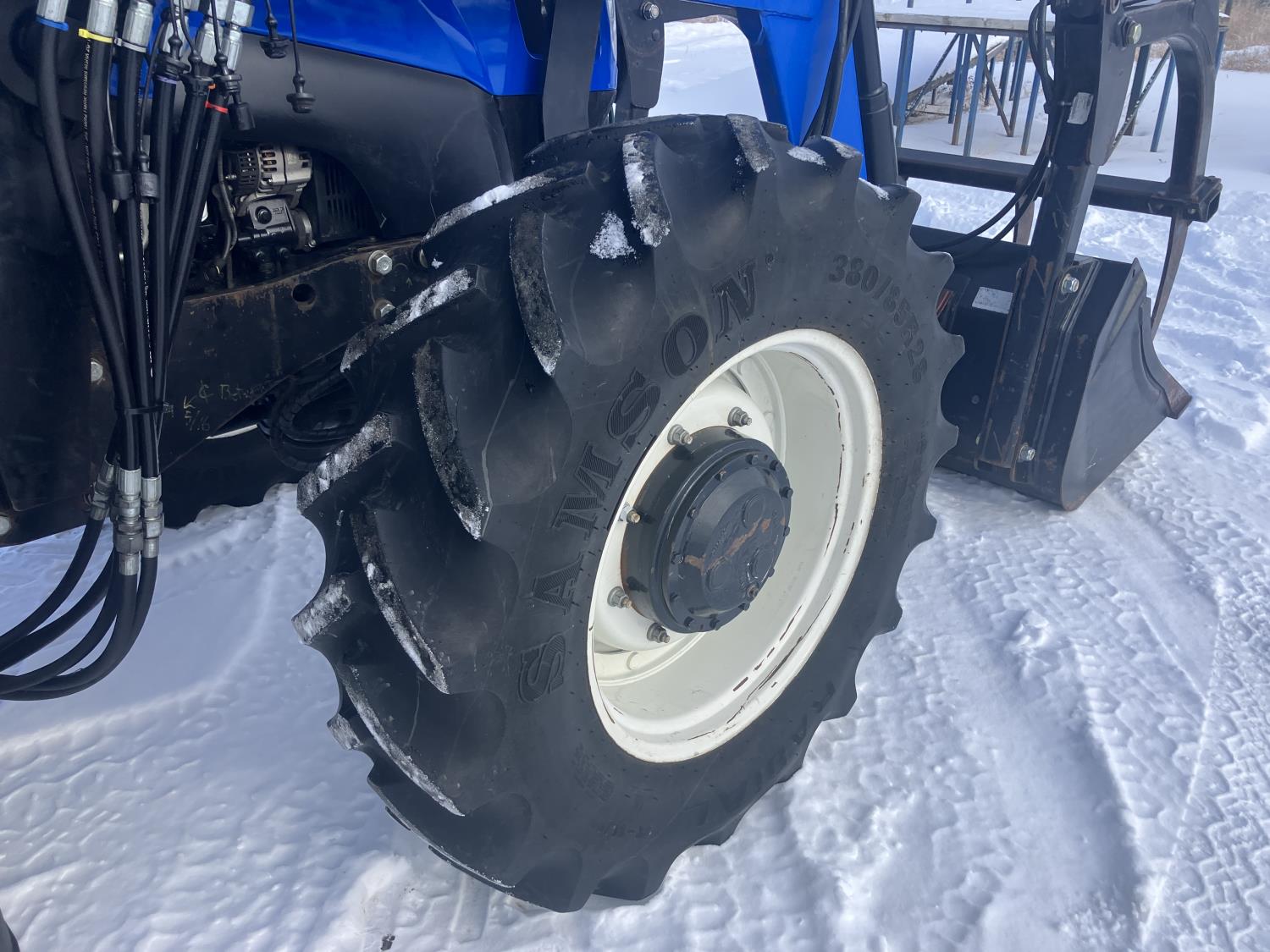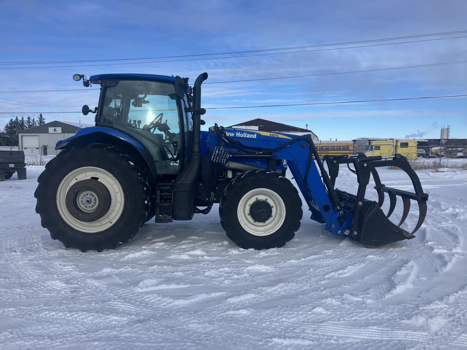 New Holland 840TL loader, grapple, bale forks, mid mount hydraulic connection, FPT 6.7 6 cylinder 165 HP, engine, DEF deleted, 16 speed partial power shift transmission, cab, left hand reverser, rear differential lock, A/C, air ride seat, buddy seat, Sun roof, front and rear window shades, AM/FM Bluetooth integrated radio, engine and transmission block heaters, L&R mirrors, tilt and telescopic steering wheel, rear flood work lights, 540/1000 PTO, 3 point hitch, 3 point hitch exterior control, 3 rear hydraulic outlets, 380/85R28 front tires, 460/85R38 rear tires