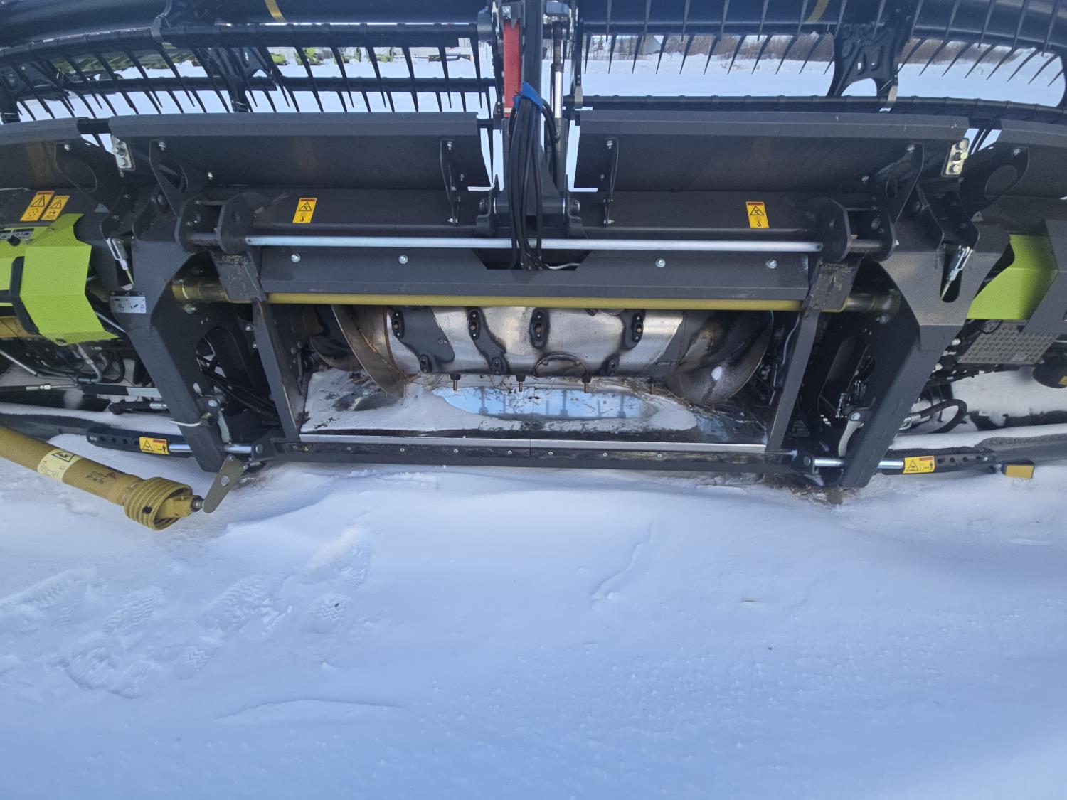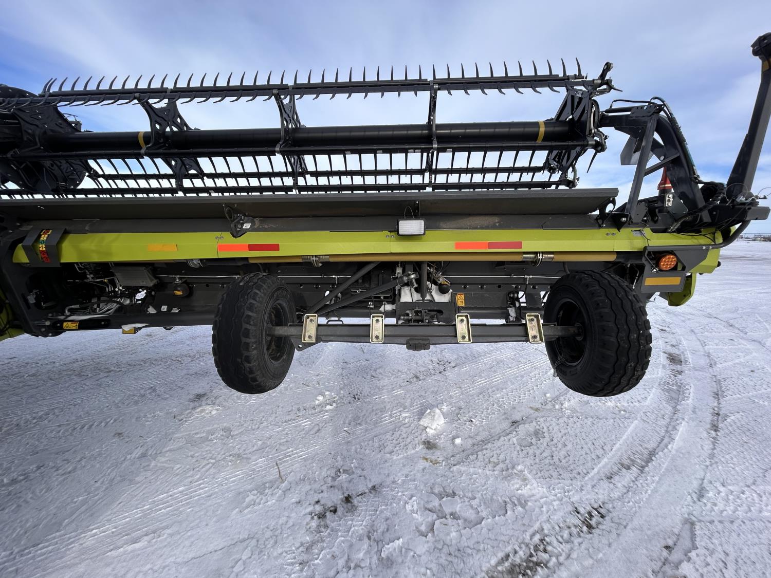 pickup reel, fore & aft, top cross auger, integrated transport, split reel, gauge wheels, canola knife, Auto guidance with 6 sensors, LED light package, reel speed and auto belt speed, stone deflector plate, 280/75R15.3 tires