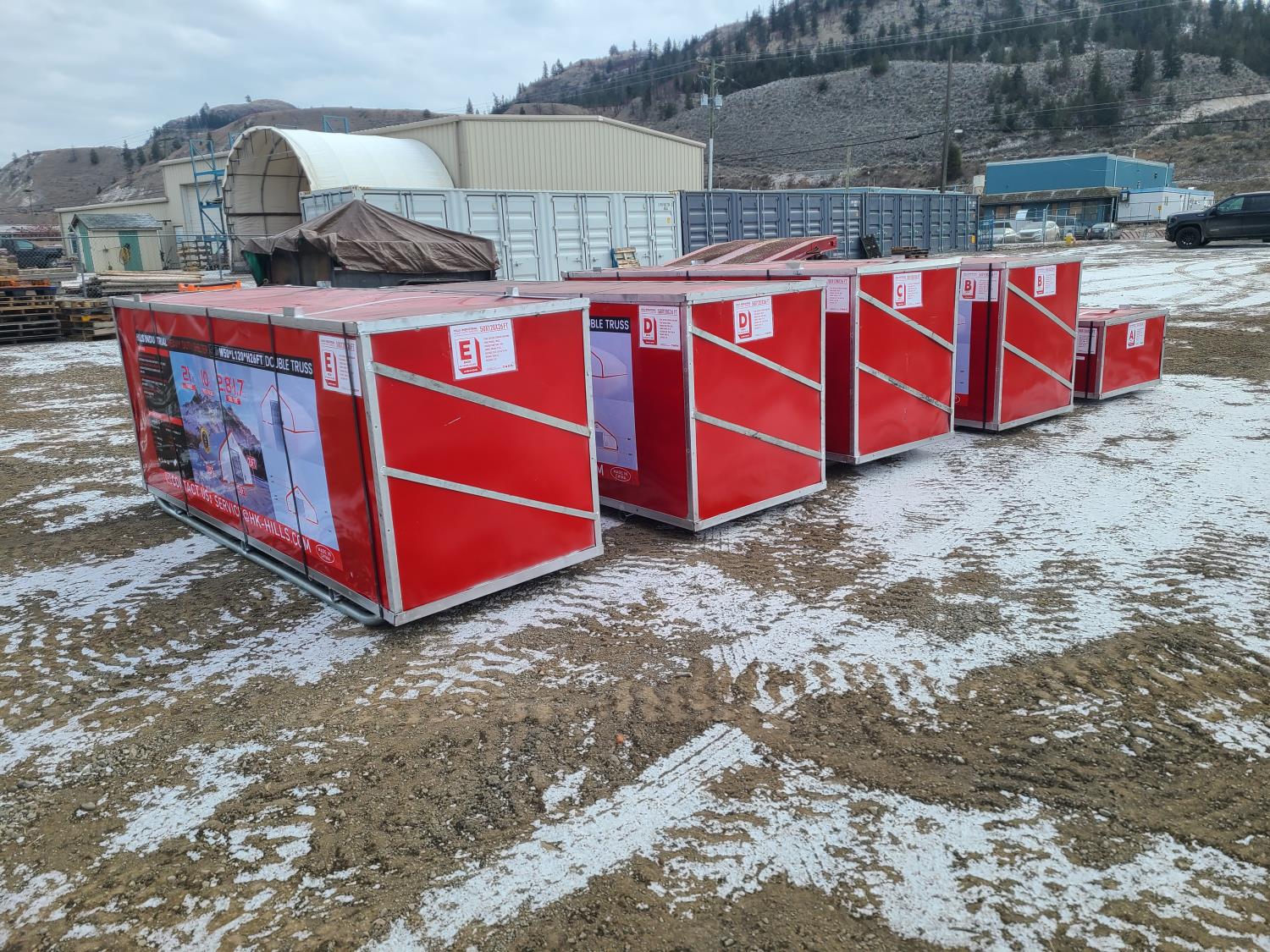 Double truss, 10 ft truss spacing, 21 oz PVC fabric, peak ceiling, 2.4 inch tubing, total weight of five crates 12,103 lb