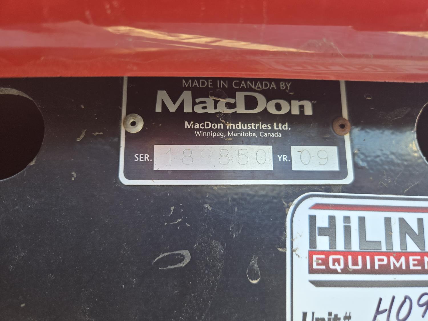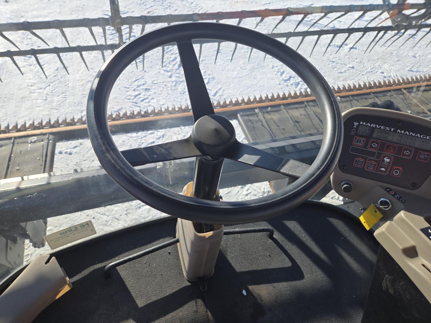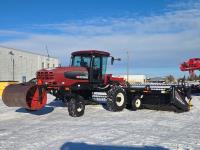 2009 MacDon D60-S center delivery rigid draper header, batt reel, single knife, variable speed reel, fore & aft, gauge wheels, skid plates, crop dividers, swath roller, (2) Roto shear crop cutters, A/C, radio, upgraded stereo, air ride seat, buddy seat, monitor, 18.4-26 front tires