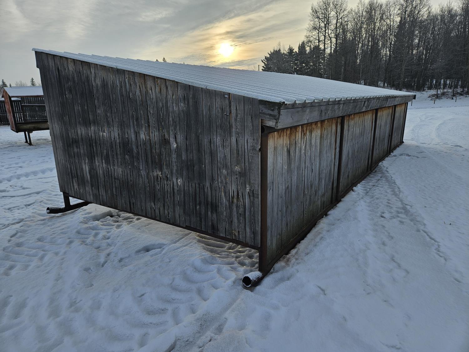 2-7/8 pipe frame, wood exterior, metal cladding roof, on pipe skids