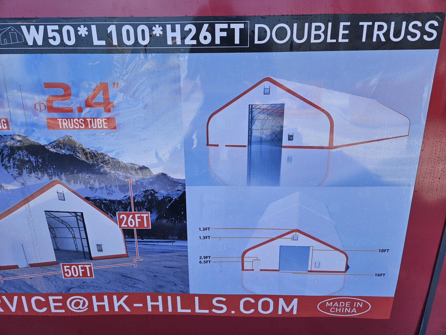 double truss, 21 oz PVC fabric, 10 ft truss spacing, 2.4 inch tubing, peak ceiling, appx weight of package 4940 kg