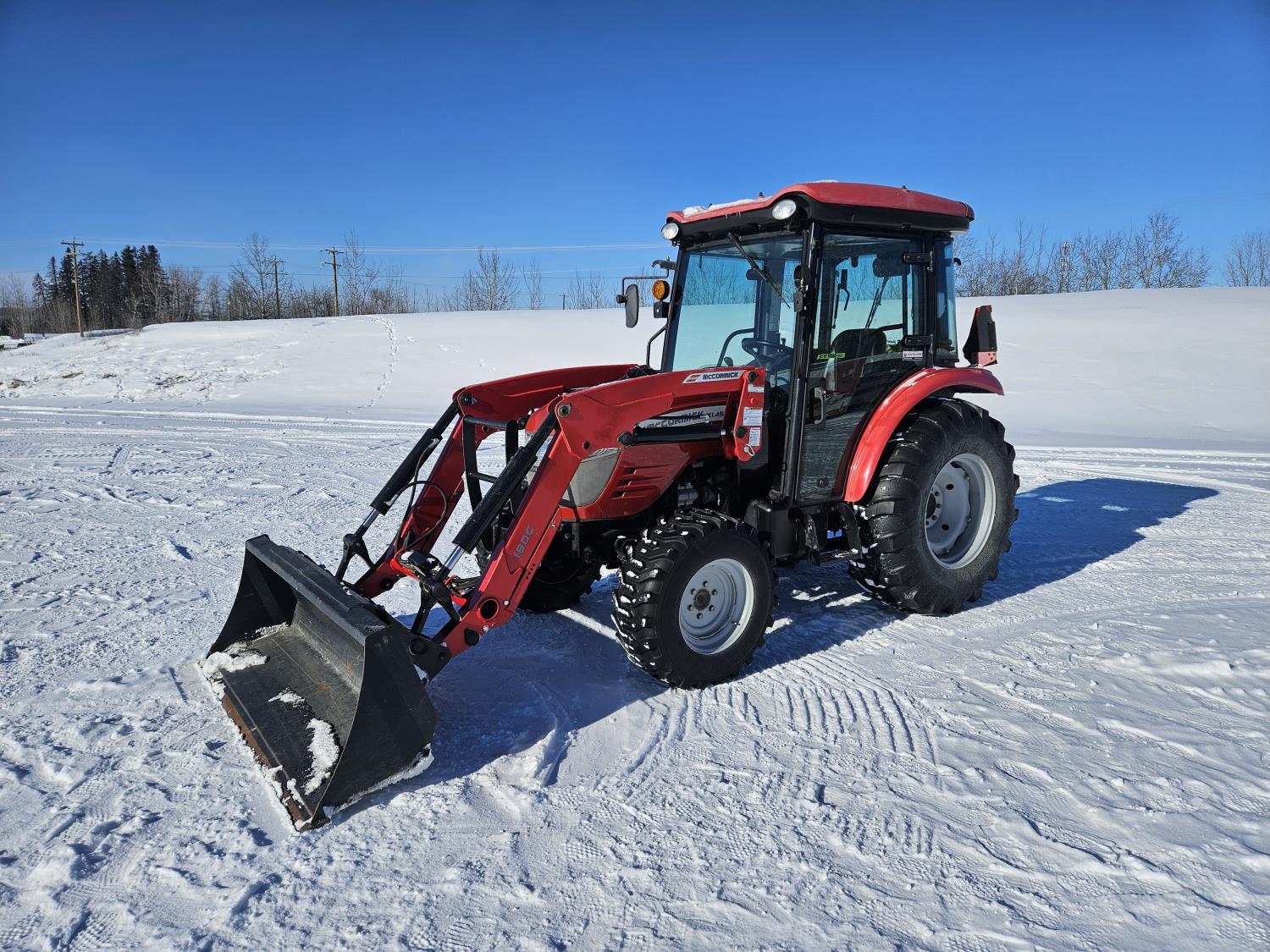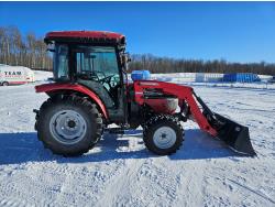 McCormick 180 C loader, Q/A, 72 inch bucket, Kukje 2.3 L 4 cylinder 47 HP, diesel engine, 12 speed fully synchronized transmission, cab, left hand reverser, joystick, A/C, radio, 540 PTO, 3 point hitch, 2 rear hydraulic outlets, 12-16.5 front tires, 16.9-24 rear tires