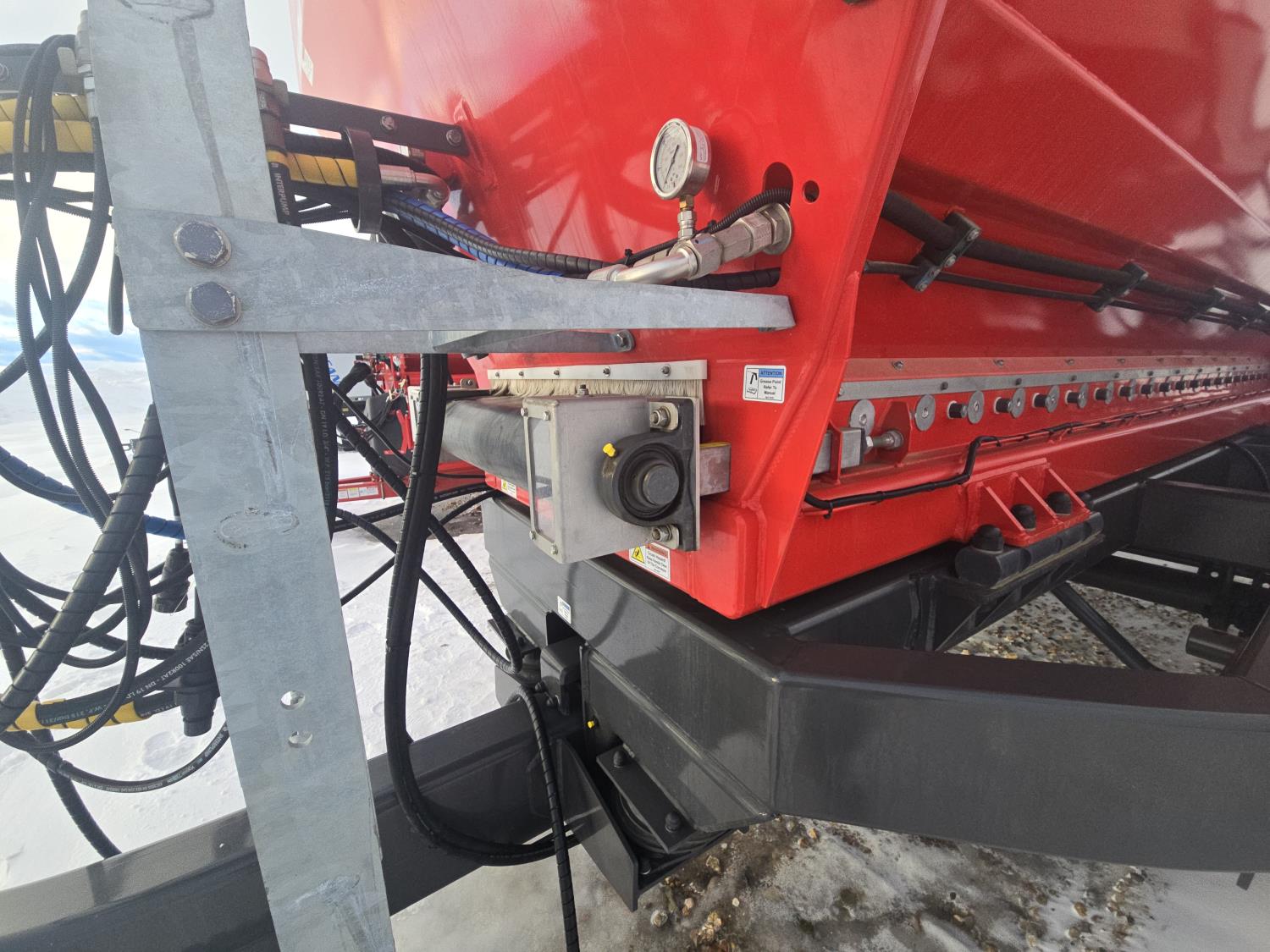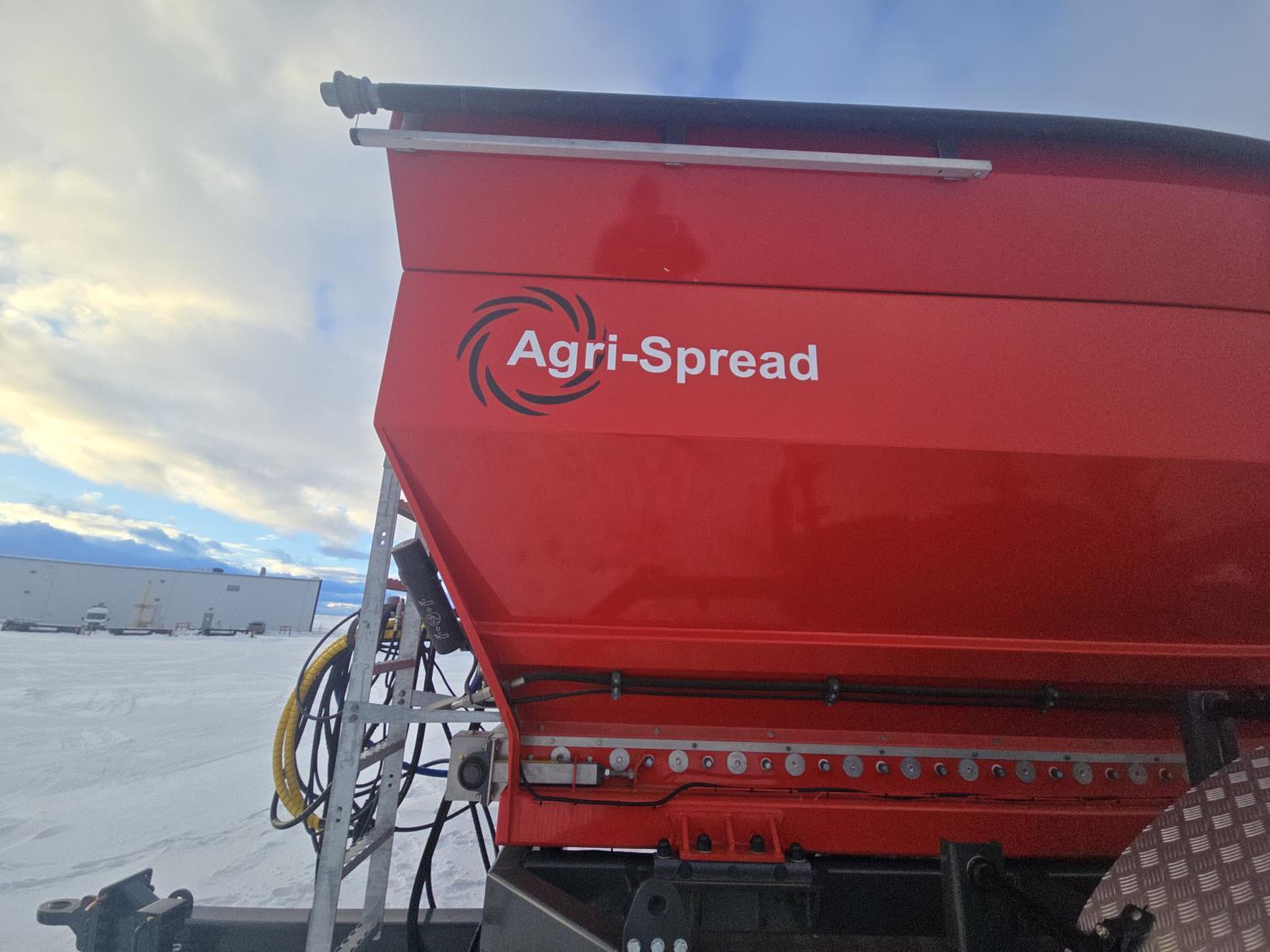 hydraulic drive, 120 ft spread width, double spinners, roll tarp, dampened drawbar, mud guards, hydraulic brakes, hopper screens, spring suspension, 710/50R26.5 tires