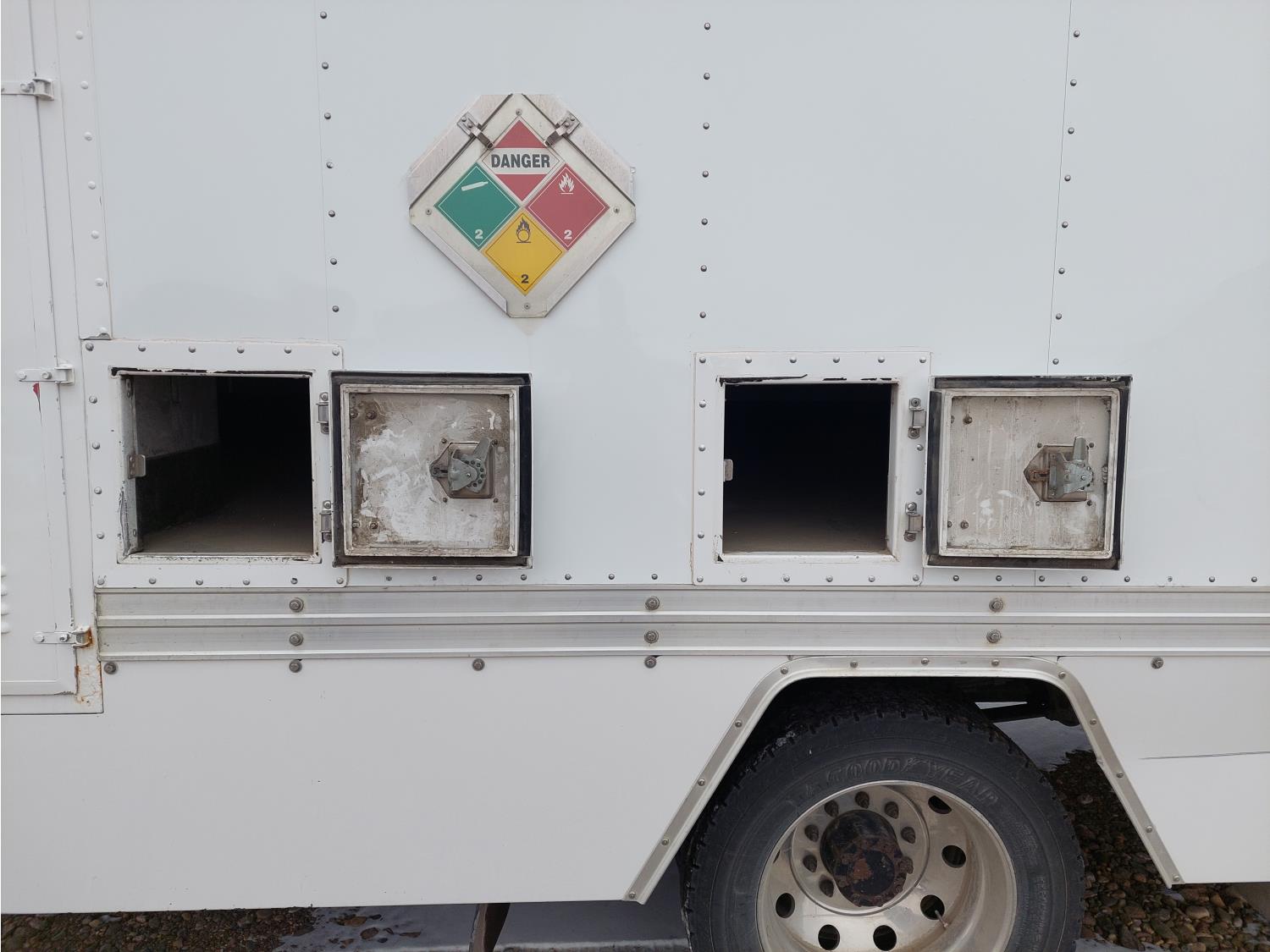MaxxForce 6.4 L V8 engine, DEF required, engine brake, electric engine block heater, Allison ECON automatic transmission, A/C, P/W, P/L, cruise control, leather interior, air ride driver seat, 225 inch L x 102 inch W x 86 inch T box, 40 inch W x 78 inch T door, spring suspension, 7,000 lb front axle, 13,500 lb rear axles, 213 inch WB, all aluminum wheels, 225/70R19.5 tires
